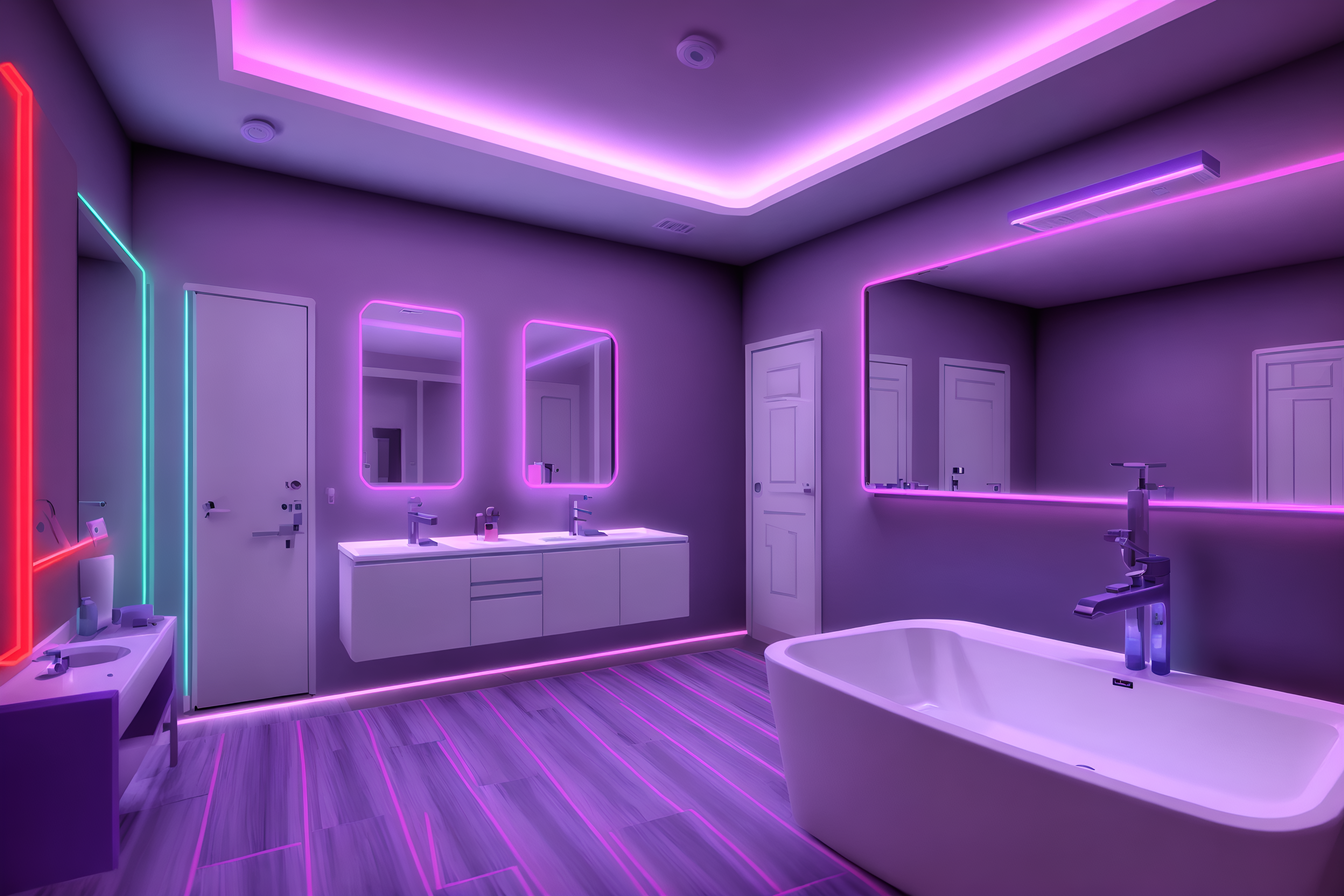 photo from pinterest of gaming room-style interior designed (bathroom interior) with bathtub and bath towel and bathroom cabinet and bathroom sink with faucet and mirror and bath rail and toilet seat and plant. . with purple, red and blue fade light and speakers and gaming chair and neon letters on wall and at night and multiple displays and neon lights and purple and red lights. . cinematic photo, highly detailed, cinematic lighting, ultra-detailed, ultrarealistic, photorealism, 8k. trending on pinterest. gaming room interior design style. masterpiece, cinematic light, ultrarealistic+, photorealistic+, 8k, raw photo, realistic, sharp focus on eyes, (symmetrical eyes), (intact eyes), hyperrealistic, highest quality, best quality, , highly detailed, masterpiece, best quality, extremely detailed 8k wallpaper, masterpiece, best quality, ultra-detailed, best shadow, detailed background, detailed face, detailed eyes, high contrast, best illumination, detailed face, dulux, caustic, dynamic angle, detailed glow. dramatic lighting. highly detailed, insanely detailed hair, symmetrical, intricate details, professionally retouched, 8k high definition. strong bokeh. award winning photo.