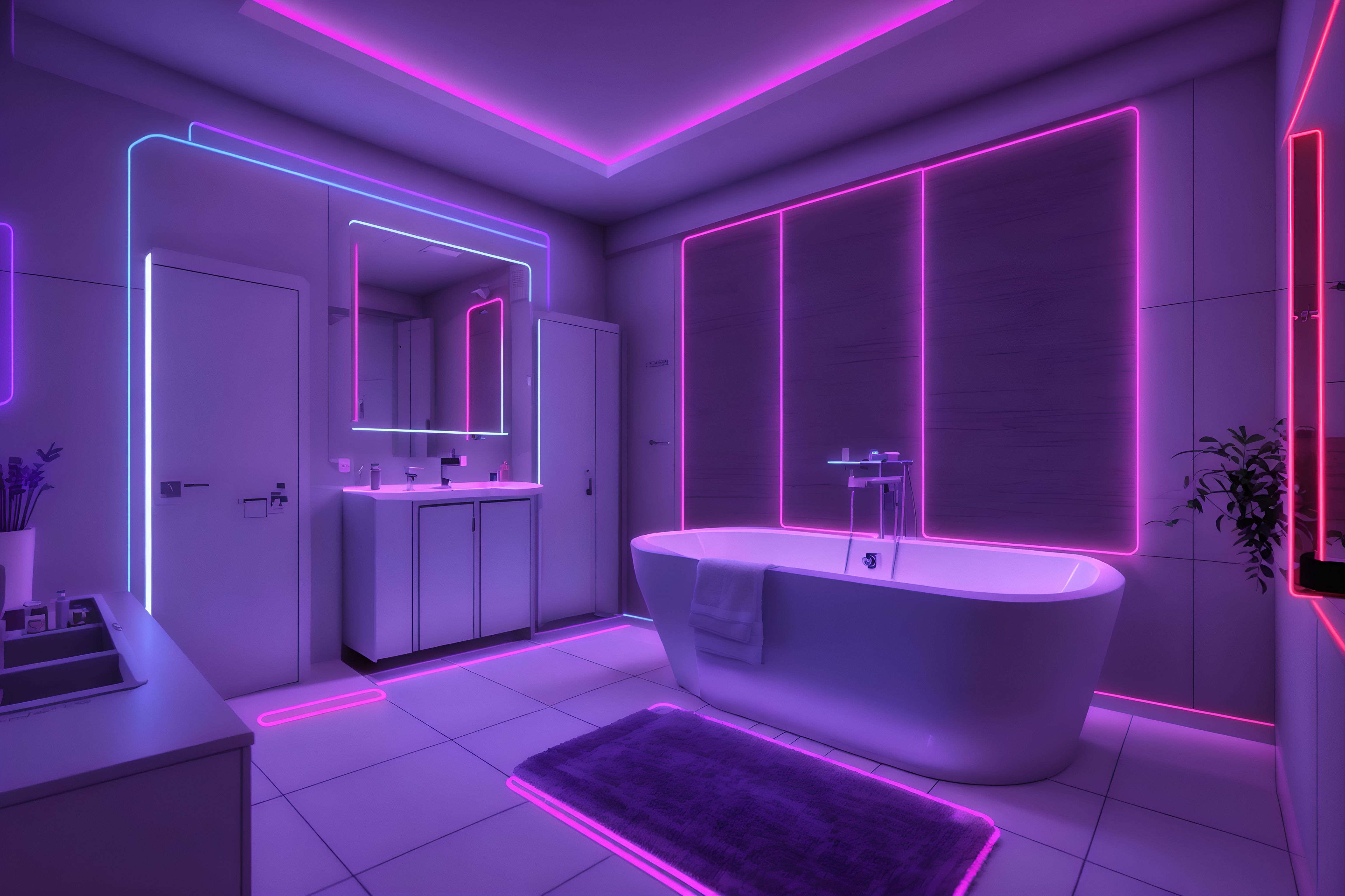 photo from pinterest of gaming room-style interior designed (bathroom interior) with bathtub and bath towel and bathroom cabinet and bathroom sink with faucet and mirror and bath rail and toilet seat and plant. . with purple, red and blue fade light and speakers and gaming chair and neon letters on wall and at night and multiple displays and neon lights and purple and red lights. . cinematic photo, highly detailed, cinematic lighting, ultra-detailed, ultrarealistic, photorealism, 8k. trending on pinterest. gaming room interior design style. masterpiece, cinematic light, ultrarealistic+, photorealistic+, 8k, raw photo, realistic, sharp focus on eyes, (symmetrical eyes), (intact eyes), hyperrealistic, highest quality, best quality, , highly detailed, masterpiece, best quality, extremely detailed 8k wallpaper, masterpiece, best quality, ultra-detailed, best shadow, detailed background, detailed face, detailed eyes, high contrast, best illumination, detailed face, dulux, caustic, dynamic angle, detailed glow. dramatic lighting. highly detailed, insanely detailed hair, symmetrical, intricate details, professionally retouched, 8k high definition. strong bokeh. award winning photo.