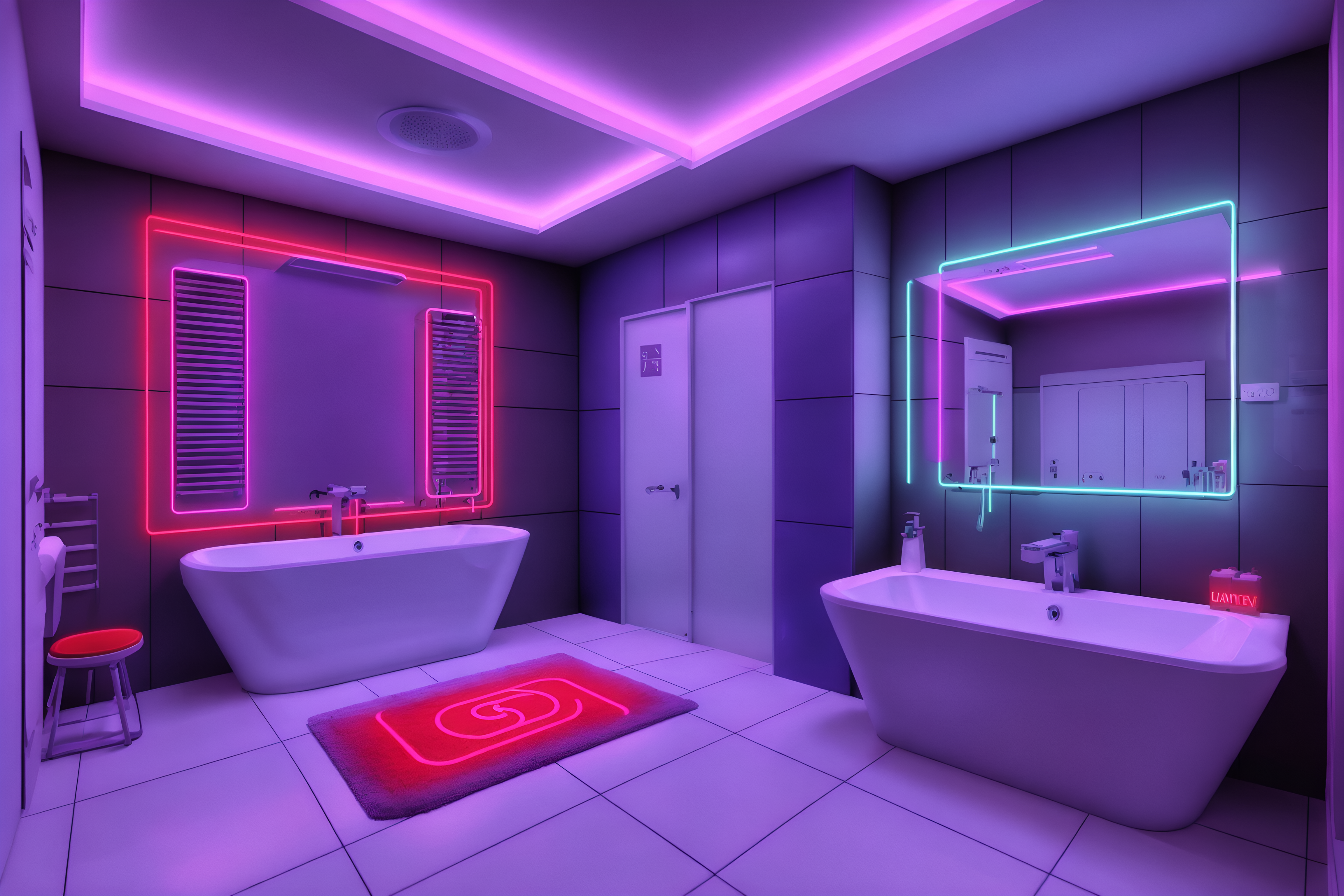 photo from pinterest of gaming room-style interior designed (bathroom interior) with bathtub and bath towel and bathroom cabinet and bathroom sink with faucet and mirror and bath rail and toilet seat and plant. . with purple, red and blue fade light and speakers and gaming chair and neon letters on wall and at night and multiple displays and neon lights and purple and red lights. . cinematic photo, highly detailed, cinematic lighting, ultra-detailed, ultrarealistic, photorealism, 8k. trending on pinterest. gaming room interior design style. masterpiece, cinematic light, ultrarealistic+, photorealistic+, 8k, raw photo, realistic, sharp focus on eyes, (symmetrical eyes), (intact eyes), hyperrealistic, highest quality, best quality, , highly detailed, masterpiece, best quality, extremely detailed 8k wallpaper, masterpiece, best quality, ultra-detailed, best shadow, detailed background, detailed face, detailed eyes, high contrast, best illumination, detailed face, dulux, caustic, dynamic angle, detailed glow. dramatic lighting. highly detailed, insanely detailed hair, symmetrical, intricate details, professionally retouched, 8k high definition. strong bokeh. award winning photo.