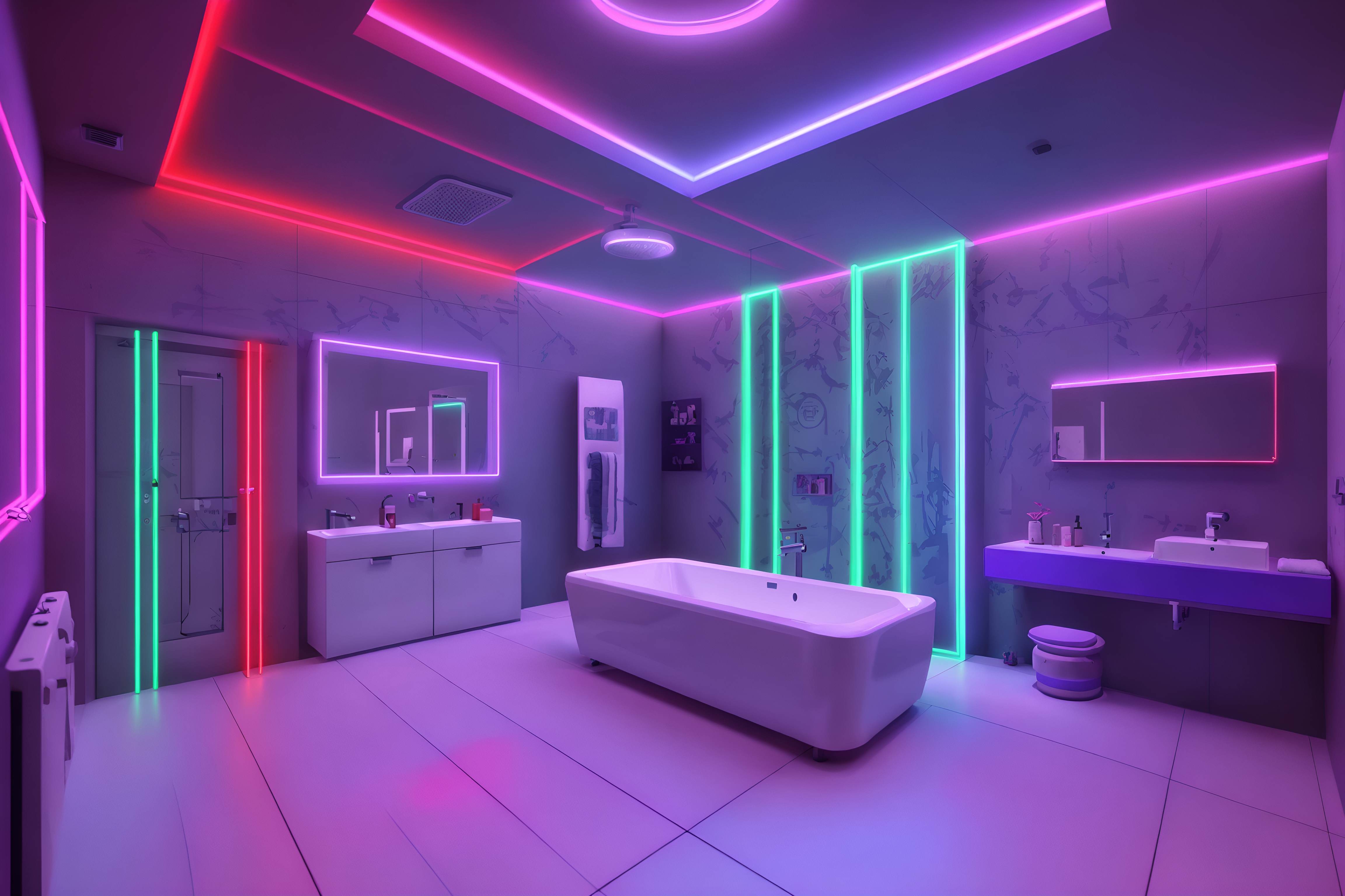 photo from pinterest of gaming room-style interior designed (bathroom interior) with bathtub and bath towel and bathroom cabinet and bathroom sink with faucet and mirror and bath rail and toilet seat and plant. . with purple, red and blue fade light and speakers and gaming chair and neon letters on wall and at night and multiple displays and neon lights and purple and red lights. . cinematic photo, highly detailed, cinematic lighting, ultra-detailed, ultrarealistic, photorealism, 8k. trending on pinterest. gaming room interior design style. masterpiece, cinematic light, ultrarealistic+, photorealistic+, 8k, raw photo, realistic, sharp focus on eyes, (symmetrical eyes), (intact eyes), hyperrealistic, highest quality, best quality, , highly detailed, masterpiece, best quality, extremely detailed 8k wallpaper, masterpiece, best quality, ultra-detailed, best shadow, detailed background, detailed face, detailed eyes, high contrast, best illumination, detailed face, dulux, caustic, dynamic angle, detailed glow. dramatic lighting. highly detailed, insanely detailed hair, symmetrical, intricate details, professionally retouched, 8k high definition. strong bokeh. award winning photo.