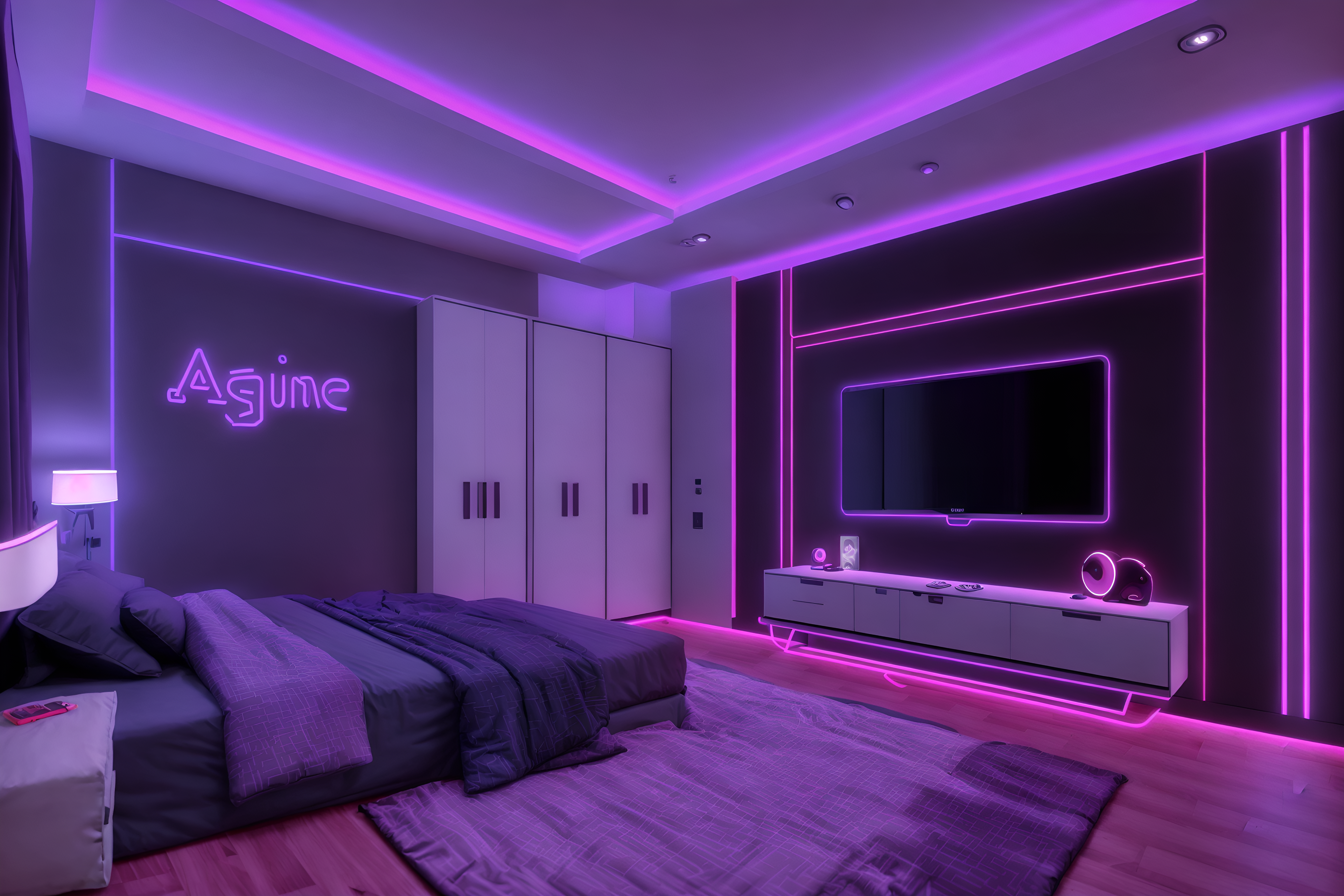 photo from pinterest of gaming room-style interior designed (bedroom interior) with storage bench or ottoman and accent chair and bed and bedside table or night stand and dresser closet and night light and mirror and headboard. . with purple and red lights and gaming chair and at night and purple, red and blue fade light and dark walls and neon letters on wall and neon lights and speakers. . cinematic photo, highly detailed, cinematic lighting, ultra-detailed, ultrarealistic, photorealism, 8k. trending on pinterest. gaming room interior design style. masterpiece, cinematic light, ultrarealistic+, photorealistic+, 8k, raw photo, realistic, sharp focus on eyes, (symmetrical eyes), (intact eyes), hyperrealistic, highest quality, best quality, , highly detailed, masterpiece, best quality, extremely detailed 8k wallpaper, masterpiece, best quality, ultra-detailed, best shadow, detailed background, detailed face, detailed eyes, high contrast, best illumination, detailed face, dulux, caustic, dynamic angle, detailed glow. dramatic lighting. highly detailed, insanely detailed hair, symmetrical, intricate details, professionally retouched, 8k high definition. strong bokeh. award winning photo.