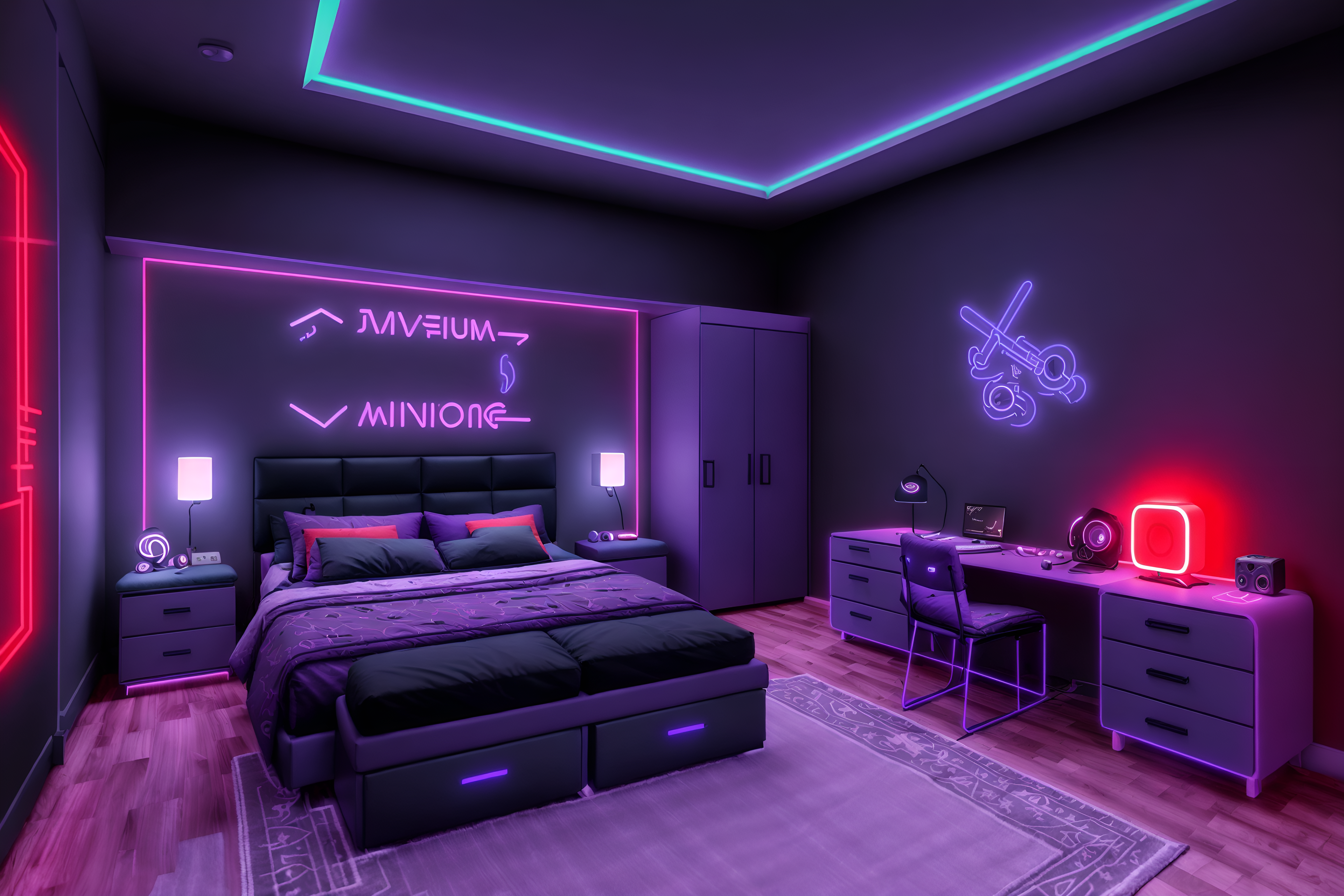 photo from pinterest of gaming room-style interior designed (bedroom interior) with storage bench or ottoman and accent chair and bed and bedside table or night stand and dresser closet and night light and mirror and headboard. . with purple and red lights and gaming chair and at night and purple, red and blue fade light and dark walls and neon letters on wall and neon lights and speakers. . cinematic photo, highly detailed, cinematic lighting, ultra-detailed, ultrarealistic, photorealism, 8k. trending on pinterest. gaming room interior design style. masterpiece, cinematic light, ultrarealistic+, photorealistic+, 8k, raw photo, realistic, sharp focus on eyes, (symmetrical eyes), (intact eyes), hyperrealistic, highest quality, best quality, , highly detailed, masterpiece, best quality, extremely detailed 8k wallpaper, masterpiece, best quality, ultra-detailed, best shadow, detailed background, detailed face, detailed eyes, high contrast, best illumination, detailed face, dulux, caustic, dynamic angle, detailed glow. dramatic lighting. highly detailed, insanely detailed hair, symmetrical, intricate details, professionally retouched, 8k high definition. strong bokeh. award winning photo.
