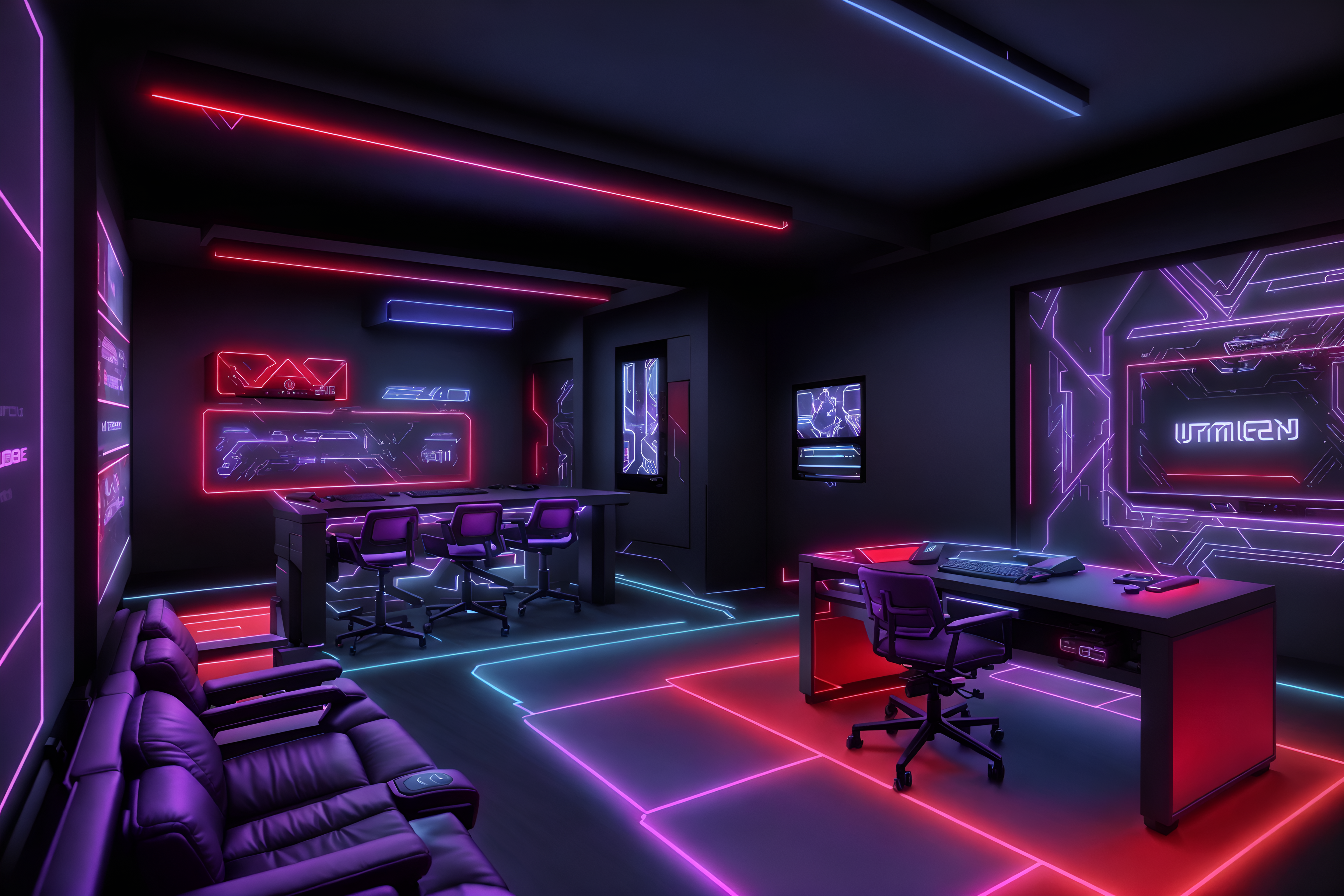 photo from pinterest of gaming room-style interior designed (clothing store interior) . with purple, red and blue fade light and computer desk with computer displays and keyboard and speakers and dark walls and gaming chair and multiple displays and neon lights and purple and red lights. . cinematic photo, highly detailed, cinematic lighting, ultra-detailed, ultrarealistic, photorealism, 8k. trending on pinterest. gaming room interior design style. masterpiece, cinematic light, ultrarealistic+, photorealistic+, 8k, raw photo, realistic, sharp focus on eyes, (symmetrical eyes), (intact eyes), hyperrealistic, highest quality, best quality, , highly detailed, masterpiece, best quality, extremely detailed 8k wallpaper, masterpiece, best quality, ultra-detailed, best shadow, detailed background, detailed face, detailed eyes, high contrast, best illumination, detailed face, dulux, caustic, dynamic angle, detailed glow. dramatic lighting. highly detailed, insanely detailed hair, symmetrical, intricate details, professionally retouched, 8k high definition. strong bokeh. award winning photo.