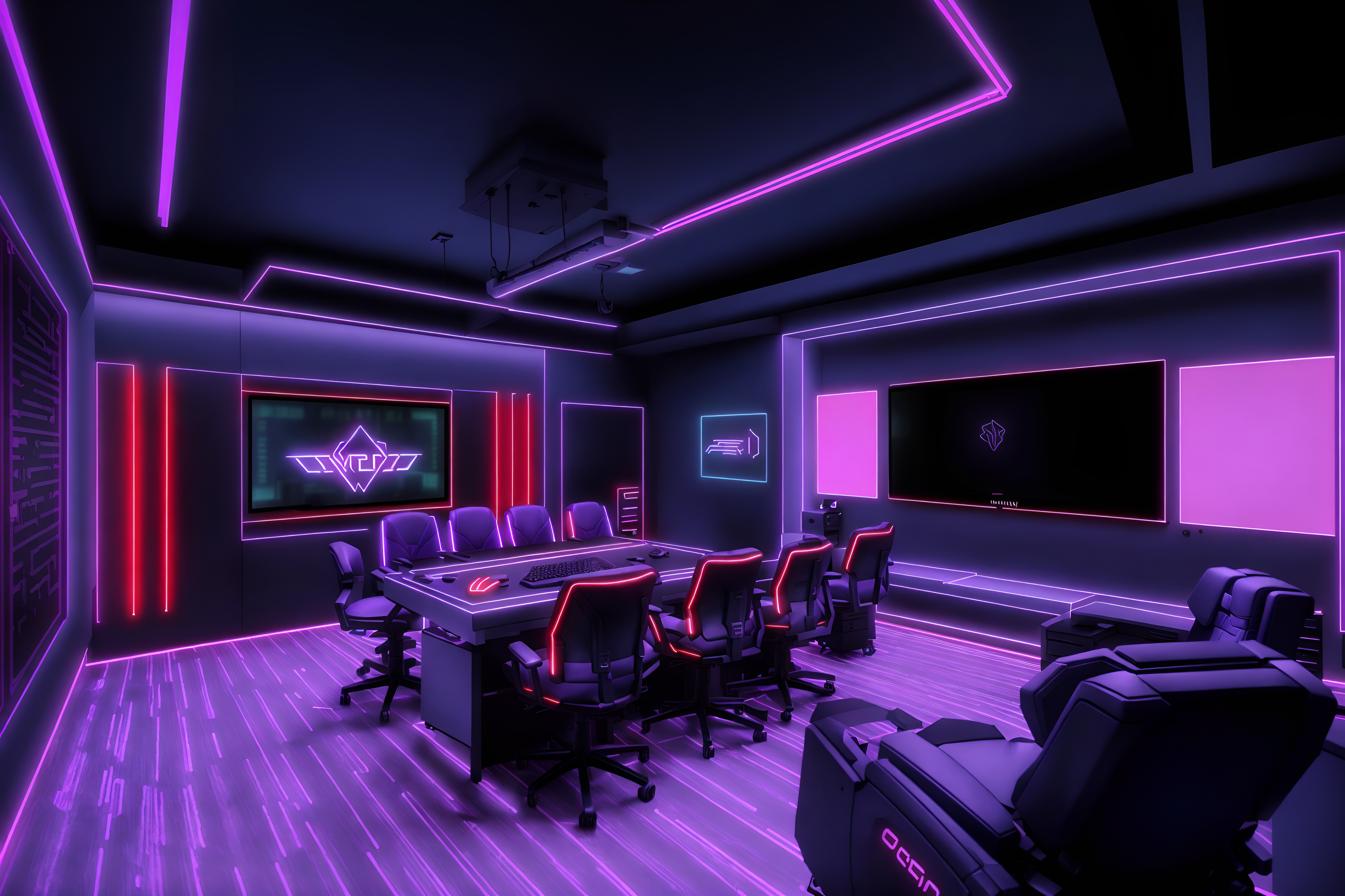 photo from pinterest of gaming room-style interior designed (clothing store interior) . with purple, red and blue fade light and computer desk with computer displays and keyboard and speakers and dark walls and gaming chair and multiple displays and neon lights and purple and red lights. . cinematic photo, highly detailed, cinematic lighting, ultra-detailed, ultrarealistic, photorealism, 8k. trending on pinterest. gaming room interior design style. masterpiece, cinematic light, ultrarealistic+, photorealistic+, 8k, raw photo, realistic, sharp focus on eyes, (symmetrical eyes), (intact eyes), hyperrealistic, highest quality, best quality, , highly detailed, masterpiece, best quality, extremely detailed 8k wallpaper, masterpiece, best quality, ultra-detailed, best shadow, detailed background, detailed face, detailed eyes, high contrast, best illumination, detailed face, dulux, caustic, dynamic angle, detailed glow. dramatic lighting. highly detailed, insanely detailed hair, symmetrical, intricate details, professionally retouched, 8k high definition. strong bokeh. award winning photo.