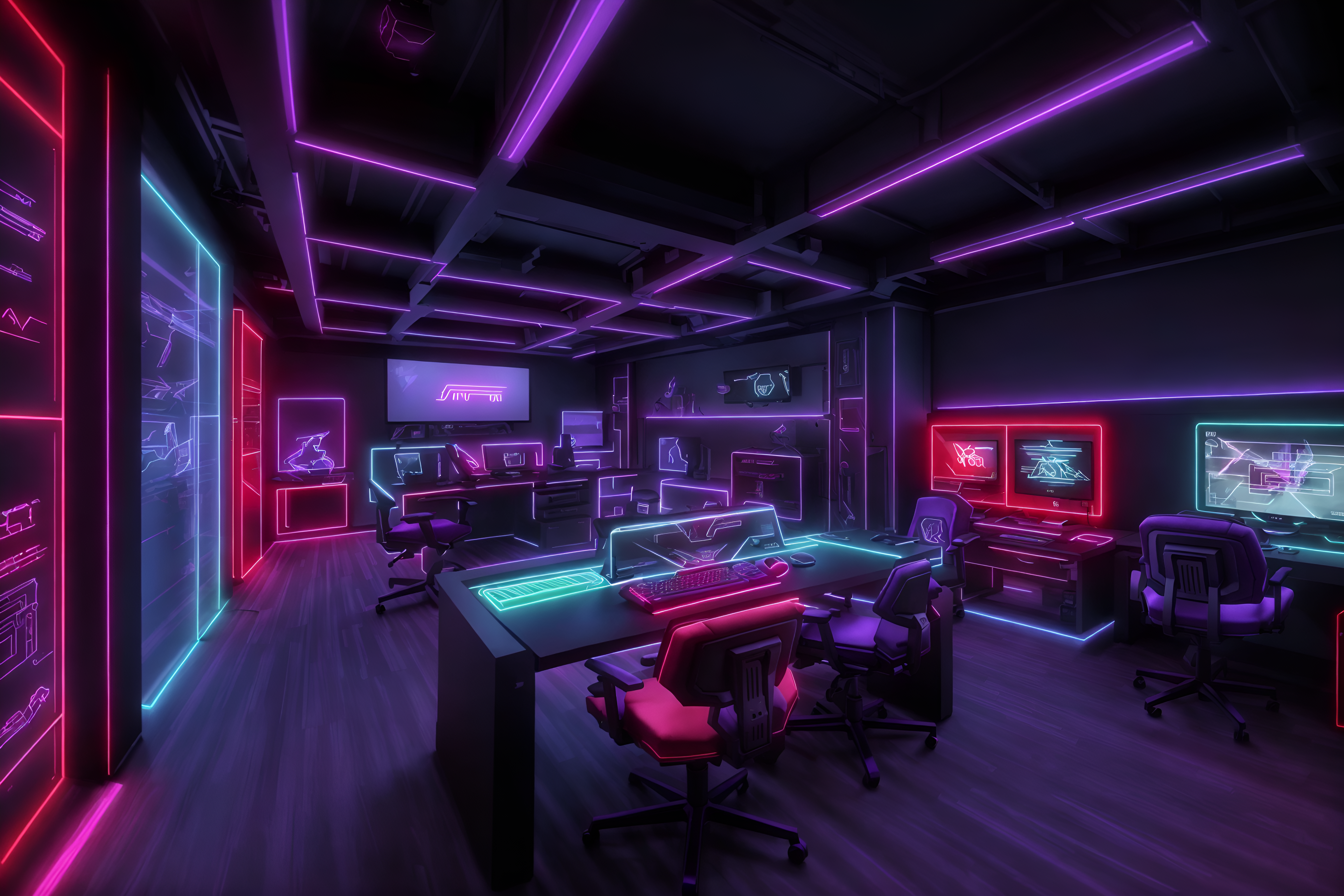 photo from pinterest of gaming room-style interior designed (clothing store interior) . with purple, red and blue fade light and computer desk with computer displays and keyboard and speakers and dark walls and gaming chair and multiple displays and neon lights and purple and red lights. . cinematic photo, highly detailed, cinematic lighting, ultra-detailed, ultrarealistic, photorealism, 8k. trending on pinterest. gaming room interior design style. masterpiece, cinematic light, ultrarealistic+, photorealistic+, 8k, raw photo, realistic, sharp focus on eyes, (symmetrical eyes), (intact eyes), hyperrealistic, highest quality, best quality, , highly detailed, masterpiece, best quality, extremely detailed 8k wallpaper, masterpiece, best quality, ultra-detailed, best shadow, detailed background, detailed face, detailed eyes, high contrast, best illumination, detailed face, dulux, caustic, dynamic angle, detailed glow. dramatic lighting. highly detailed, insanely detailed hair, symmetrical, intricate details, professionally retouched, 8k high definition. strong bokeh. award winning photo.