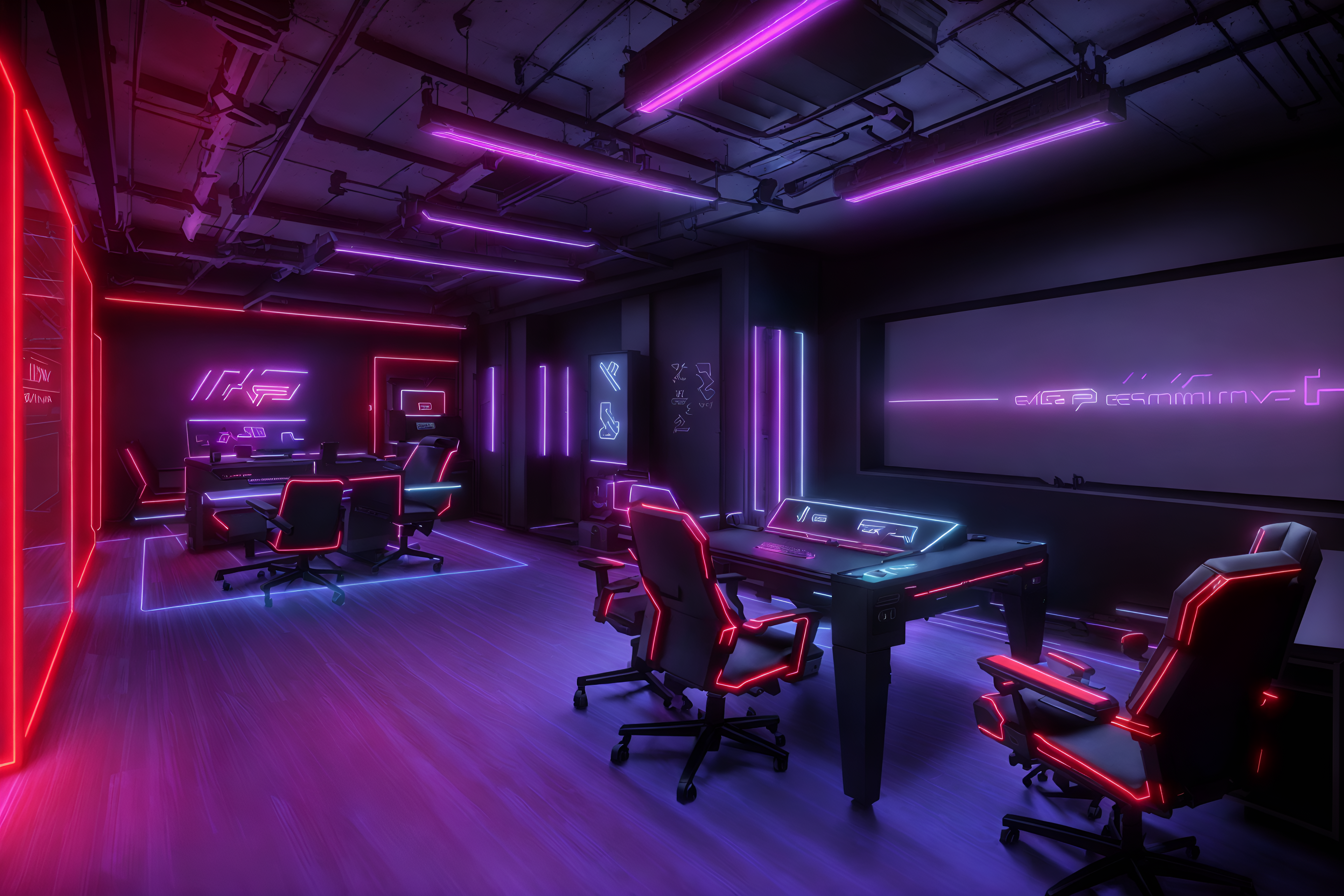 photo from pinterest of gaming room-style interior designed (clothing store interior) . with purple, red and blue fade light and computer desk with computer displays and keyboard and speakers and dark walls and gaming chair and multiple displays and neon lights and purple and red lights. . cinematic photo, highly detailed, cinematic lighting, ultra-detailed, ultrarealistic, photorealism, 8k. trending on pinterest. gaming room interior design style. masterpiece, cinematic light, ultrarealistic+, photorealistic+, 8k, raw photo, realistic, sharp focus on eyes, (symmetrical eyes), (intact eyes), hyperrealistic, highest quality, best quality, , highly detailed, masterpiece, best quality, extremely detailed 8k wallpaper, masterpiece, best quality, ultra-detailed, best shadow, detailed background, detailed face, detailed eyes, high contrast, best illumination, detailed face, dulux, caustic, dynamic angle, detailed glow. dramatic lighting. highly detailed, insanely detailed hair, symmetrical, intricate details, professionally retouched, 8k high definition. strong bokeh. award winning photo.