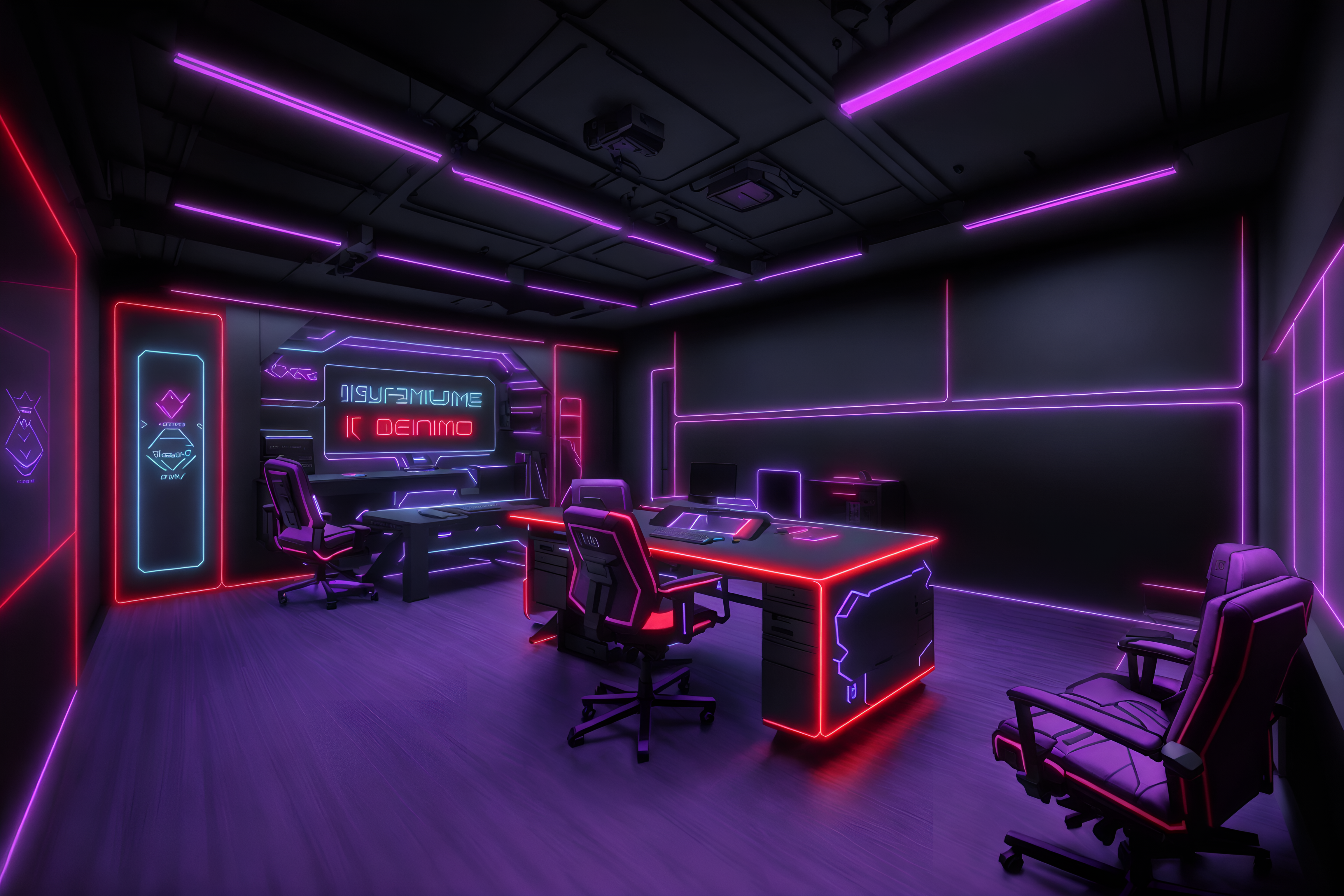 gaming room interiorsinterior decorate this temple with gaming room style. . . with meditation cushions and altar and prayer wheels and incense burner and sacred texts and bells and prayer flags and offerings bowl. . with dark walls and computer desk with computer displays and keyboard and purple, red and blue fade light and dark room and speakers and video game consoles and dark lit room and neon lights. . .interior decorate this parking lot with gaming room style. . . with white parking lot stripes and parking lot and ev charging stations and drive lanes and markings and landscaping elements and parking lot and parking spaces. . with dark walls and multiple displays and at night and dark lit room and neon letters on wall and neon lights and purple, red and blue fade light and purple and red lights. . .interior decorate this cinema with gaming room style. . . with concession stand and curtains and theater seats and movie screen and exit signs and popcorn machine and projector and surround sound speakers. . with multiple displays and dark walls and purple, red and blue fade light and neon letters on wall and speakers and gaming chair and neon lights and video game consoles. . .interior decorate this coffee shop with gaming room style. . . . with at night and gaming chair and multiple displays and dark walls and purple and red lights and speakers and video game consoles and dark room. . .interior decorate this bathroom with gaming room style. . . with bathroom cabinet and shower and waste basket and bathroom sink with faucet and bathtub and bath towel and toilet seat and plant. . with neon letters on wall and dark lit room and purple and red lights and video game consoles and dark walls and at night and speakers and purple, red and blue fade light. . .interior decorate this music stage with gaming room style. . . with guitar stands and backdrop and amplifiers and stage lights and sound mixing board and drum kit and stage monitors and cables. . with computer desk with computer displays and keyboard and multiple displays and dark walls and purple, red and blue fade light and gaming chair and video game consoles and neon lights and speakers. . .interior decorate this laundry room with gaming room style. . . with cabinet and laundry tub and area rug and floating shelves and clothes hamper and laundry jars and drying racks and washing machine. . with multiple displays and purple, red and blue fade light and video game consoles and dark lit room and neon lights and speakers and computer desk with computer displays and keyboard and dark room. . .interior decorate this cafeteria with gaming room style. . . with food service counter and menu boards and benches and dining tables and trash bins and utensils and chairs and beverage station. . with at night and neon letters on wall and purple, red and blue fade light and purple and red lights and video game consoles and gaming chair and dark room and dark walls. . .interior decorate this coworking space with gaming room style. . . with lounge chairs and office chairs and seating area with sofa and office desks and lounge chairs. . with purple and red lights and dark room and gaming chair and purple, red and blue fade light and dark lit room and neon lights and speakers and computer desk with computer displays and keyboard. . .