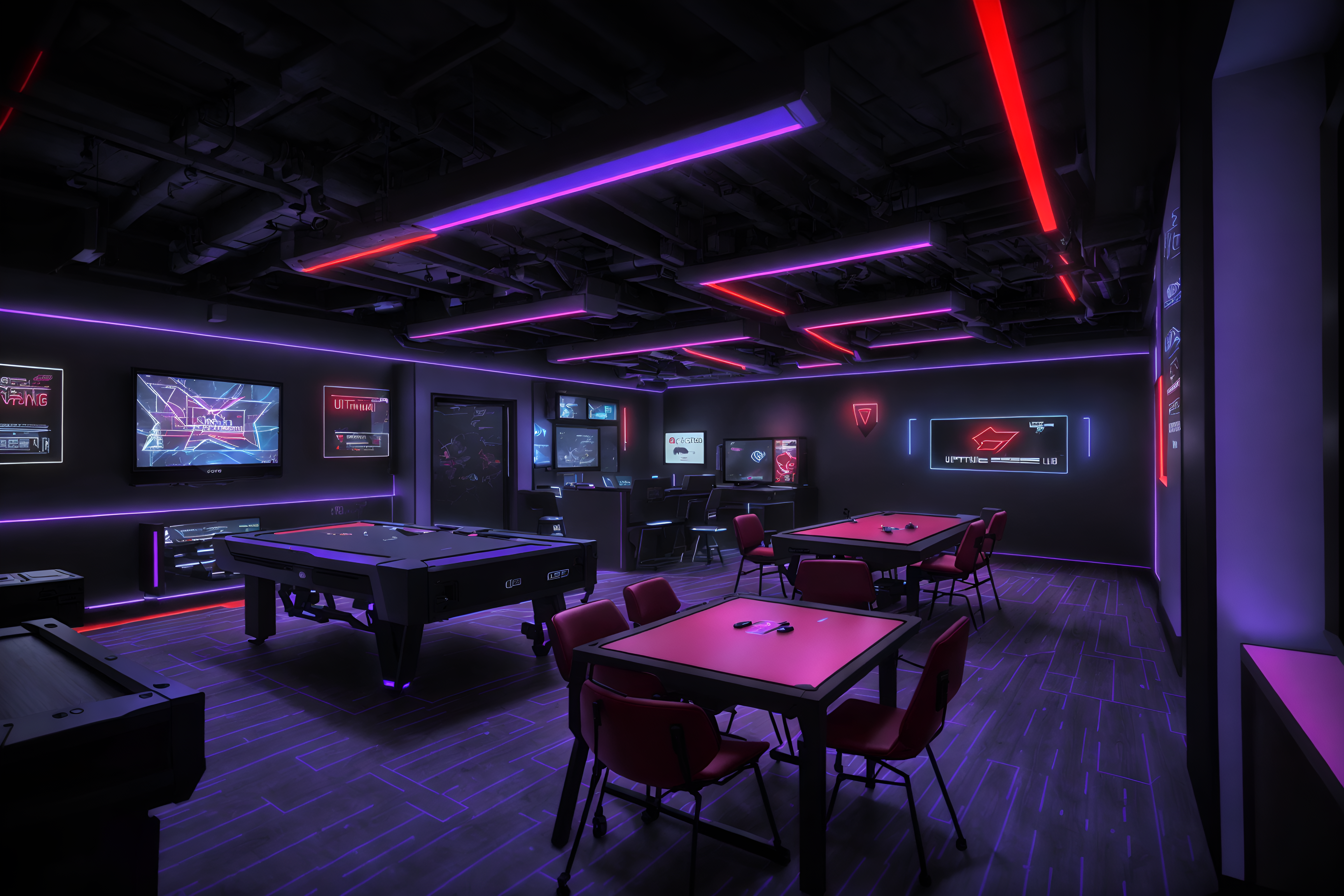 photo from pinterest of gaming room-style interior designed (coffee shop interior) . with purple, red and blue fade light and gaming chair and speakers and computer desk with computer displays and keyboard and dark walls and dark room and purple and red lights and multiple displays. . cinematic photo, highly detailed, cinematic lighting, ultra-detailed, ultrarealistic, photorealism, 8k. trending on pinterest. gaming room interior design style. masterpiece, cinematic light, ultrarealistic+, photorealistic+, 8k, raw photo, realistic, sharp focus on eyes, (symmetrical eyes), (intact eyes), hyperrealistic, highest quality, best quality, , highly detailed, masterpiece, best quality, extremely detailed 8k wallpaper, masterpiece, best quality, ultra-detailed, best shadow, detailed background, detailed face, detailed eyes, high contrast, best illumination, detailed face, dulux, caustic, dynamic angle, detailed glow. dramatic lighting. highly detailed, insanely detailed hair, symmetrical, intricate details, professionally retouched, 8k high definition. strong bokeh. award winning photo.