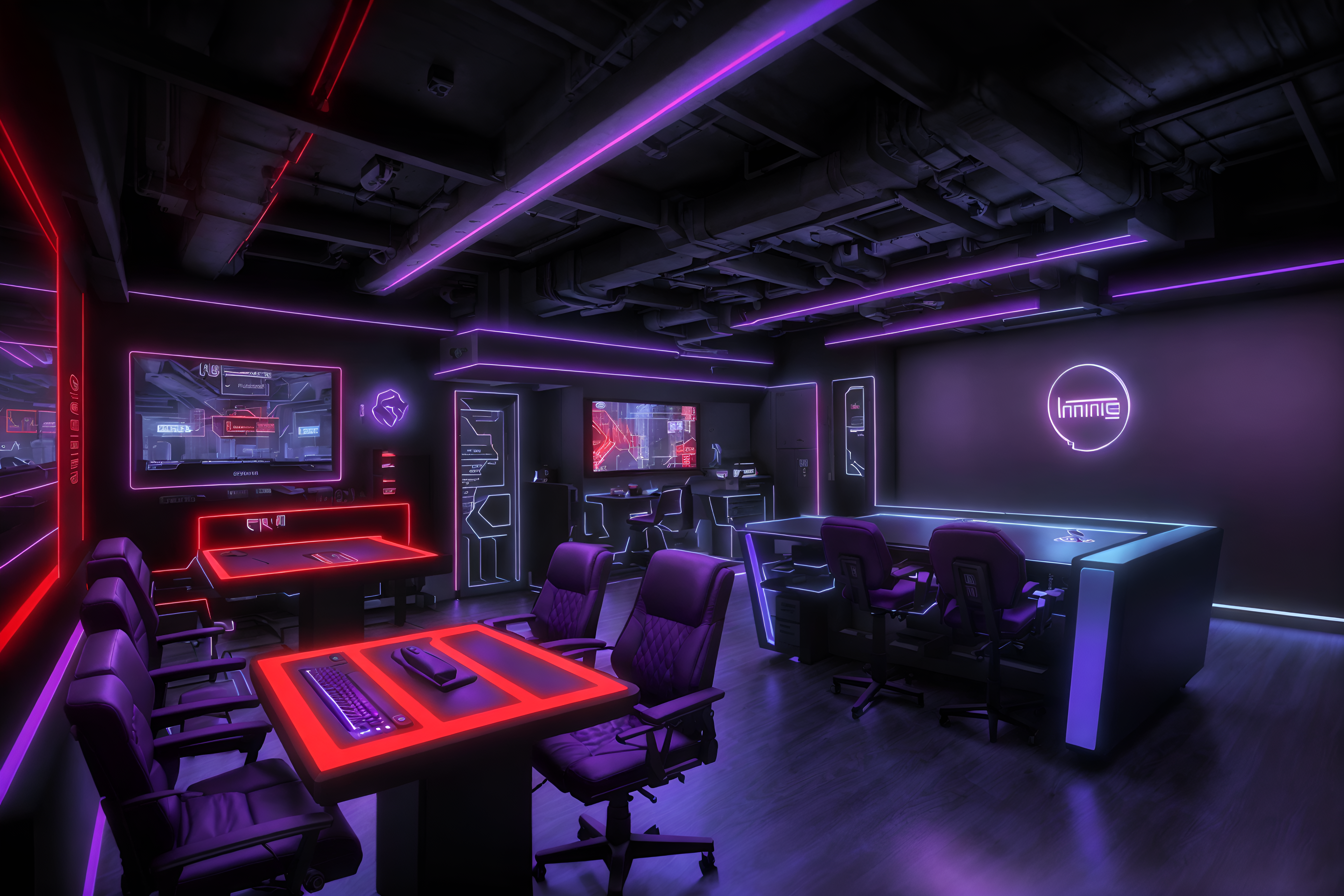 photo from pinterest of gaming room-style interior designed (coffee shop interior) . with purple, red and blue fade light and gaming chair and speakers and computer desk with computer displays and keyboard and dark walls and dark room and purple and red lights and multiple displays. . cinematic photo, highly detailed, cinematic lighting, ultra-detailed, ultrarealistic, photorealism, 8k. trending on pinterest. gaming room interior design style. masterpiece, cinematic light, ultrarealistic+, photorealistic+, 8k, raw photo, realistic, sharp focus on eyes, (symmetrical eyes), (intact eyes), hyperrealistic, highest quality, best quality, , highly detailed, masterpiece, best quality, extremely detailed 8k wallpaper, masterpiece, best quality, ultra-detailed, best shadow, detailed background, detailed face, detailed eyes, high contrast, best illumination, detailed face, dulux, caustic, dynamic angle, detailed glow. dramatic lighting. highly detailed, insanely detailed hair, symmetrical, intricate details, professionally retouched, 8k high definition. strong bokeh. award winning photo.