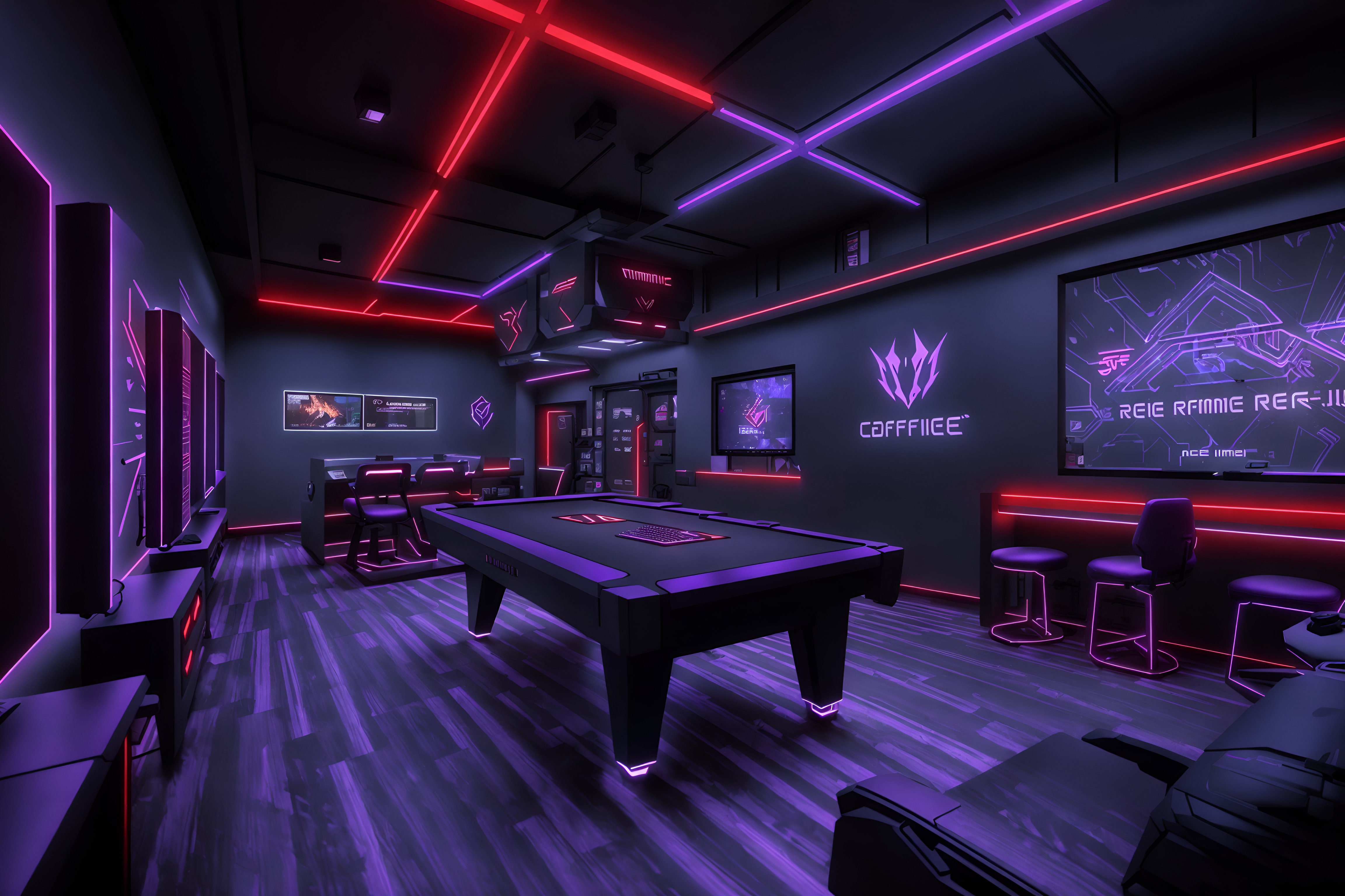 gaming room coffee shopsinterior decorate this coffee shop with gaming room style. . . . with at night and gaming chair and multiple displays and dark walls and purple and red lights and speakers and video game consoles and dark room. . .