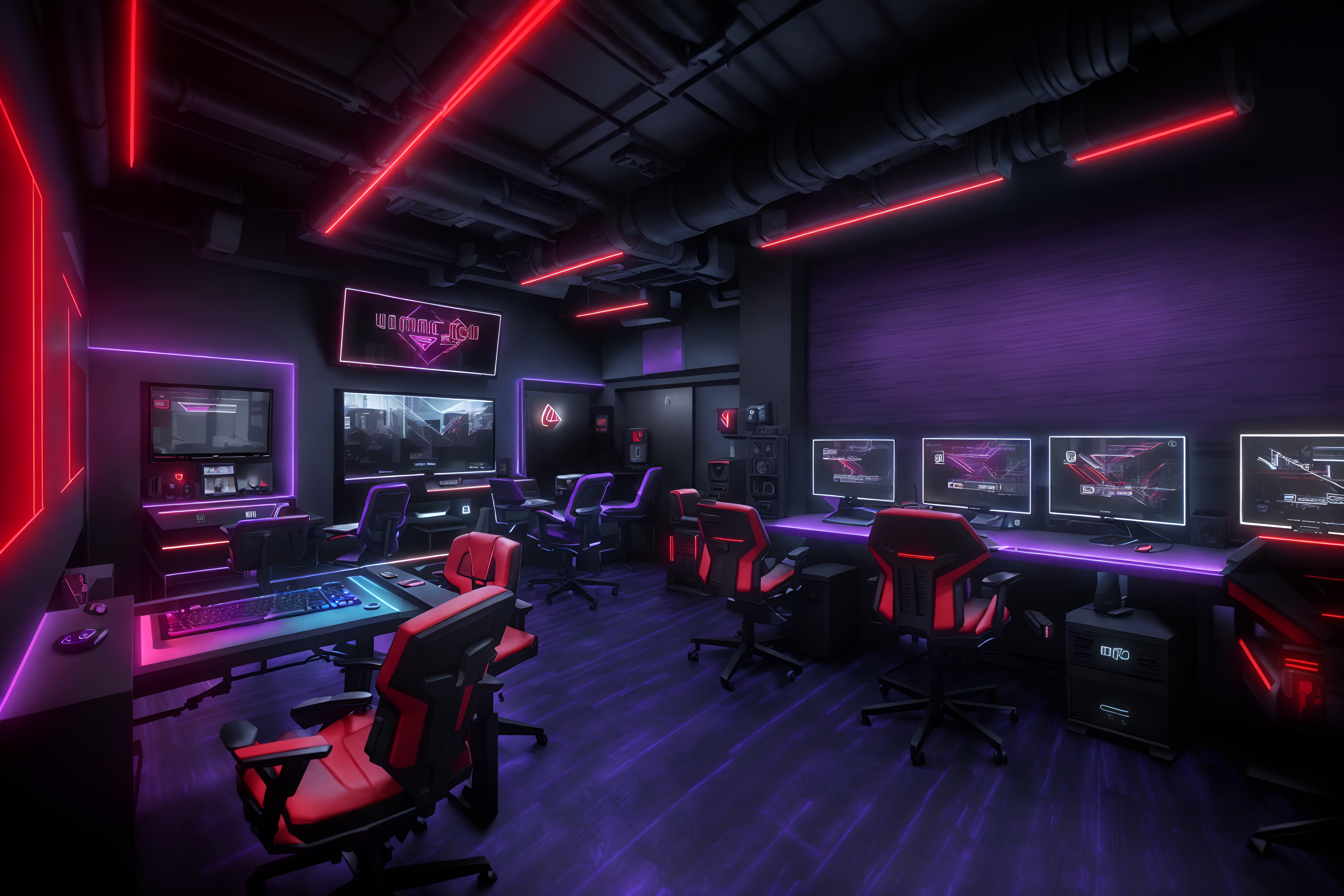 photo from pinterest of gaming room-style interior designed (coffee shop interior) . with purple, red and blue fade light and gaming chair and speakers and computer desk with computer displays and keyboard and dark walls and dark room and purple and red lights and multiple displays. . cinematic photo, highly detailed, cinematic lighting, ultra-detailed, ultrarealistic, photorealism, 8k. trending on pinterest. gaming room interior design style. masterpiece, cinematic light, ultrarealistic+, photorealistic+, 8k, raw photo, realistic, sharp focus on eyes, (symmetrical eyes), (intact eyes), hyperrealistic, highest quality, best quality, , highly detailed, masterpiece, best quality, extremely detailed 8k wallpaper, masterpiece, best quality, ultra-detailed, best shadow, detailed background, detailed face, detailed eyes, high contrast, best illumination, detailed face, dulux, caustic, dynamic angle, detailed glow. dramatic lighting. highly detailed, insanely detailed hair, symmetrical, intricate details, professionally retouched, 8k high definition. strong bokeh. award winning photo.