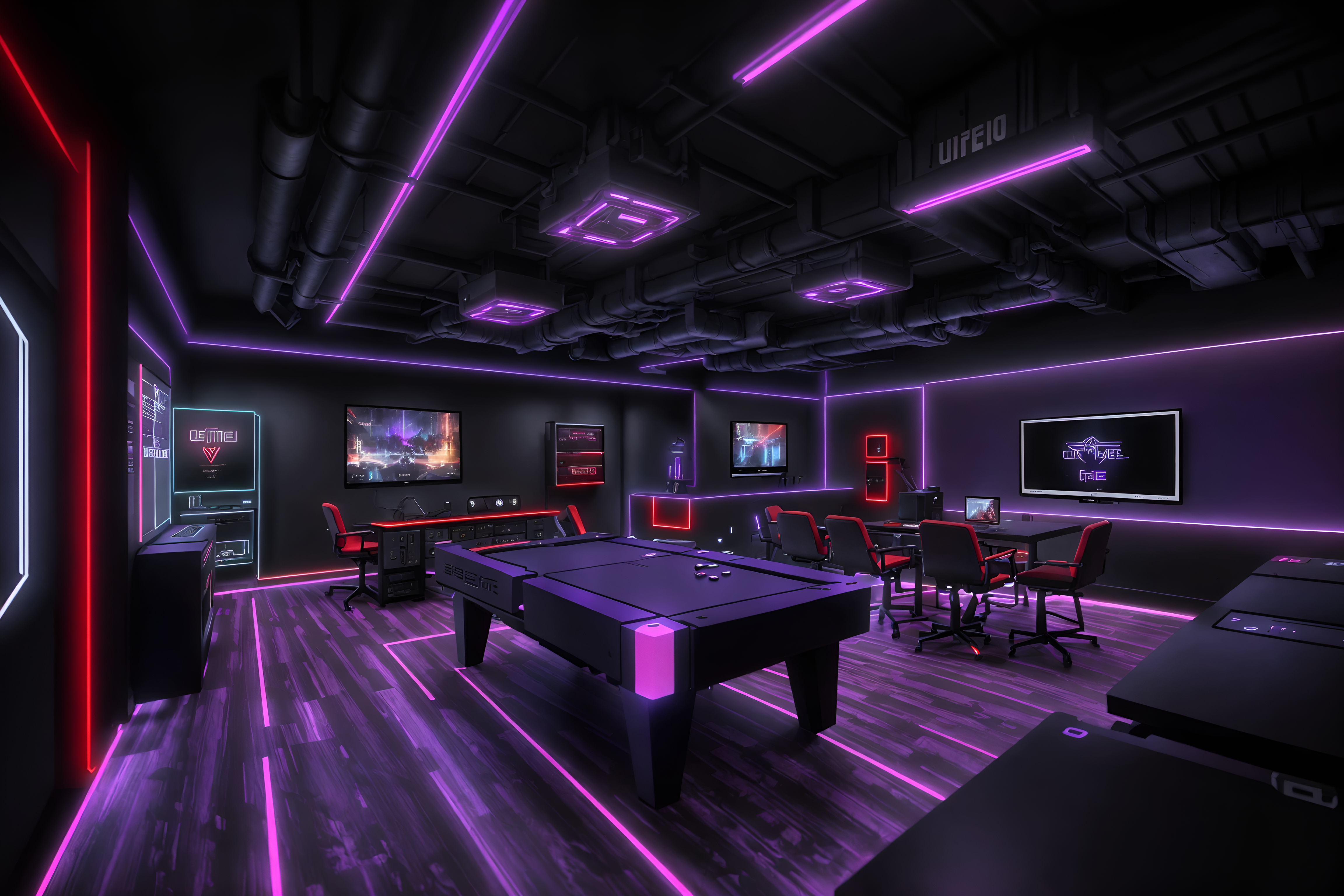 gaming room interiorsinterior decorate this board game cafe with gaming room style. . . with cozy lighting and snacks and coffee cups and dice and playing cards and comfortable chairs and menu boards and board games. . with dark room and purple, red and blue fade light and gaming chair and dark walls and at night and computer desk with computer displays and keyboard and video game consoles and multiple displays. . .interior decorate this photography studio with gaming room style. . . with professional photography studio and professional photography studio and soft lighting and photography studio and photography umbrella lights and softbox lights and professional lighting equipment and ring light. . with dark walls and neon lights and multiple displays and purple, red and blue fade light and purple and red lights and at night and dark lit room and gaming chair. . .interior decorate this laundry room with gaming room style. . . with cabinet and laundry tub and area rug and floating shelves and clothes hamper and laundry jars and drying racks and washing machine. . with multiple displays and purple, red and blue fade light and video game consoles and dark lit room and neon lights and speakers and computer desk with computer displays and keyboard and dark room. . .interior decorate this hotel room with gaming room style. . . with night light and mirror and bedside table or night stand and working desk with desk chair and accent chair and storage bench or ottoman and hotel bathroom and dresser closet. . with computer desk with computer displays and keyboard and neon letters on wall and multiple displays and dark lit room and purple, red and blue fade light and gaming chair and speakers and dark room. . .interior decorate this mudroom with gaming room style. . . with high up storage and shelves for shoes and wall hooks for coats and cubbies and storage baskets and cabinets and storage drawers and a bench. . with neon letters on wall and purple, red and blue fade light and dark lit room and at night and dark walls and computer desk with computer displays and keyboard and purple and red lights and speakers. . .interior decorate this courtroom with gaming room style. . . with flags and court reporter desk and attorney tables and jury box and gallery seating and scales of justice and witness stand and gavel. . with dark room and purple, red and blue fade light and multiple displays and video game consoles and gaming chair and speakers and neon lights and neon letters on wall. . .interior decorate this hallway with gaming room style. . . with runner rug and plant and console table and mirror and picture frames and coat rack and umbrella stand and wall sconces. . with video game consoles and speakers and neon lights and purple, red and blue fade light and at night and gaming chair and multiple displays and dark lit room. . .interior decorate this lecture hall with gaming room style. . . with lecture notes and tiered seating and projector and speaker system and podium and whiteboard and chalkboard and projection screen. . with dark lit room and dark walls and neon letters on wall and dark room and purple, red and blue fade light and at night and video game consoles and gaming chair. . .interior decorate this church with gaming room style. . . with stained glass windows and organ and religious statues and altar and hymn books and pulpit and cross and baptismal font. . with purple and red lights and speakers and purple, red and blue fade light and multiple displays and dark lit room and at night and dark room and video game consoles. . .