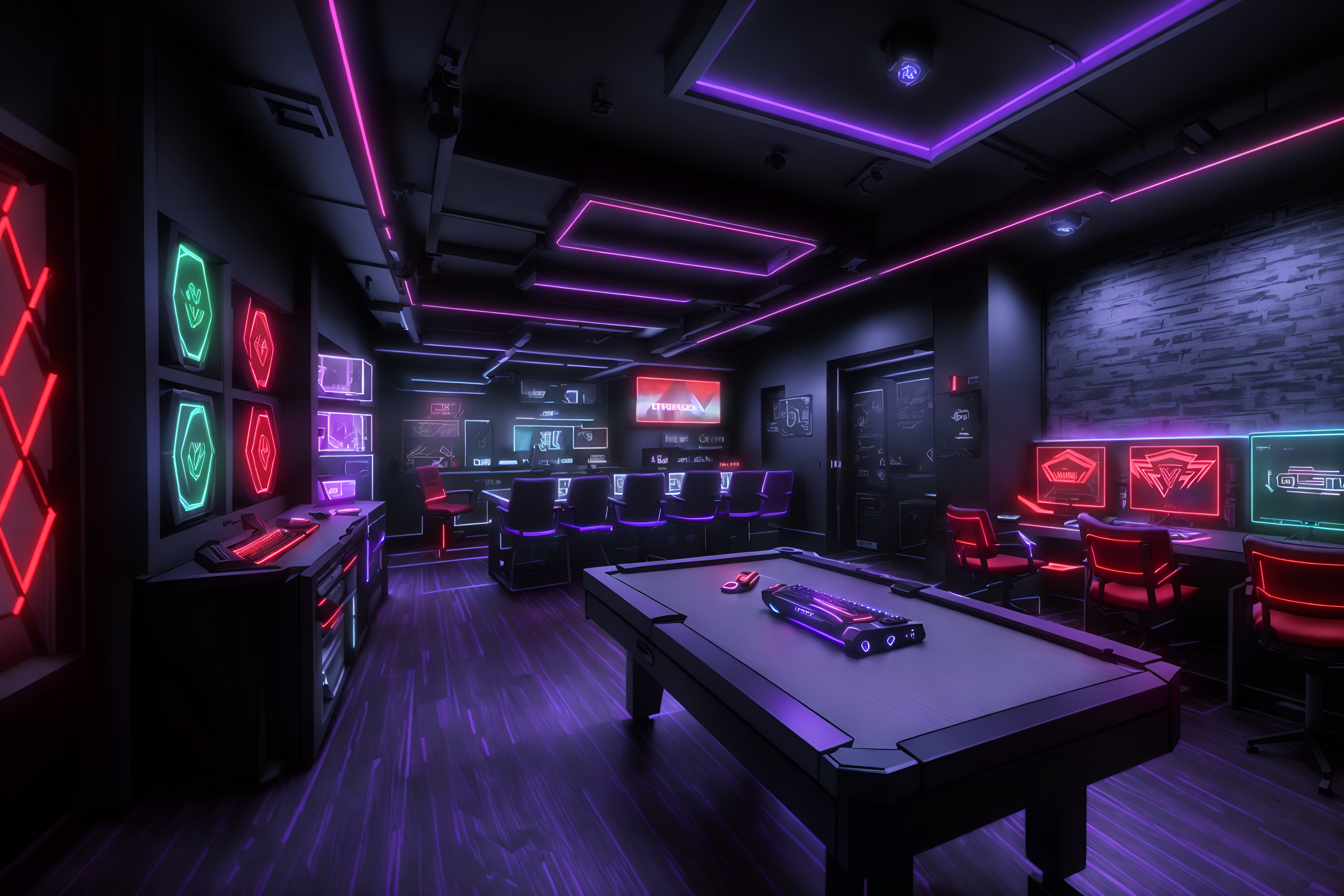 photo from pinterest of gaming room-style interior designed (coffee shop interior) . with purple, red and blue fade light and gaming chair and speakers and computer desk with computer displays and keyboard and dark walls and dark room and purple and red lights and multiple displays. . cinematic photo, highly detailed, cinematic lighting, ultra-detailed, ultrarealistic, photorealism, 8k. trending on pinterest. gaming room interior design style. masterpiece, cinematic light, ultrarealistic+, photorealistic+, 8k, raw photo, realistic, sharp focus on eyes, (symmetrical eyes), (intact eyes), hyperrealistic, highest quality, best quality, , highly detailed, masterpiece, best quality, extremely detailed 8k wallpaper, masterpiece, best quality, ultra-detailed, best shadow, detailed background, detailed face, detailed eyes, high contrast, best illumination, detailed face, dulux, caustic, dynamic angle, detailed glow. dramatic lighting. highly detailed, insanely detailed hair, symmetrical, intricate details, professionally retouched, 8k high definition. strong bokeh. award winning photo.