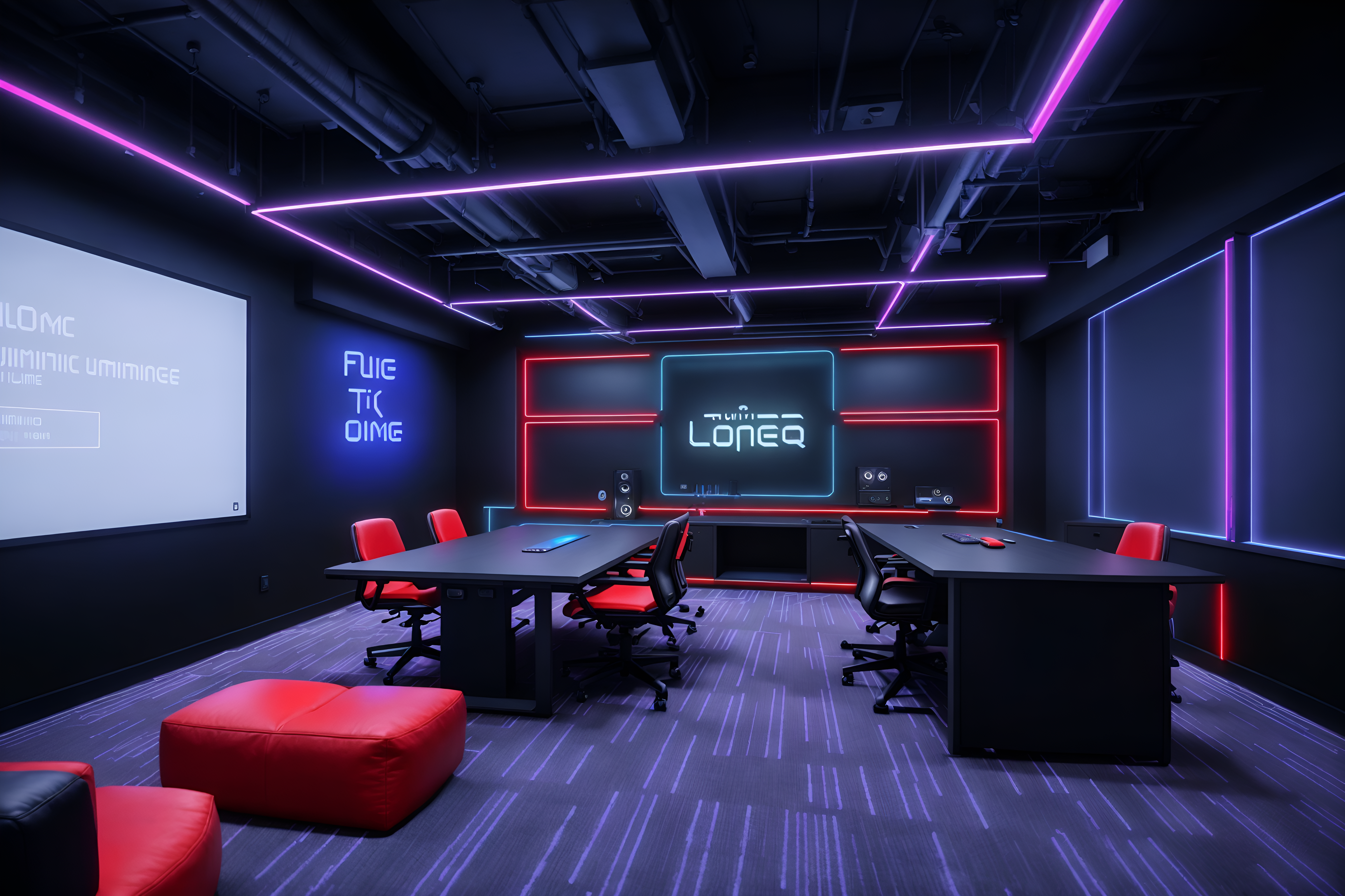 gaming room coworking spacesinterior decorate this coworking space with gaming room style. . . with lounge chairs and office chairs and seating area with sofa and office desks and lounge chairs. . with purple and red lights and dark room and gaming chair and purple, red and blue fade light and dark lit room and neon lights and speakers and computer desk with computer displays and keyboard. . .