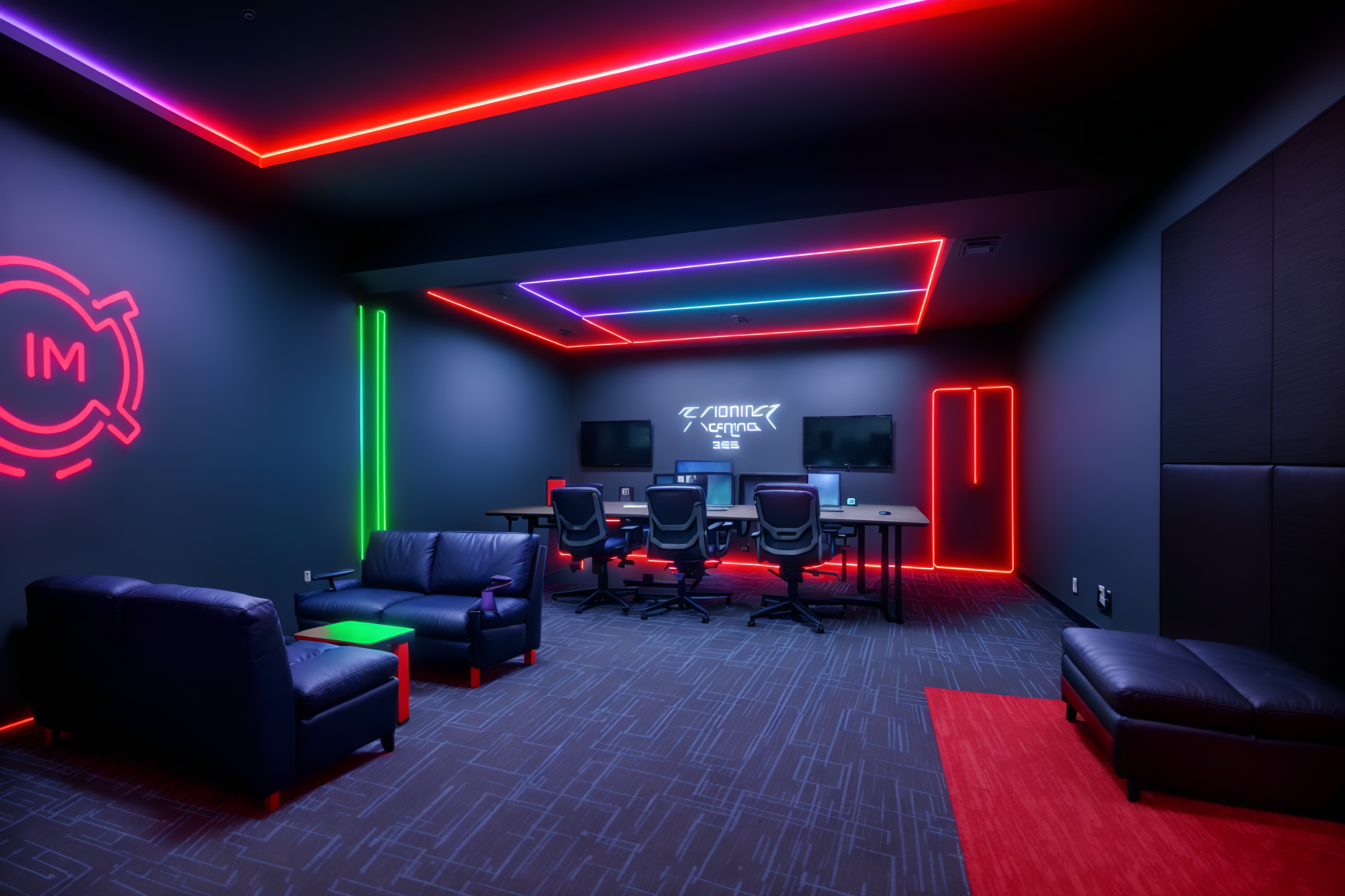 gaming room interiorsinterior decorate this coffee shop with gaming room style. . . . with at night and gaming chair and multiple displays and dark walls and purple and red lights and speakers and video game consoles and dark room. . .interior decorate this bathroom with gaming room style. . . with bathroom cabinet and shower and waste basket and bathroom sink with faucet and bathtub and bath towel and toilet seat and plant. . with neon letters on wall and dark lit room and purple and red lights and video game consoles and dark walls and at night and speakers and purple, red and blue fade light. . .interior decorate this airport lounge with gaming room style. . . with charging stations and refreshment bar and comfortable seating and luggage storage and newspapers and magazines and television screens and flight information displays. . with neon lights and at night and computer desk with computer displays and keyboard and dark walls and dark lit room and multiple displays and video game consoles and purple and red lights. . .interior decorate this hotel bathroom with gaming room style. . . with waste basket and bathroom cabinet and shower and toilet seat and bath rail and mirror and bath towel and bathtub. . with speakers and neon lights and purple and red lights and dark room and neon letters on wall and video game consoles and gaming chair and computer desk with computer displays and keyboard. . .interior decorate this hotel lobby with gaming room style. . . with rug and sofas and furniture and lounge chairs and check in desk and coffee tables and hanging lamps and plant. . with neon letters on wall and neon lights and dark lit room and multiple displays and purple and red lights and dark room and speakers and purple, red and blue fade light. . .interior decorate this dance studio with gaming room style. . . with water bottles and wooden floor and exercise equipment and dance mats and music player and ballet barre and speaker and mirrors. . with computer desk with computer displays and keyboard and neon letters on wall and gaming chair and dark walls and dark room and video game consoles and at night and purple and red lights. . .interior decorate this coworking space with gaming room style. . . with lounge chairs and office chairs and seating area with sofa and office desks and lounge chairs. . with purple and red lights and dark room and gaming chair and purple, red and blue fade light and dark lit room and neon lights and speakers and computer desk with computer displays and keyboard. . .interior decorate this mudroom with gaming room style. . . with high up storage and shelves for shoes and wall hooks for coats and cubbies and storage baskets and cabinets and storage drawers and a bench. . with neon letters on wall and purple, red and blue fade light and dark lit room and at night and dark walls and computer desk with computer displays and keyboard and purple and red lights and speakers. . .interior decorate this kitchen living combo with gaming room style. . . with chairs and refrigerator and worktops and bookshelves and electric lamps and stove and furniture and plant. . with multiple displays and neon letters on wall and at night and dark room and purple, red and blue fade light and gaming chair and neon lights and dark lit room. . .