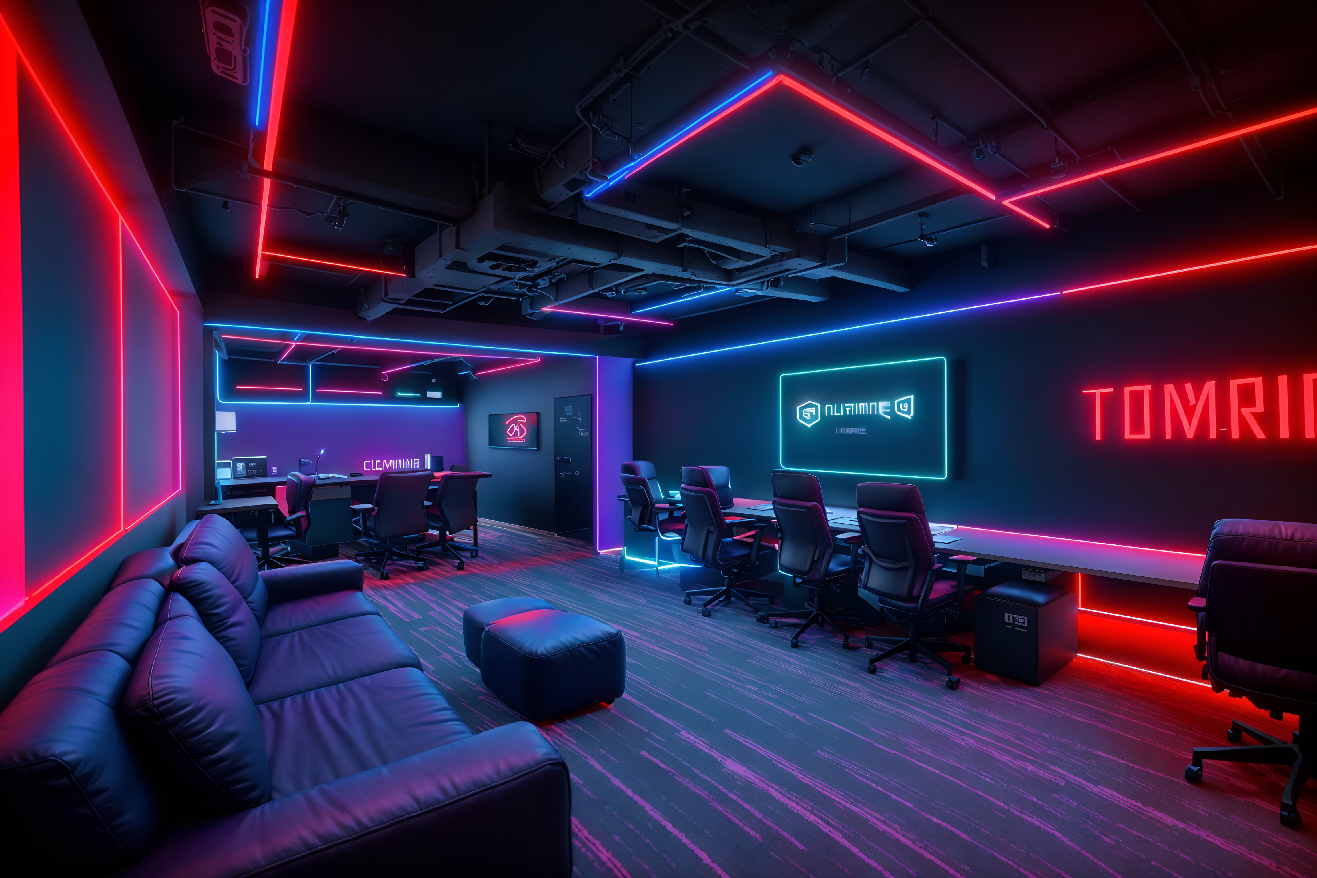 gaming room interiorsinterior decorate this conference hall with gaming room style. . . with speaker phone and microphones and projector and water glasses and flipchart and notepads and office chairs and whiteboard. . with speakers and multiple displays and purple, red and blue fade light and gaming chair and neon lights and dark walls and computer desk with computer displays and keyboard and purple and red lights. . .interior decorate this bedroom with gaming room style. . . with night light and mirror and bed and accent chair and dresser closet and plant and headboard and bedside table or night stand. . with neon letters on wall and gaming chair and neon lights and speakers and dark room and purple and red lights and multiple displays and at night. . .interior decorate this cinema with gaming room style. . . with concession stand and curtains and theater seats and movie screen and exit signs and popcorn machine and projector and surround sound speakers. . with multiple displays and dark walls and purple, red and blue fade light and neon letters on wall and speakers and gaming chair and neon lights and video game consoles. . .interior decorate this workshop with gaming room style. . . with tool wall and messy and wooden workbench and tool wall. . with dark walls and purple, red and blue fade light and computer desk with computer displays and keyboard and dark room and neon letters on wall and at night and gaming chair and speakers. . .interior decorate this store with gaming room style. . . with shelving units and cash register or point of sale system and store fixtures and fittings and signage and labels and display racks and shelving units. . with purple, red and blue fade light and video game consoles and multiple displays and at night and neon lights and speakers and dark room and gaming chair. . .interior decorate this hallway with gaming room style. . . with runner rug and plant and console table and mirror and picture frames and coat rack and umbrella stand and wall sconces. . with video game consoles and speakers and neon lights and purple, red and blue fade light and at night and gaming chair and multiple displays and dark lit room. . .interior decorate this hotel room with gaming room style. . . with night light and mirror and bedside table or night stand and working desk with desk chair and accent chair and storage bench or ottoman and hotel bathroom and dresser closet. . with computer desk with computer displays and keyboard and neon letters on wall and multiple displays and dark lit room and purple, red and blue fade light and gaming chair and speakers and dark room. . .interior decorate this attic with gaming room style. . . with storage boxes and exposed beams and skylights and dust sheets and old books and old furniture and ladder and storage shelves. . with gaming chair and dark lit room and neon letters on wall and neon lights and dark room and multiple displays and computer desk with computer displays and keyboard and purple, red and blue fade light. . .interior decorate this cafeteria with gaming room style. . . with food service counter and menu boards and benches and dining tables and trash bins and utensils and chairs and beverage station. . with at night and neon letters on wall and purple, red and blue fade light and purple and red lights and video game consoles and gaming chair and dark room and dark walls. . .
