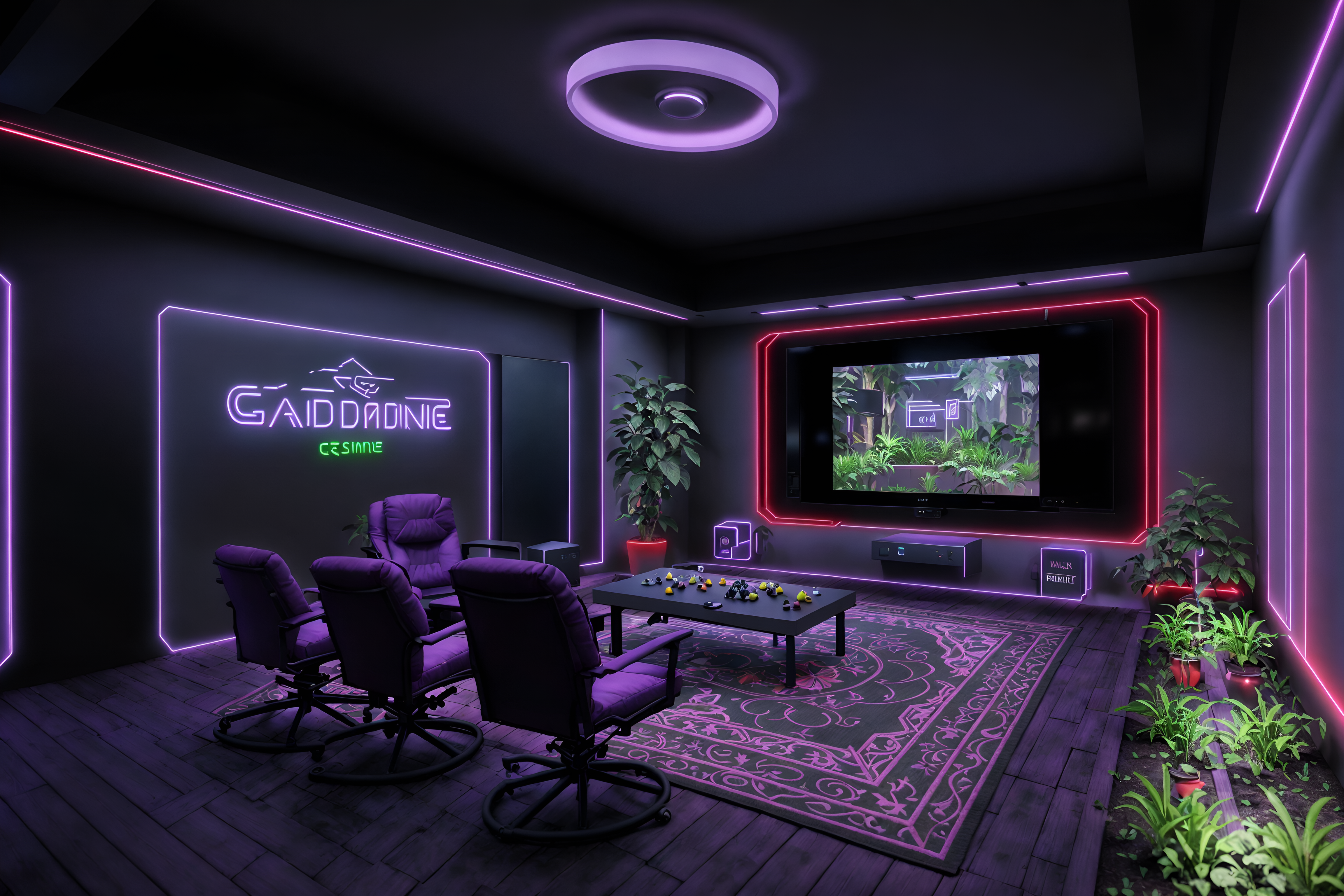 photo from pinterest of gaming room-style designed (outdoor garden ) with garden plants and garden tree and grass and garden plants. . with purple and red lights and at night and dark room and neon letters on wall and dark walls and gaming chair and purple, red and blue fade light and neon lights. . cinematic photo, highly detailed, cinematic lighting, ultra-detailed, ultrarealistic, photorealism, 8k. trending on pinterest. gaming room design style. masterpiece, cinematic light, ultrarealistic+, photorealistic+, 8k, raw photo, realistic, sharp focus on eyes, (symmetrical eyes), (intact eyes), hyperrealistic, highest quality, best quality, , highly detailed, masterpiece, best quality, extremely detailed 8k wallpaper, masterpiece, best quality, ultra-detailed, best shadow, detailed background, detailed face, detailed eyes, high contrast, best illumination, detailed face, dulux, caustic, dynamic angle, detailed glow. dramatic lighting. highly detailed, insanely detailed hair, symmetrical, intricate details, professionally retouched, 8k high definition. strong bokeh. award winning photo.