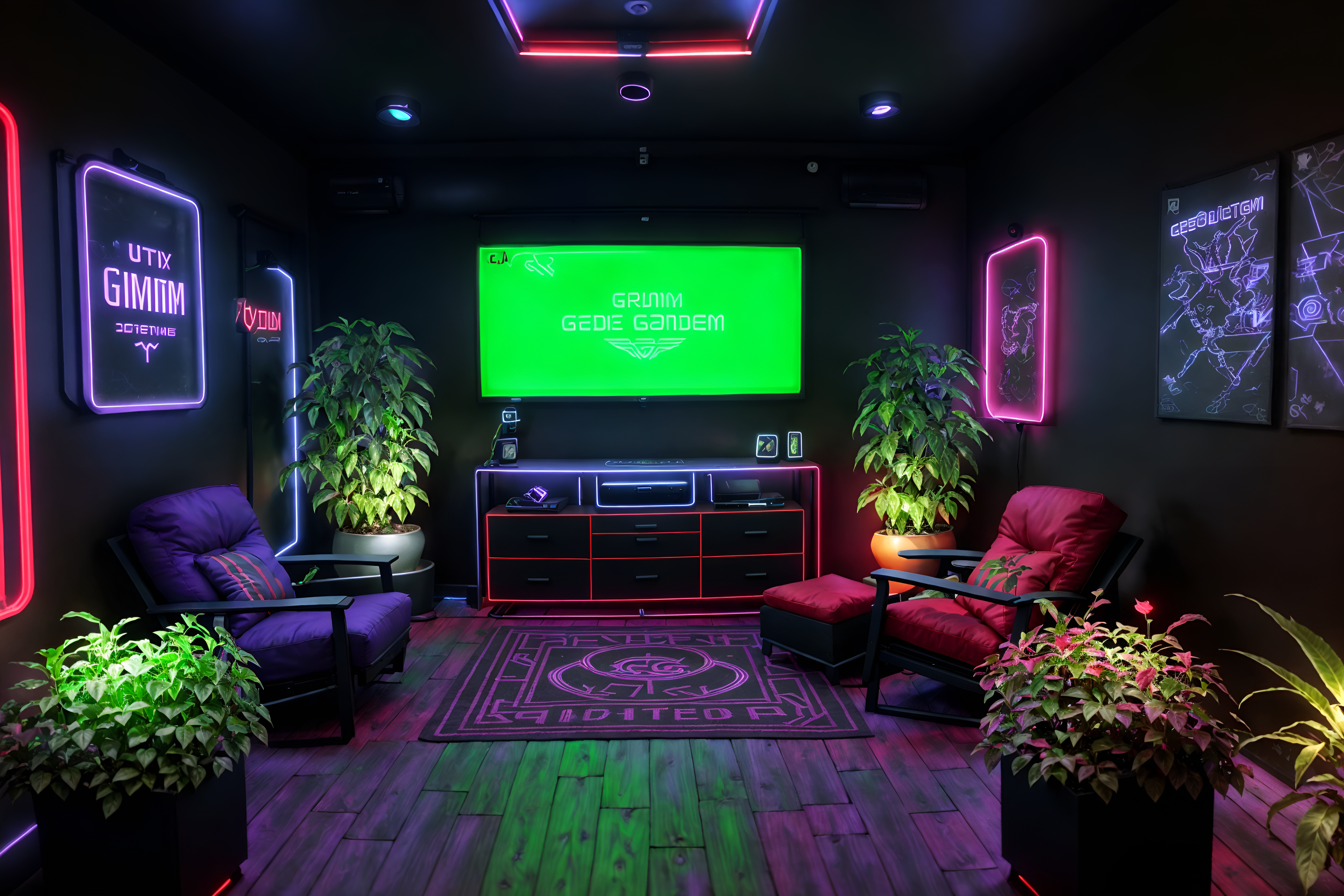 photo from pinterest of gaming room-style designed (outdoor garden ) with garden plants and garden tree and grass and garden plants. . with purple and red lights and at night and dark room and neon letters on wall and dark walls and gaming chair and purple, red and blue fade light and neon lights. . cinematic photo, highly detailed, cinematic lighting, ultra-detailed, ultrarealistic, photorealism, 8k. trending on pinterest. gaming room design style. masterpiece, cinematic light, ultrarealistic+, photorealistic+, 8k, raw photo, realistic, sharp focus on eyes, (symmetrical eyes), (intact eyes), hyperrealistic, highest quality, best quality, , highly detailed, masterpiece, best quality, extremely detailed 8k wallpaper, masterpiece, best quality, ultra-detailed, best shadow, detailed background, detailed face, detailed eyes, high contrast, best illumination, detailed face, dulux, caustic, dynamic angle, detailed glow. dramatic lighting. highly detailed, insanely detailed hair, symmetrical, intricate details, professionally retouched, 8k high definition. strong bokeh. award winning photo.