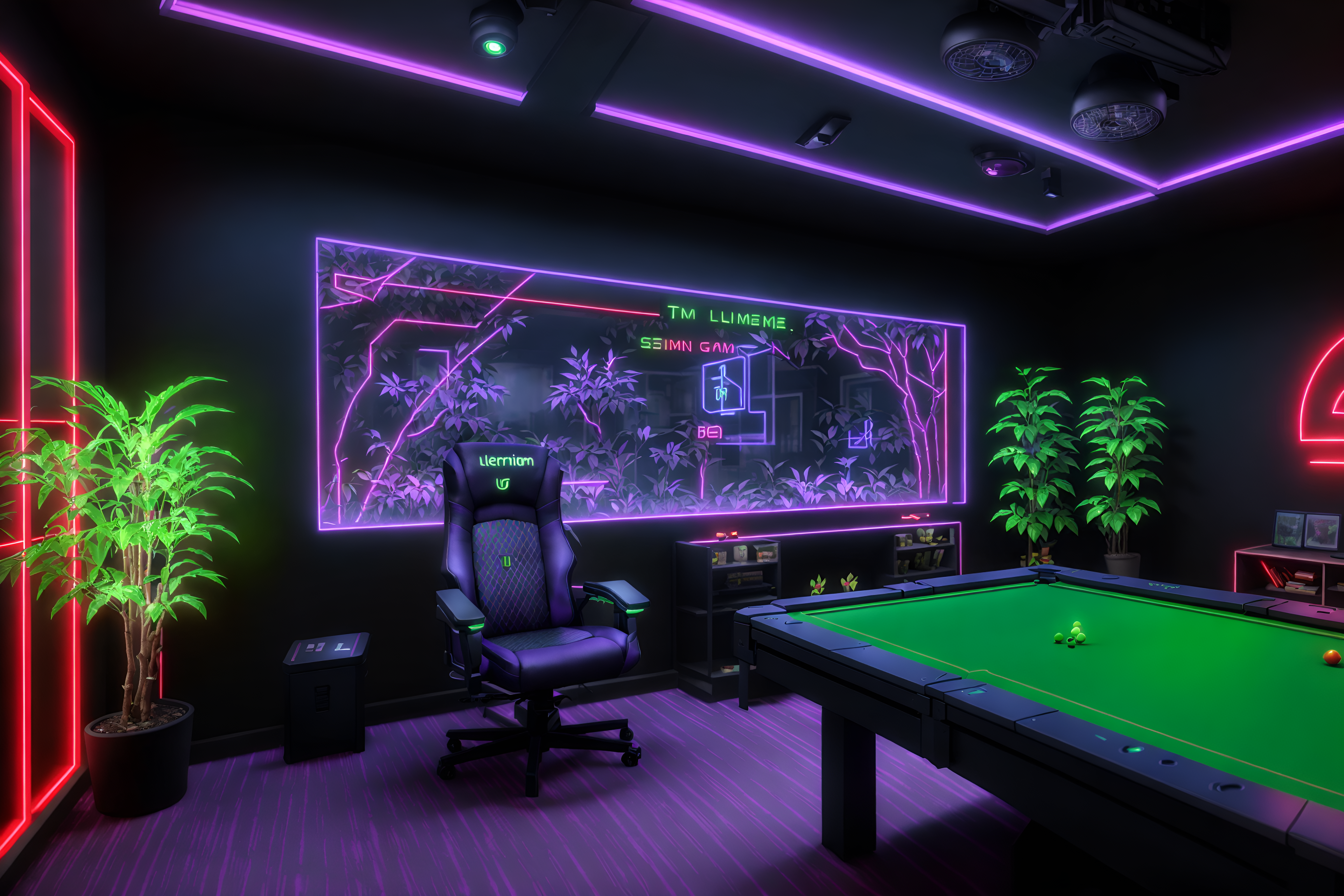 photo from pinterest of gaming room-style designed (outdoor garden ) with garden plants and garden tree and grass and garden plants. . with purple and red lights and at night and dark room and neon letters on wall and dark walls and gaming chair and purple, red and blue fade light and neon lights. . cinematic photo, highly detailed, cinematic lighting, ultra-detailed, ultrarealistic, photorealism, 8k. trending on pinterest. gaming room design style. masterpiece, cinematic light, ultrarealistic+, photorealistic+, 8k, raw photo, realistic, sharp focus on eyes, (symmetrical eyes), (intact eyes), hyperrealistic, highest quality, best quality, , highly detailed, masterpiece, best quality, extremely detailed 8k wallpaper, masterpiece, best quality, ultra-detailed, best shadow, detailed background, detailed face, detailed eyes, high contrast, best illumination, detailed face, dulux, caustic, dynamic angle, detailed glow. dramatic lighting. highly detailed, insanely detailed hair, symmetrical, intricate details, professionally retouched, 8k high definition. strong bokeh. award winning photo.