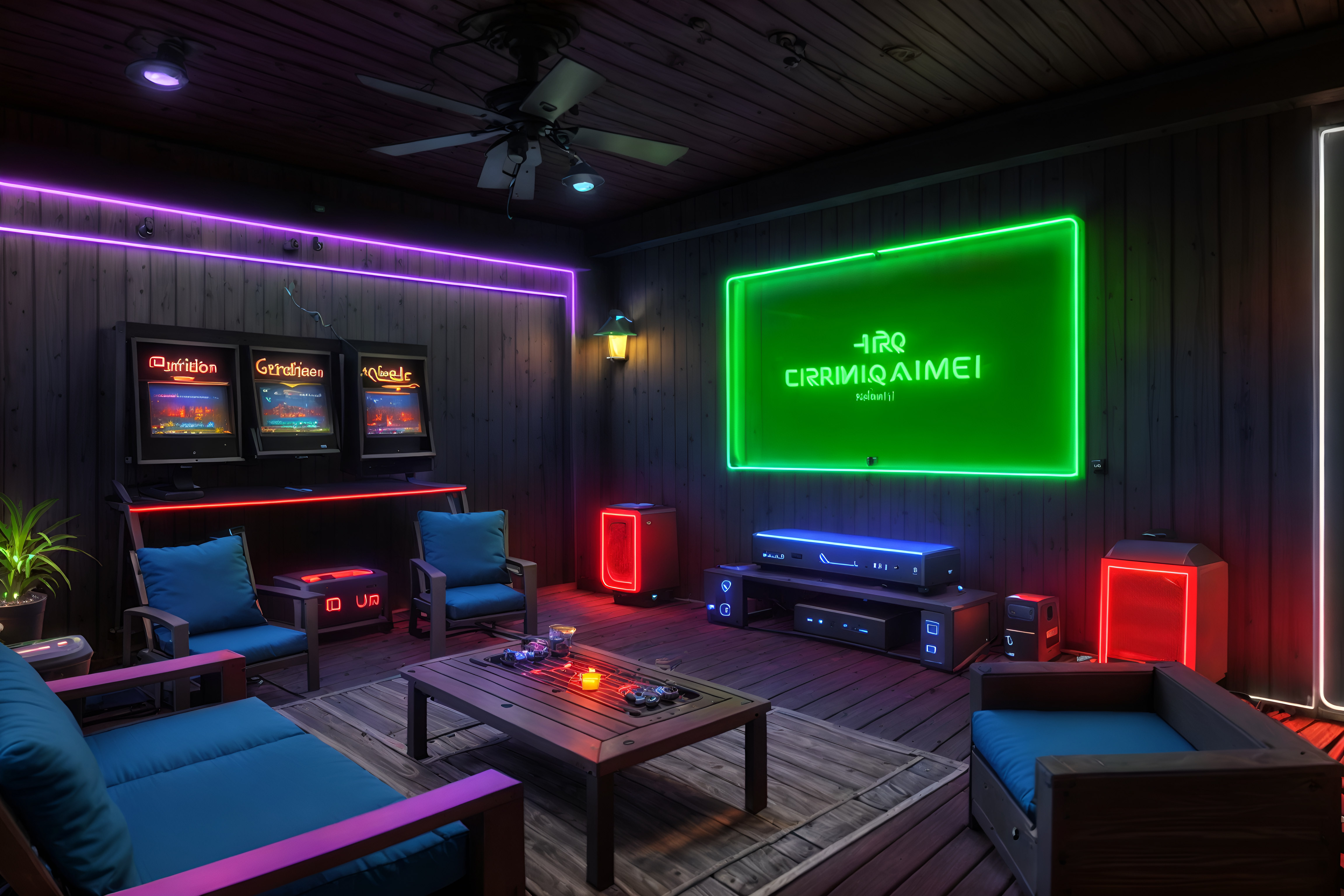 photo from pinterest of gaming room-style designed (outdoor patio ) with barbeque or grill and grass and plant and deck with deck chairs and patio couch with pillows and barbeque or grill. . with dark room and neon letters on wall and neon lights and speakers and multiple displays and purple, red and blue fade light and computer desk with computer displays and keyboard and dark walls. . cinematic photo, highly detailed, cinematic lighting, ultra-detailed, ultrarealistic, photorealism, 8k. trending on pinterest. gaming room design style. masterpiece, cinematic light, ultrarealistic+, photorealistic+, 8k, raw photo, realistic, sharp focus on eyes, (symmetrical eyes), (intact eyes), hyperrealistic, highest quality, best quality, , highly detailed, masterpiece, best quality, extremely detailed 8k wallpaper, masterpiece, best quality, ultra-detailed, best shadow, detailed background, detailed face, detailed eyes, high contrast, best illumination, detailed face, dulux, caustic, dynamic angle, detailed glow. dramatic lighting. highly detailed, insanely detailed hair, symmetrical, intricate details, professionally retouched, 8k high definition. strong bokeh. award winning photo.
