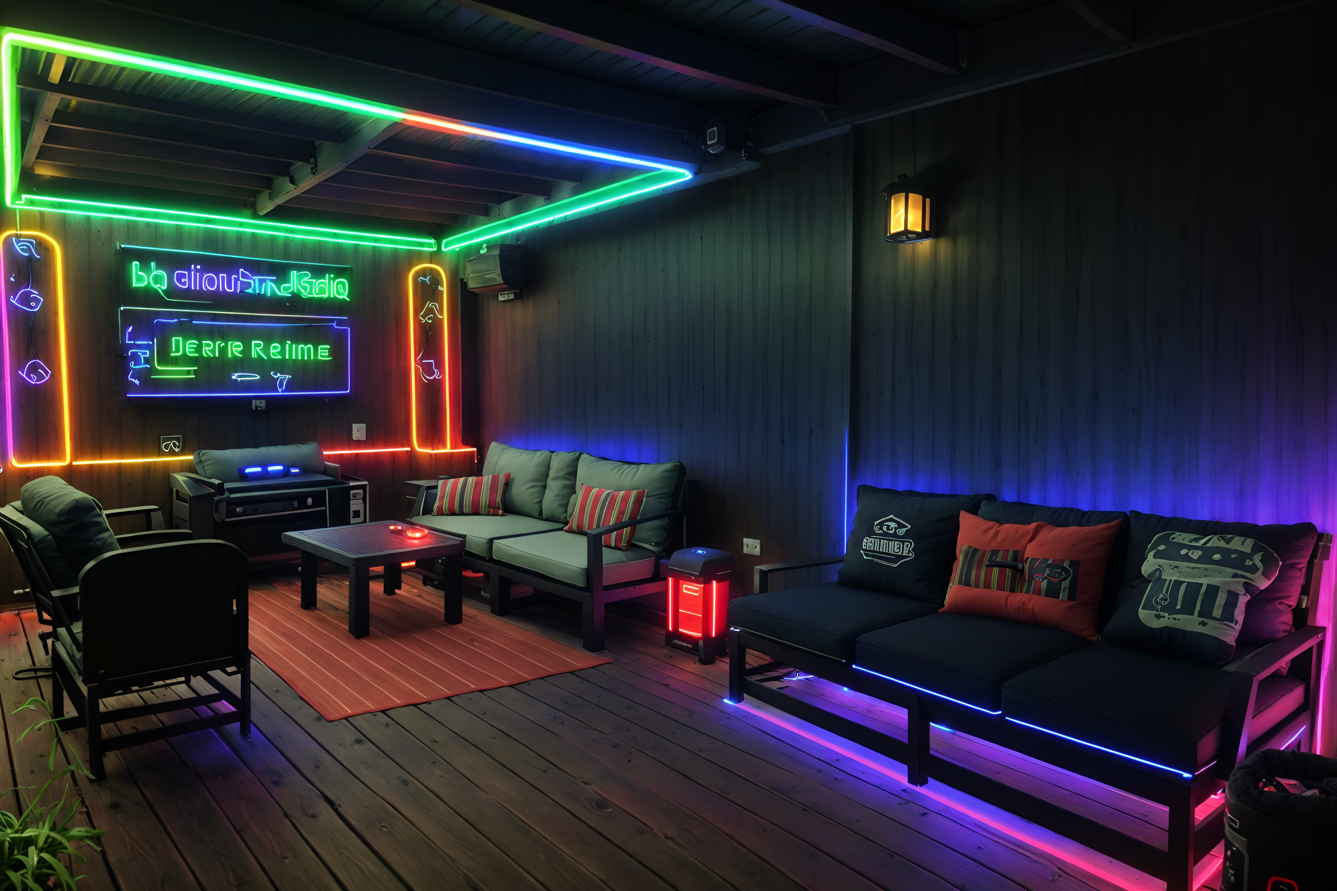 photo from pinterest of gaming room-style designed (outdoor patio ) with barbeque or grill and grass and plant and deck with deck chairs and patio couch with pillows and barbeque or grill. . with dark room and neon letters on wall and neon lights and speakers and multiple displays and purple, red and blue fade light and computer desk with computer displays and keyboard and dark walls. . cinematic photo, highly detailed, cinematic lighting, ultra-detailed, ultrarealistic, photorealism, 8k. trending on pinterest. gaming room design style. masterpiece, cinematic light, ultrarealistic+, photorealistic+, 8k, raw photo, realistic, sharp focus on eyes, (symmetrical eyes), (intact eyes), hyperrealistic, highest quality, best quality, , highly detailed, masterpiece, best quality, extremely detailed 8k wallpaper, masterpiece, best quality, ultra-detailed, best shadow, detailed background, detailed face, detailed eyes, high contrast, best illumination, detailed face, dulux, caustic, dynamic angle, detailed glow. dramatic lighting. highly detailed, insanely detailed hair, symmetrical, intricate details, professionally retouched, 8k high definition. strong bokeh. award winning photo.