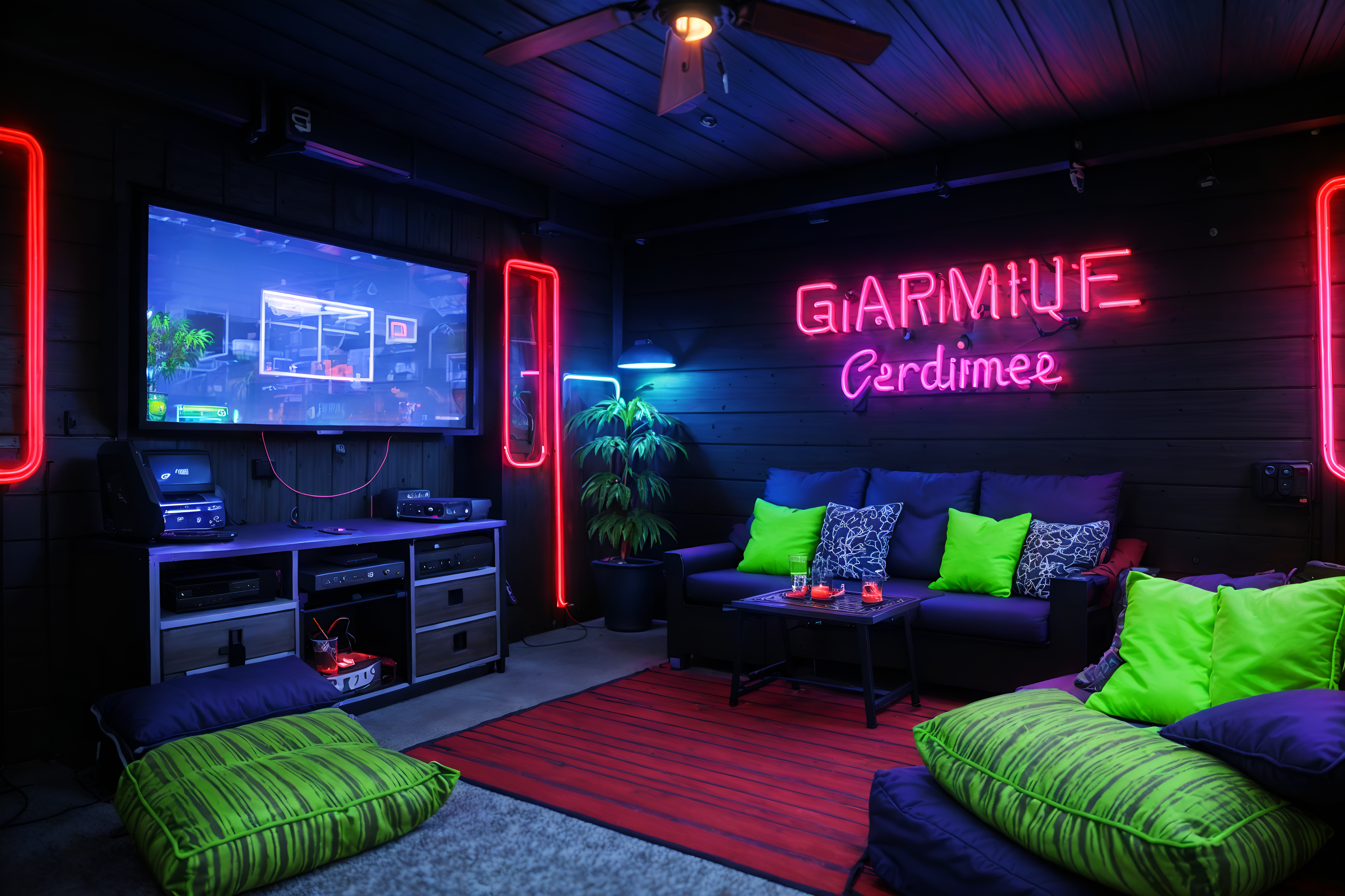 photo from pinterest of gaming room-style designed (outdoor patio ) with barbeque or grill and grass and plant and deck with deck chairs and patio couch with pillows and barbeque or grill. . with dark room and neon letters on wall and neon lights and speakers and multiple displays and purple, red and blue fade light and computer desk with computer displays and keyboard and dark walls. . cinematic photo, highly detailed, cinematic lighting, ultra-detailed, ultrarealistic, photorealism, 8k. trending on pinterest. gaming room design style. masterpiece, cinematic light, ultrarealistic+, photorealistic+, 8k, raw photo, realistic, sharp focus on eyes, (symmetrical eyes), (intact eyes), hyperrealistic, highest quality, best quality, , highly detailed, masterpiece, best quality, extremely detailed 8k wallpaper, masterpiece, best quality, ultra-detailed, best shadow, detailed background, detailed face, detailed eyes, high contrast, best illumination, detailed face, dulux, caustic, dynamic angle, detailed glow. dramatic lighting. highly detailed, insanely detailed hair, symmetrical, intricate details, professionally retouched, 8k high definition. strong bokeh. award winning photo.