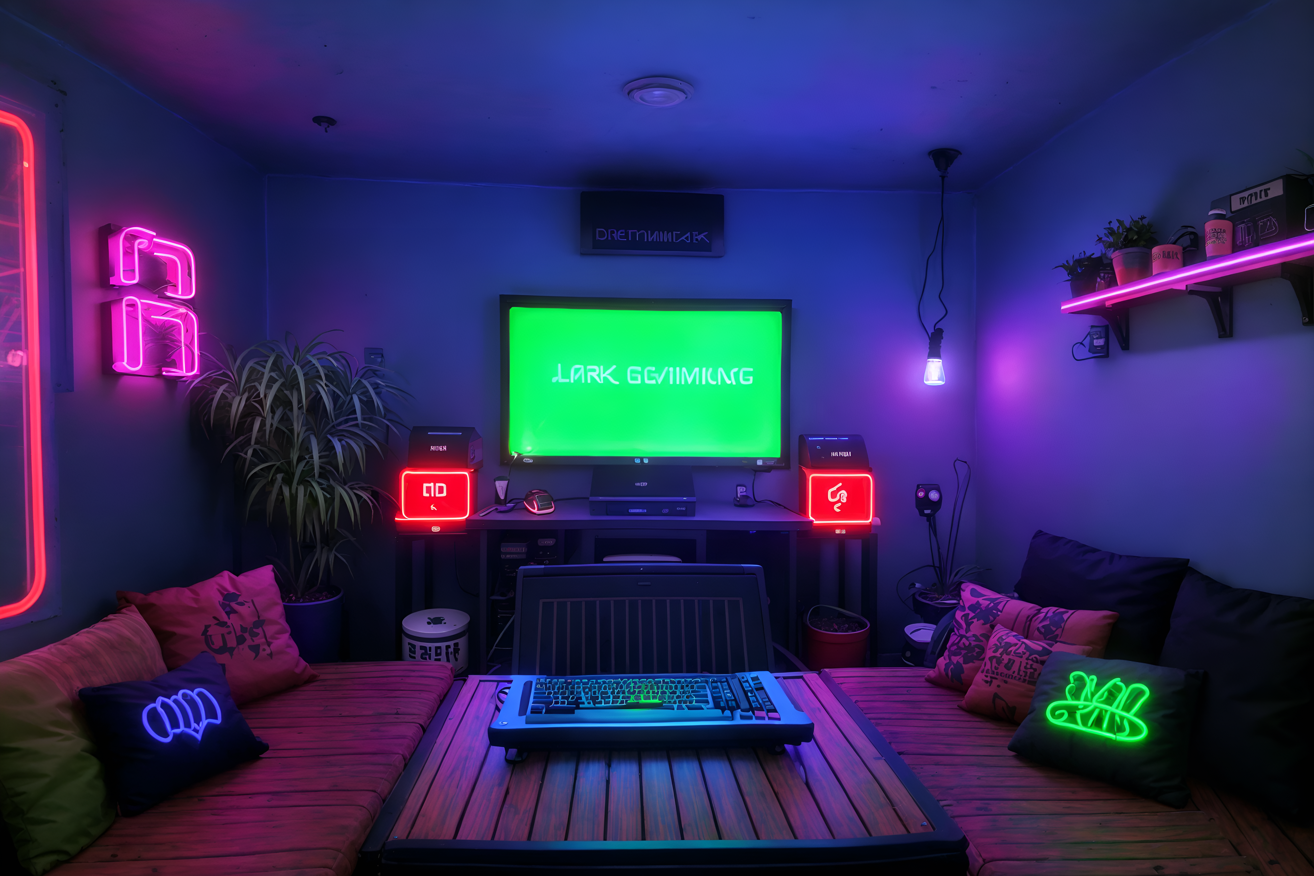 photo from pinterest of gaming room-style designed (outdoor patio ) with barbeque or grill and grass and plant and deck with deck chairs and patio couch with pillows and barbeque or grill. . with dark room and neon letters on wall and neon lights and speakers and multiple displays and purple, red and blue fade light and computer desk with computer displays and keyboard and dark walls. . cinematic photo, highly detailed, cinematic lighting, ultra-detailed, ultrarealistic, photorealism, 8k. trending on pinterest. gaming room design style. masterpiece, cinematic light, ultrarealistic+, photorealistic+, 8k, raw photo, realistic, sharp focus on eyes, (symmetrical eyes), (intact eyes), hyperrealistic, highest quality, best quality, , highly detailed, masterpiece, best quality, extremely detailed 8k wallpaper, masterpiece, best quality, ultra-detailed, best shadow, detailed background, detailed face, detailed eyes, high contrast, best illumination, detailed face, dulux, caustic, dynamic angle, detailed glow. dramatic lighting. highly detailed, insanely detailed hair, symmetrical, intricate details, professionally retouched, 8k high definition. strong bokeh. award winning photo.