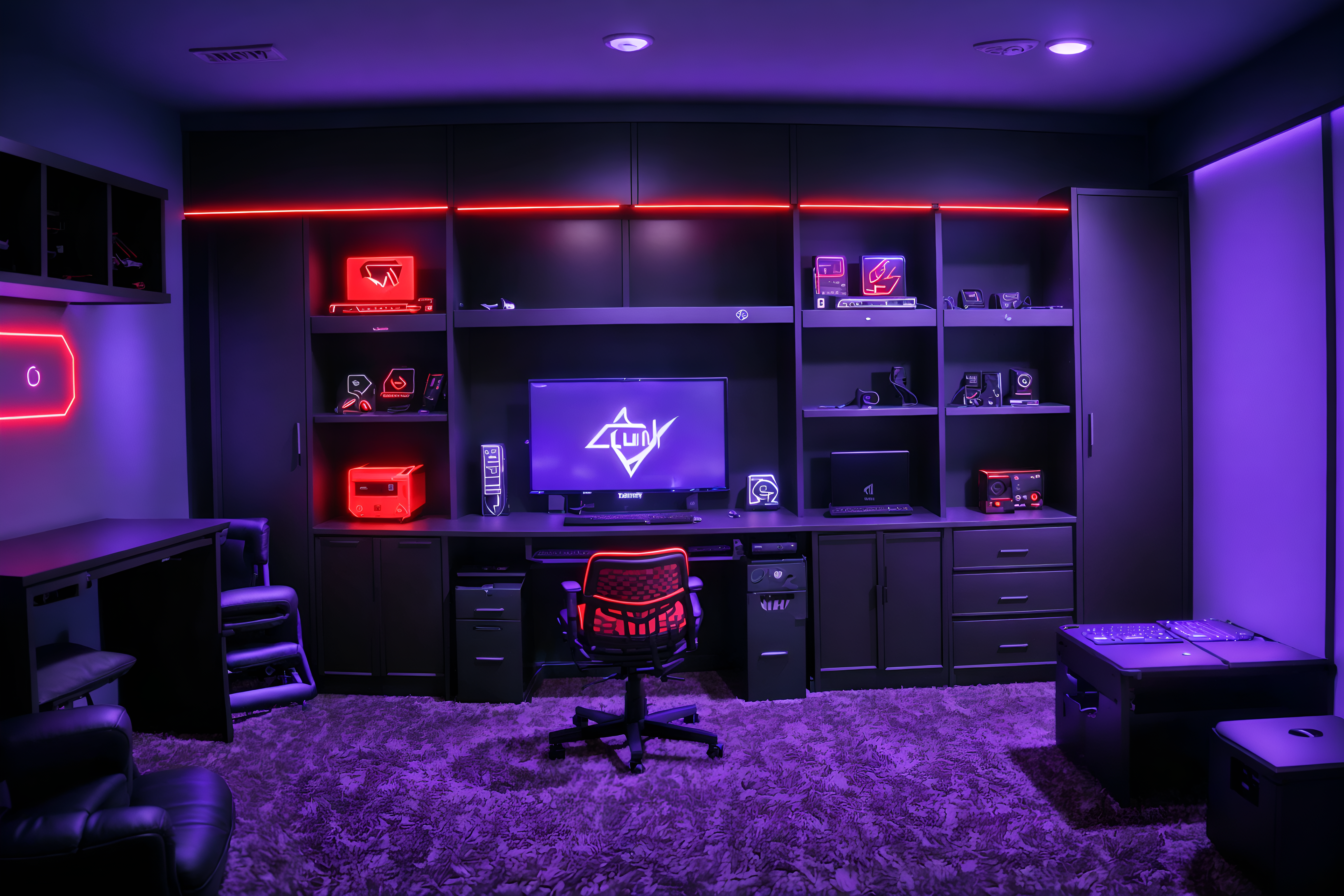 photo from pinterest of gaming room-style interior designed (drop zone interior) with wall hooks for coats and high up storage and shelves for shoes and storage baskets and cabinets and storage drawers and lockers and cubbies. . with dark room and gaming chair and purple and red lights and dark walls and multiple displays and computer desk with computer displays and keyboard and neon letters on wall and speakers. . cinematic photo, highly detailed, cinematic lighting, ultra-detailed, ultrarealistic, photorealism, 8k. trending on pinterest. gaming room interior design style. masterpiece, cinematic light, ultrarealistic+, photorealistic+, 8k, raw photo, realistic, sharp focus on eyes, (symmetrical eyes), (intact eyes), hyperrealistic, highest quality, best quality, , highly detailed, masterpiece, best quality, extremely detailed 8k wallpaper, masterpiece, best quality, ultra-detailed, best shadow, detailed background, detailed face, detailed eyes, high contrast, best illumination, detailed face, dulux, caustic, dynamic angle, detailed glow. dramatic lighting. highly detailed, insanely detailed hair, symmetrical, intricate details, professionally retouched, 8k high definition. strong bokeh. award winning photo.