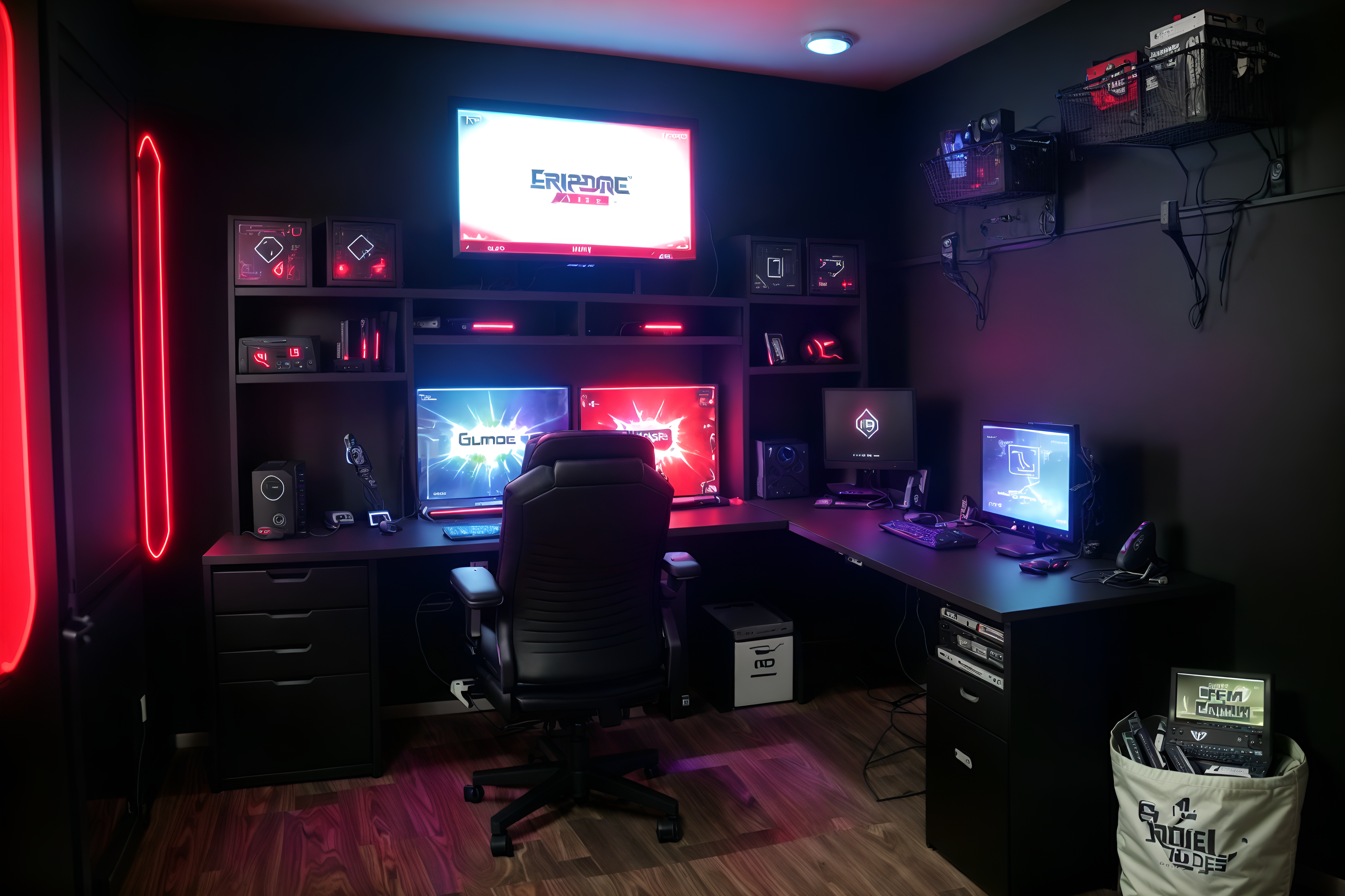 photo from pinterest of gaming room-style interior designed (drop zone interior) with wall hooks for coats and high up storage and shelves for shoes and storage baskets and cabinets and storage drawers and lockers and cubbies. . with dark room and gaming chair and purple and red lights and dark walls and multiple displays and computer desk with computer displays and keyboard and neon letters on wall and speakers. . cinematic photo, highly detailed, cinematic lighting, ultra-detailed, ultrarealistic, photorealism, 8k. trending on pinterest. gaming room interior design style. masterpiece, cinematic light, ultrarealistic+, photorealistic+, 8k, raw photo, realistic, sharp focus on eyes, (symmetrical eyes), (intact eyes), hyperrealistic, highest quality, best quality, , highly detailed, masterpiece, best quality, extremely detailed 8k wallpaper, masterpiece, best quality, ultra-detailed, best shadow, detailed background, detailed face, detailed eyes, high contrast, best illumination, detailed face, dulux, caustic, dynamic angle, detailed glow. dramatic lighting. highly detailed, insanely detailed hair, symmetrical, intricate details, professionally retouched, 8k high definition. strong bokeh. award winning photo.