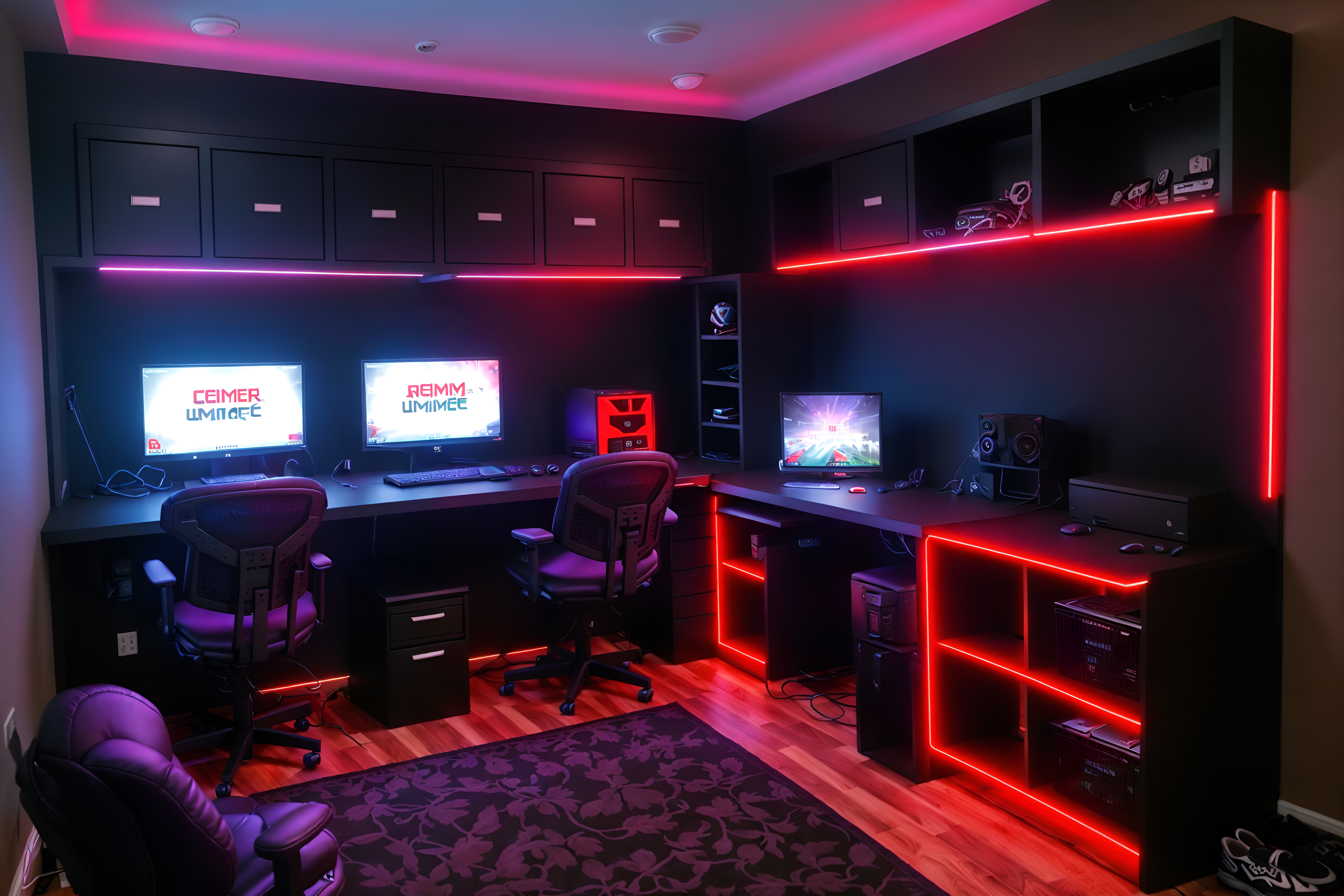 photo from pinterest of gaming room-style interior designed (drop zone interior) with wall hooks for coats and high up storage and shelves for shoes and storage baskets and cabinets and storage drawers and lockers and cubbies. . with dark room and gaming chair and purple and red lights and dark walls and multiple displays and computer desk with computer displays and keyboard and neon letters on wall and speakers. . cinematic photo, highly detailed, cinematic lighting, ultra-detailed, ultrarealistic, photorealism, 8k. trending on pinterest. gaming room interior design style. masterpiece, cinematic light, ultrarealistic+, photorealistic+, 8k, raw photo, realistic, sharp focus on eyes, (symmetrical eyes), (intact eyes), hyperrealistic, highest quality, best quality, , highly detailed, masterpiece, best quality, extremely detailed 8k wallpaper, masterpiece, best quality, ultra-detailed, best shadow, detailed background, detailed face, detailed eyes, high contrast, best illumination, detailed face, dulux, caustic, dynamic angle, detailed glow. dramatic lighting. highly detailed, insanely detailed hair, symmetrical, intricate details, professionally retouched, 8k high definition. strong bokeh. award winning photo.