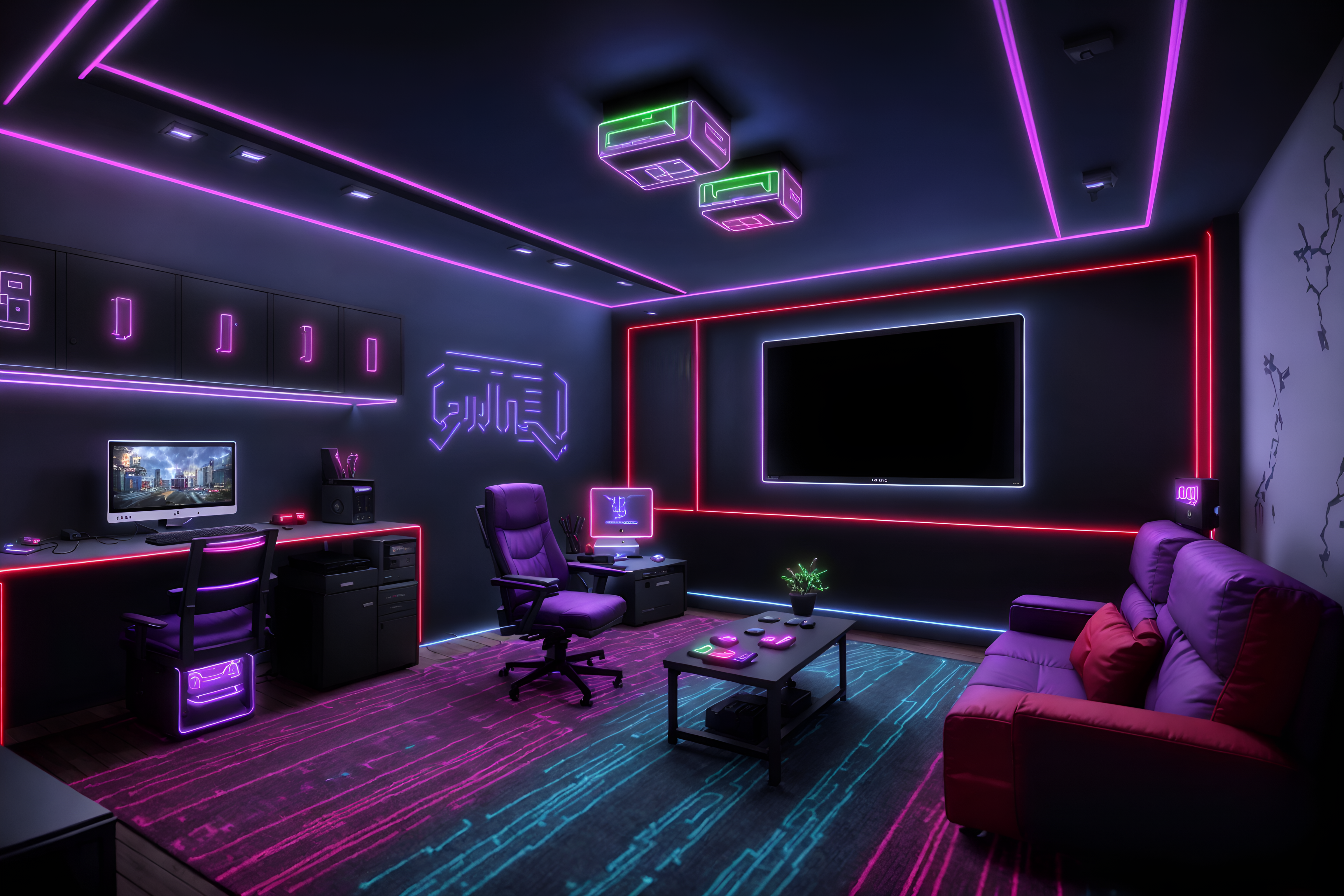 gaming room interiorsinterior decorate this house exterior with gaming room style. . . with garage door and driveway and landscaping and steps and mailbox and front door and outdoor lighting and windows. . with at night and purple and red lights and speakers and gaming chair and video game consoles and computer desk with computer displays and keyboard and dark room and neon letters on wall. . .interior decorate this clothing store with gaming room style. . . . with video game consoles and dark lit room and neon letters on wall and purple, red and blue fade light and at night and dark room and dark walls and multiple displays. . .interior decorate this outdoor patio with gaming room style. . . with deck with deck chairs and grass and plant and patio couch with pillows and barbeque or grill and deck with deck chairs. . with purple, red and blue fade light and neon letters on wall and neon lights and speakers and multiple displays and dark walls and computer desk with computer displays and keyboard and video game consoles. . .interior decorate this workshop with gaming room style. . . with tool wall and messy and wooden workbench and tool wall. . with dark walls and purple, red and blue fade light and computer desk with computer displays and keyboard and dark room and neon letters on wall and at night and gaming chair and speakers. . .interior decorate this pole dance studio with gaming room style. . . with exercise equipment and yoga mats and dim lighting and mirrors and towels and dance poles and grip aids and sound system. . with dark lit room and neon lights and multiple displays and video game consoles and at night and purple and red lights and dark room and purple, red and blue fade light. . .interior decorate this laundry room with gaming room style. . . with cabinet and laundry tub and area rug and floating shelves and clothes hamper and laundry jars and drying racks and washing machine. . with multiple displays and purple, red and blue fade light and video game consoles and dark lit room and neon lights and speakers and computer desk with computer displays and keyboard and dark room. . .interior decorate this hotel room with gaming room style. . . with night light and mirror and bedside table or night stand and working desk with desk chair and accent chair and storage bench or ottoman and hotel bathroom and dresser closet. . with computer desk with computer displays and keyboard and neon letters on wall and multiple displays and dark lit room and purple, red and blue fade light and gaming chair and speakers and dark room. . .interior decorate this auditorium with gaming room style. . . with curtains and balcony and lighting equipment and theater seats and microphones and orchestra pit and exit signs and aisles. . with video game consoles and computer desk with computer displays and keyboard and speakers and multiple displays and dark walls and dark room and purple, red and blue fade light and dark lit room. . .interior decorate this photography studio with gaming room style. . . with professional photography studio and professional photography studio and soft lighting and photography studio and photography umbrella lights and softbox lights and professional lighting equipment and ring light. . with dark walls and neon lights and multiple displays and purple, red and blue fade light and purple and red lights and at night and dark lit room and gaming chair. . .
