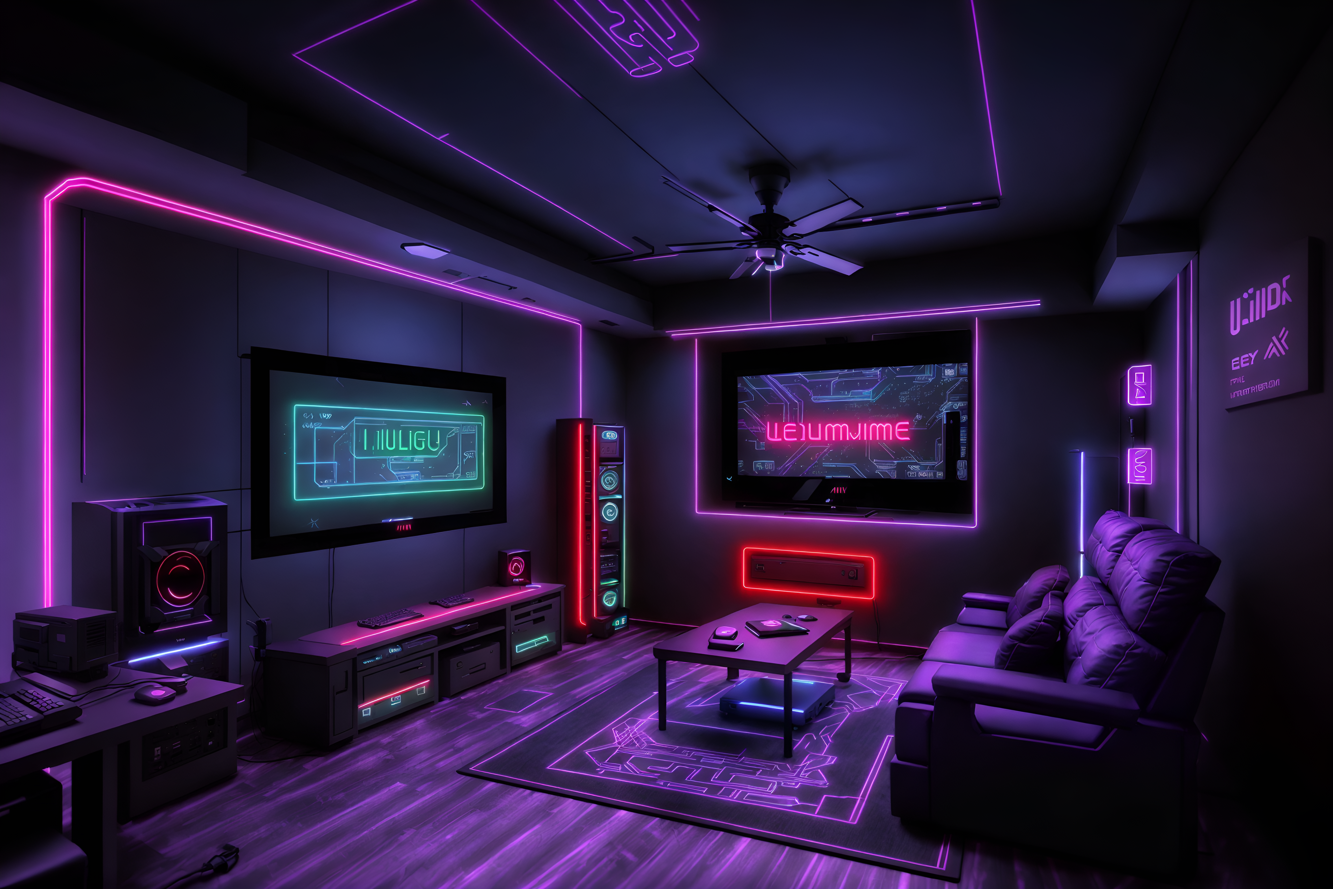 gaming room interiorsinterior decorate this drop zone with gaming room style. . . with a bench and cabinets and storage drawers and shelves for shoes and wall hooks for coats and cubbies and high up storage and storage baskets. . with speakers and dark room and video game consoles and dark lit room and at night and neon letters on wall and dark walls and multiple displays. . .interior decorate this dance studio with gaming room style. . . with water bottles and wooden floor and exercise equipment and dance mats and music player and ballet barre and speaker and mirrors. . with computer desk with computer displays and keyboard and neon letters on wall and gaming chair and dark walls and dark room and video game consoles and at night and purple and red lights. . .interior decorate this outdoor garage with gaming room style. . . with canopy and roof solar panels and cars and carport and storage racks and carport roof and canopy. . with speakers and neon letters on wall and neon lights and gaming chair and dark walls and purple and red lights and purple, red and blue fade light and video game consoles. . .interior decorate this board game cafe with gaming room style. . . with cozy lighting and snacks and coffee cups and dice and playing cards and comfortable chairs and menu boards and board games. . with dark room and purple, red and blue fade light and gaming chair and dark walls and at night and computer desk with computer displays and keyboard and video game consoles and multiple displays. . .interior decorate this music stage with gaming room style. . . with guitar stands and backdrop and amplifiers and stage lights and sound mixing board and drum kit and stage monitors and cables. . with computer desk with computer displays and keyboard and multiple displays and dark walls and purple, red and blue fade light and gaming chair and video game consoles and neon lights and speakers. . .interior decorate this hotel room with gaming room style. . . with night light and mirror and bedside table or night stand and working desk with desk chair and accent chair and storage bench or ottoman and hotel bathroom and dresser closet. . with computer desk with computer displays and keyboard and neon letters on wall and multiple displays and dark lit room and purple, red and blue fade light and gaming chair and speakers and dark room. . .interior decorate this mudroom with gaming room style. . . with high up storage and shelves for shoes and wall hooks for coats and cubbies and storage baskets and cabinets and storage drawers and a bench. . with neon letters on wall and purple, red and blue fade light and dark lit room and at night and dark walls and computer desk with computer displays and keyboard and purple and red lights and speakers. . .interior decorate this library with gaming room style. . . with bookshelves and computer terminals and periodicals and quiet signs and reading tables and chairs and checkout desk and study lamps. . with purple, red and blue fade light and multiple displays and at night and purple and red lights and dark walls and gaming chair and neon letters on wall and dark room. . .interior decorate this airport lounge with gaming room style. . . with charging stations and refreshment bar and comfortable seating and luggage storage and newspapers and magazines and television screens and flight information displays. . with neon lights and at night and computer desk with computer displays and keyboard and dark walls and dark lit room and multiple displays and video game consoles and purple and red lights. . .