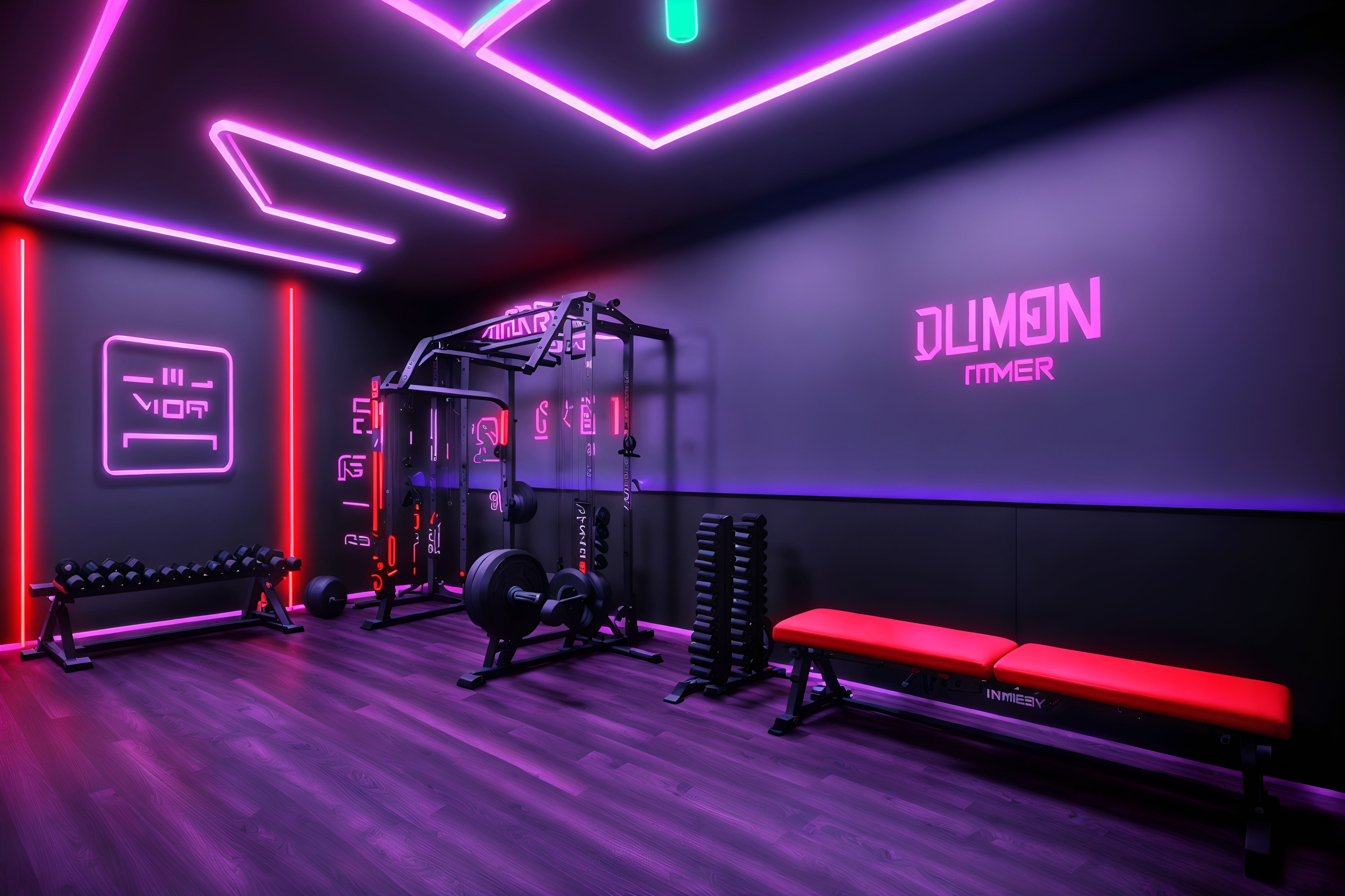 photo from pinterest of gaming room-style interior designed (fitness gym interior) with dumbbell stand and bench press and squat rack and crosstrainer and exercise bicycle and dumbbell stand. . with neon letters on wall and neon lights and purple, red and blue fade light and speakers and dark room and dark walls and multiple displays and purple and red lights. . cinematic photo, highly detailed, cinematic lighting, ultra-detailed, ultrarealistic, photorealism, 8k. trending on pinterest. gaming room interior design style. masterpiece, cinematic light, ultrarealistic+, photorealistic+, 8k, raw photo, realistic, sharp focus on eyes, (symmetrical eyes), (intact eyes), hyperrealistic, highest quality, best quality, , highly detailed, masterpiece, best quality, extremely detailed 8k wallpaper, masterpiece, best quality, ultra-detailed, best shadow, detailed background, detailed face, detailed eyes, high contrast, best illumination, detailed face, dulux, caustic, dynamic angle, detailed glow. dramatic lighting. highly detailed, insanely detailed hair, symmetrical, intricate details, professionally retouched, 8k high definition. strong bokeh. award winning photo.