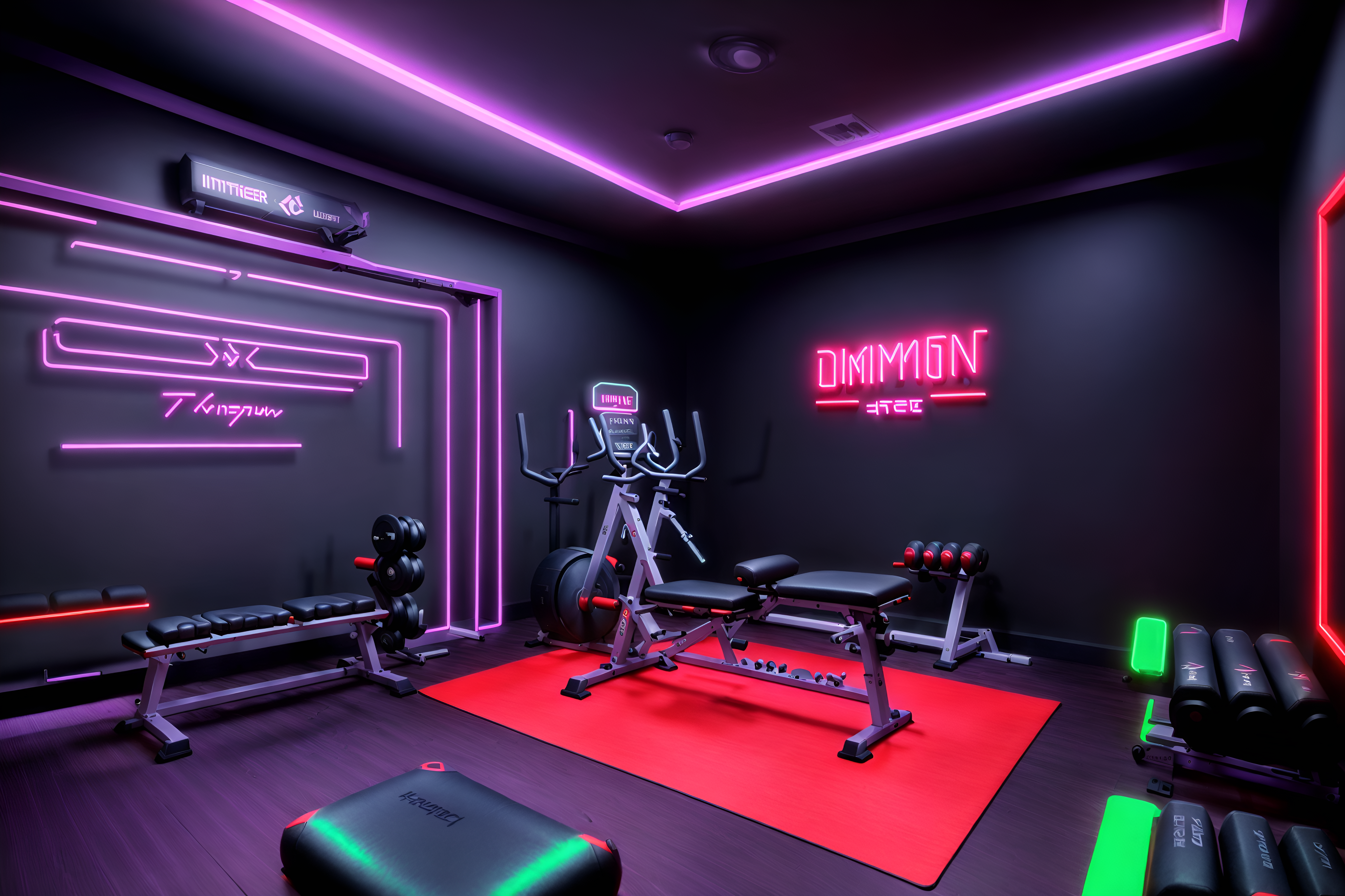 photo from pinterest of gaming room-style interior designed (fitness gym interior) with dumbbell stand and bench press and squat rack and crosstrainer and exercise bicycle and dumbbell stand. . with neon letters on wall and neon lights and purple, red and blue fade light and speakers and dark room and dark walls and multiple displays and purple and red lights. . cinematic photo, highly detailed, cinematic lighting, ultra-detailed, ultrarealistic, photorealism, 8k. trending on pinterest. gaming room interior design style. masterpiece, cinematic light, ultrarealistic+, photorealistic+, 8k, raw photo, realistic, sharp focus on eyes, (symmetrical eyes), (intact eyes), hyperrealistic, highest quality, best quality, , highly detailed, masterpiece, best quality, extremely detailed 8k wallpaper, masterpiece, best quality, ultra-detailed, best shadow, detailed background, detailed face, detailed eyes, high contrast, best illumination, detailed face, dulux, caustic, dynamic angle, detailed glow. dramatic lighting. highly detailed, insanely detailed hair, symmetrical, intricate details, professionally retouched, 8k high definition. strong bokeh. award winning photo.