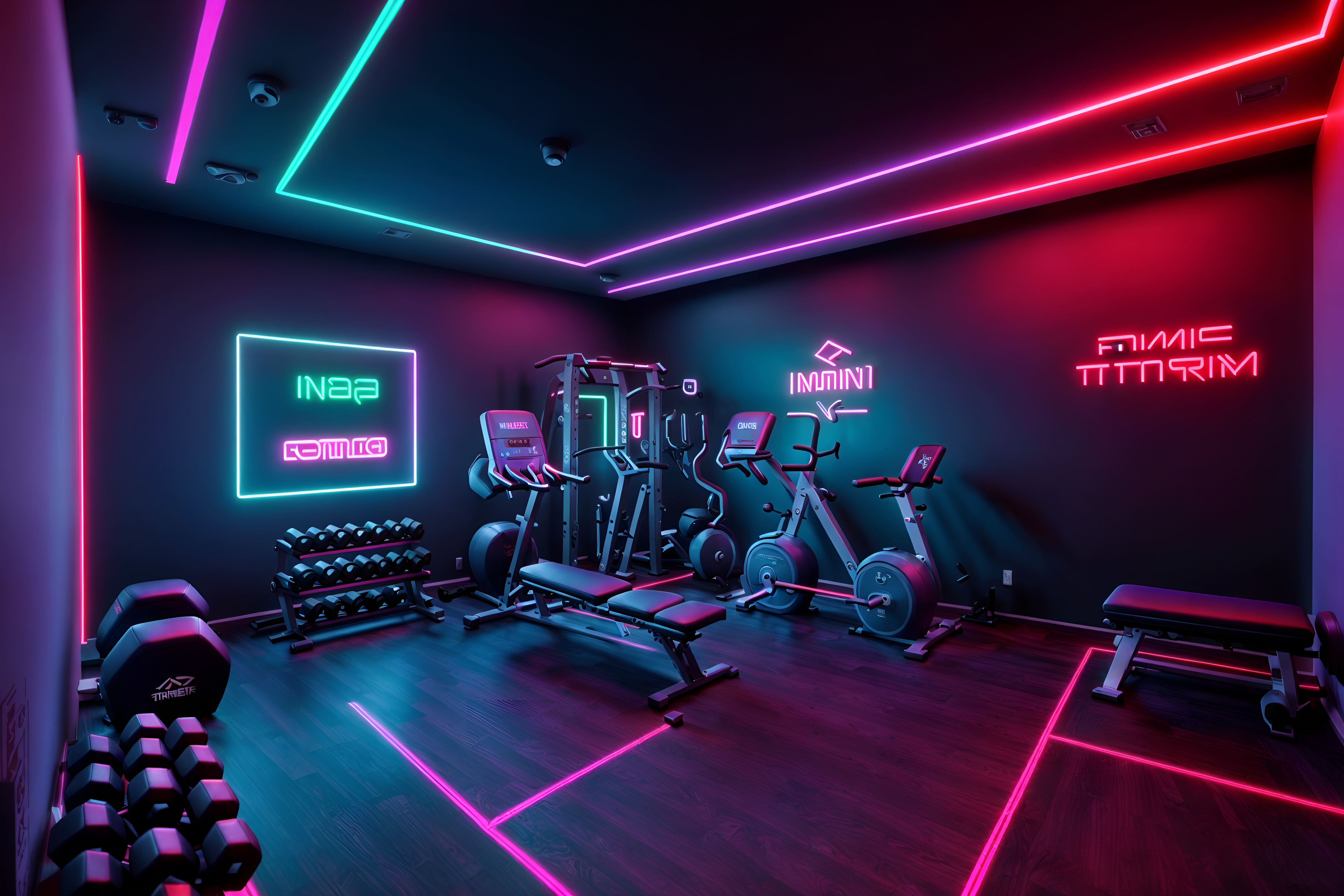 photo from pinterest of gaming room-style interior designed (fitness gym interior) with dumbbell stand and bench press and squat rack and crosstrainer and exercise bicycle and dumbbell stand. . with neon letters on wall and neon lights and purple, red and blue fade light and speakers and dark room and dark walls and multiple displays and purple and red lights. . cinematic photo, highly detailed, cinematic lighting, ultra-detailed, ultrarealistic, photorealism, 8k. trending on pinterest. gaming room interior design style. masterpiece, cinematic light, ultrarealistic+, photorealistic+, 8k, raw photo, realistic, sharp focus on eyes, (symmetrical eyes), (intact eyes), hyperrealistic, highest quality, best quality, , highly detailed, masterpiece, best quality, extremely detailed 8k wallpaper, masterpiece, best quality, ultra-detailed, best shadow, detailed background, detailed face, detailed eyes, high contrast, best illumination, detailed face, dulux, caustic, dynamic angle, detailed glow. dramatic lighting. highly detailed, insanely detailed hair, symmetrical, intricate details, professionally retouched, 8k high definition. strong bokeh. award winning photo.
