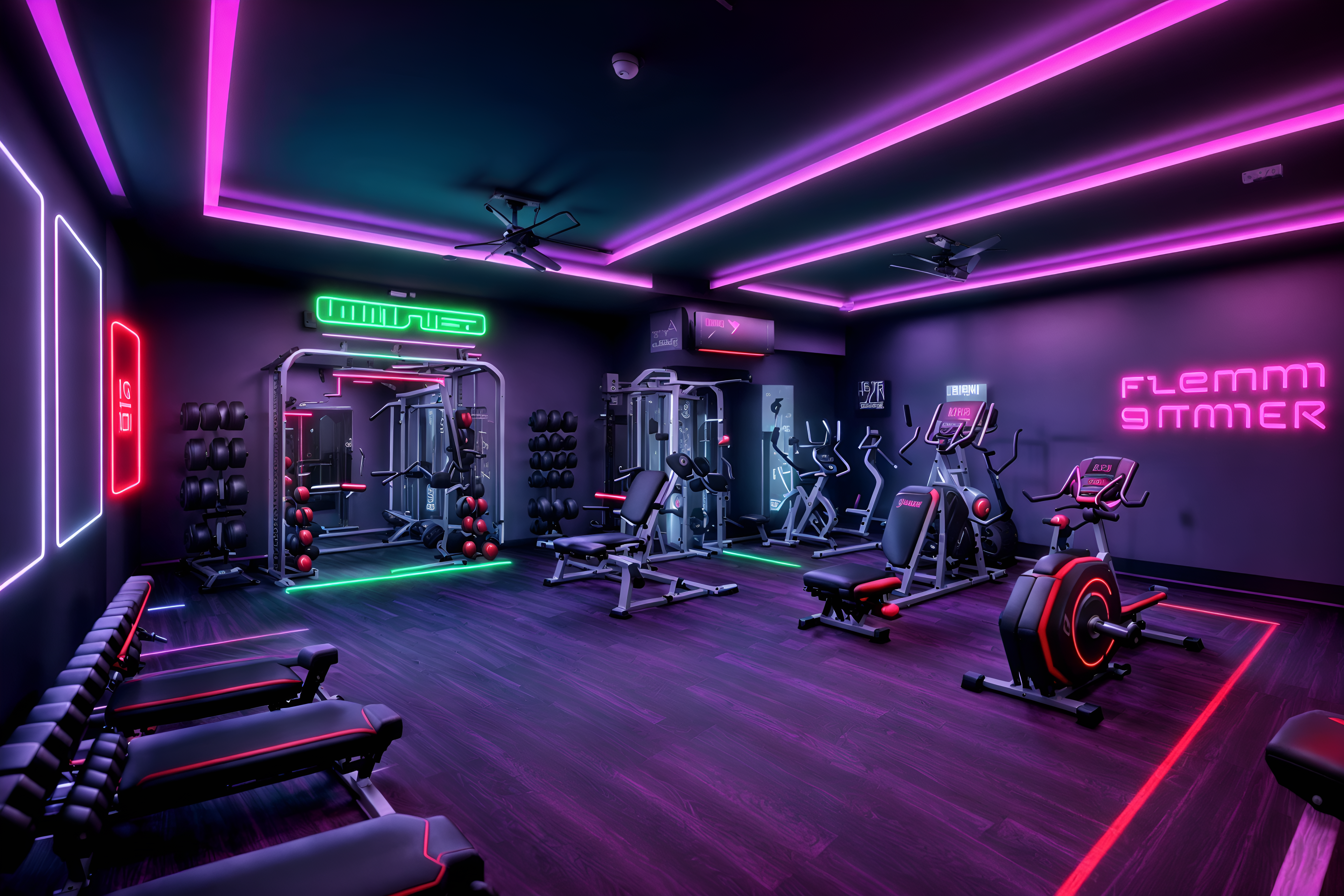 gaming room gymsinterior decorate this fitness gym with gaming room style. . . with exercise bicycle and bench press and dumbbell stand and squat rack and crosstrainer and exercise bicycle. . with gaming chair and video game consoles and computer desk with computer displays and keyboard and speakers and dark room and purple and red lights and neon lights and dark lit room. . .