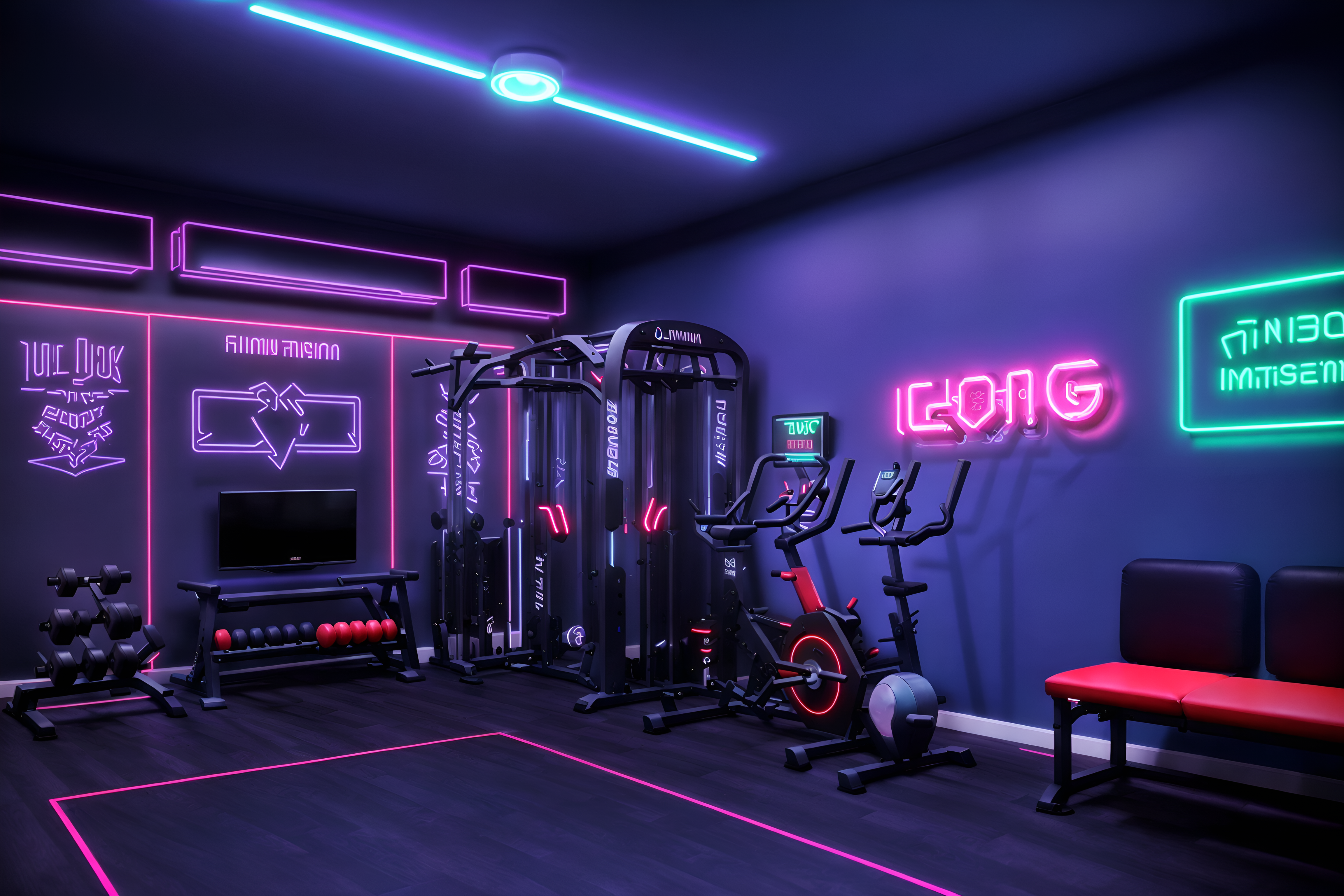 photo from pinterest of gaming room-style interior designed (fitness gym interior) with dumbbell stand and bench press and squat rack and crosstrainer and exercise bicycle and dumbbell stand. . with neon letters on wall and neon lights and purple, red and blue fade light and speakers and dark room and dark walls and multiple displays and purple and red lights. . cinematic photo, highly detailed, cinematic lighting, ultra-detailed, ultrarealistic, photorealism, 8k. trending on pinterest. gaming room interior design style. masterpiece, cinematic light, ultrarealistic+, photorealistic+, 8k, raw photo, realistic, sharp focus on eyes, (symmetrical eyes), (intact eyes), hyperrealistic, highest quality, best quality, , highly detailed, masterpiece, best quality, extremely detailed 8k wallpaper, masterpiece, best quality, ultra-detailed, best shadow, detailed background, detailed face, detailed eyes, high contrast, best illumination, detailed face, dulux, caustic, dynamic angle, detailed glow. dramatic lighting. highly detailed, insanely detailed hair, symmetrical, intricate details, professionally retouched, 8k high definition. strong bokeh. award winning photo.