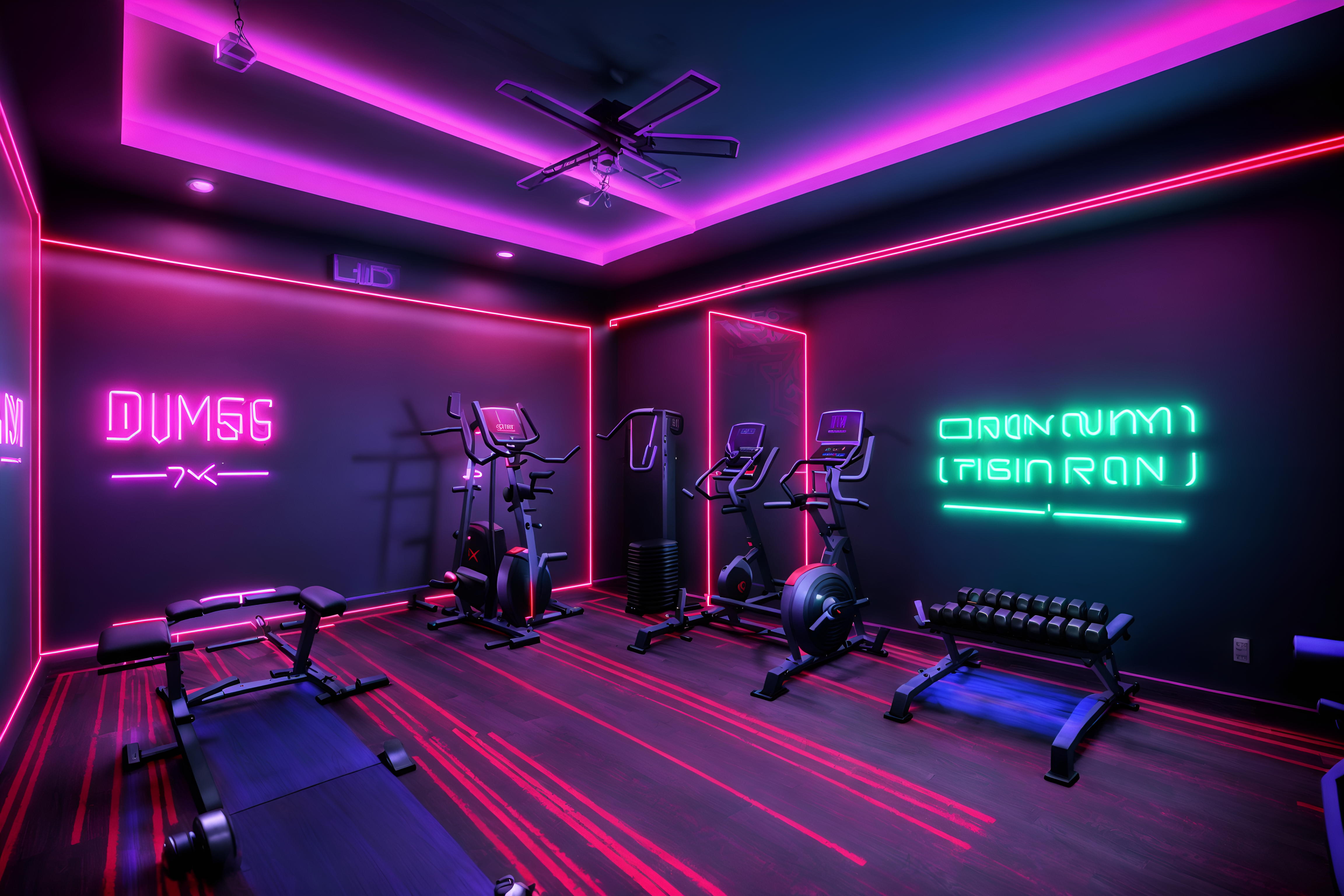 photo from pinterest of gaming room-style interior designed (fitness gym interior) with dumbbell stand and bench press and squat rack and crosstrainer and exercise bicycle and dumbbell stand. . with neon letters on wall and neon lights and purple, red and blue fade light and speakers and dark room and dark walls and multiple displays and purple and red lights. . cinematic photo, highly detailed, cinematic lighting, ultra-detailed, ultrarealistic, photorealism, 8k. trending on pinterest. gaming room interior design style. masterpiece, cinematic light, ultrarealistic+, photorealistic+, 8k, raw photo, realistic, sharp focus on eyes, (symmetrical eyes), (intact eyes), hyperrealistic, highest quality, best quality, , highly detailed, masterpiece, best quality, extremely detailed 8k wallpaper, masterpiece, best quality, ultra-detailed, best shadow, detailed background, detailed face, detailed eyes, high contrast, best illumination, detailed face, dulux, caustic, dynamic angle, detailed glow. dramatic lighting. highly detailed, insanely detailed hair, symmetrical, intricate details, professionally retouched, 8k high definition. strong bokeh. award winning photo.