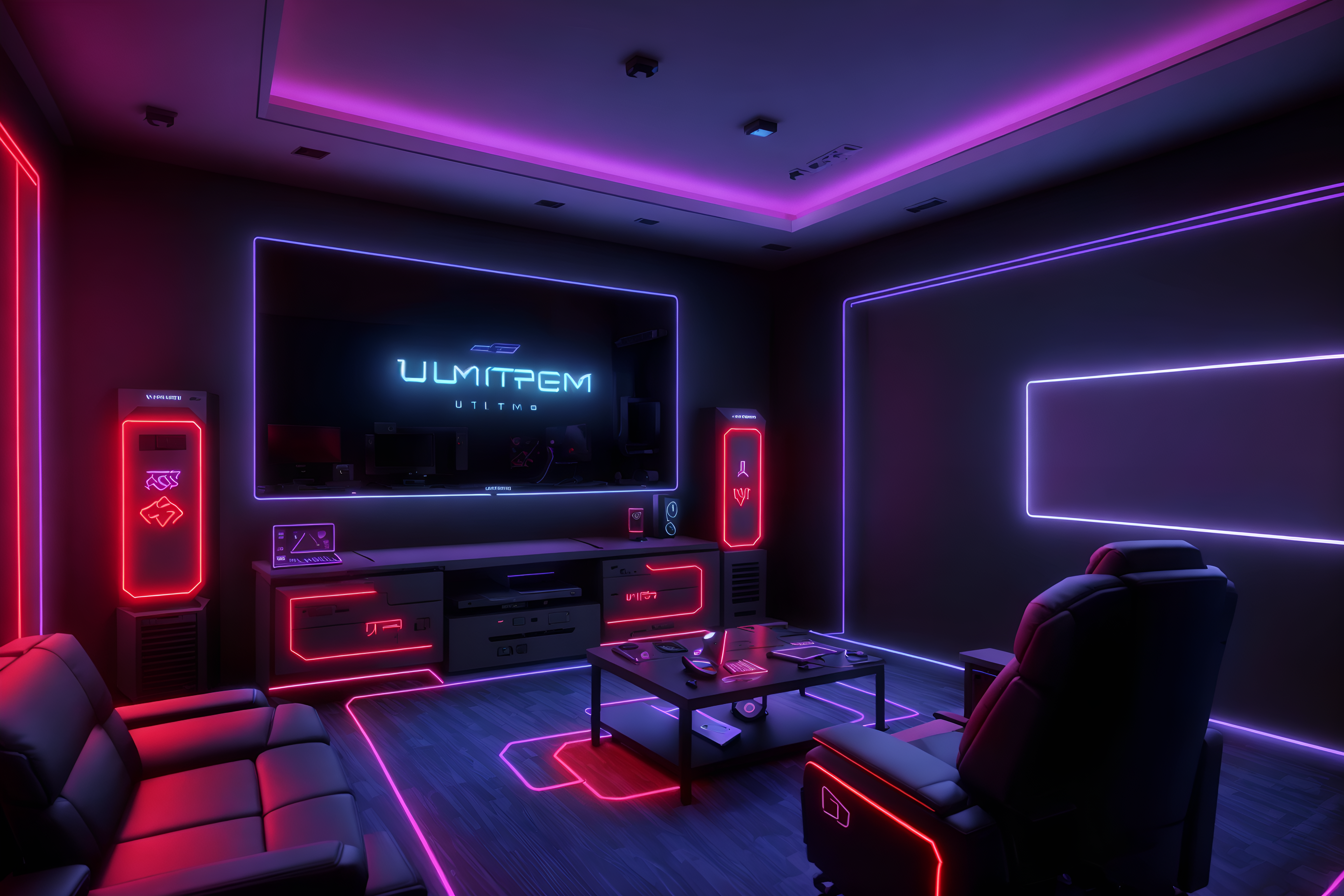 gaming room gaming roomsinterior decorate this gaming room with gaming room style. . . . with gaming chair and at night and neon letters on wall and computer desk with computer displays and keyboard and dark walls and speakers and neon lights and purple and red lights. . .