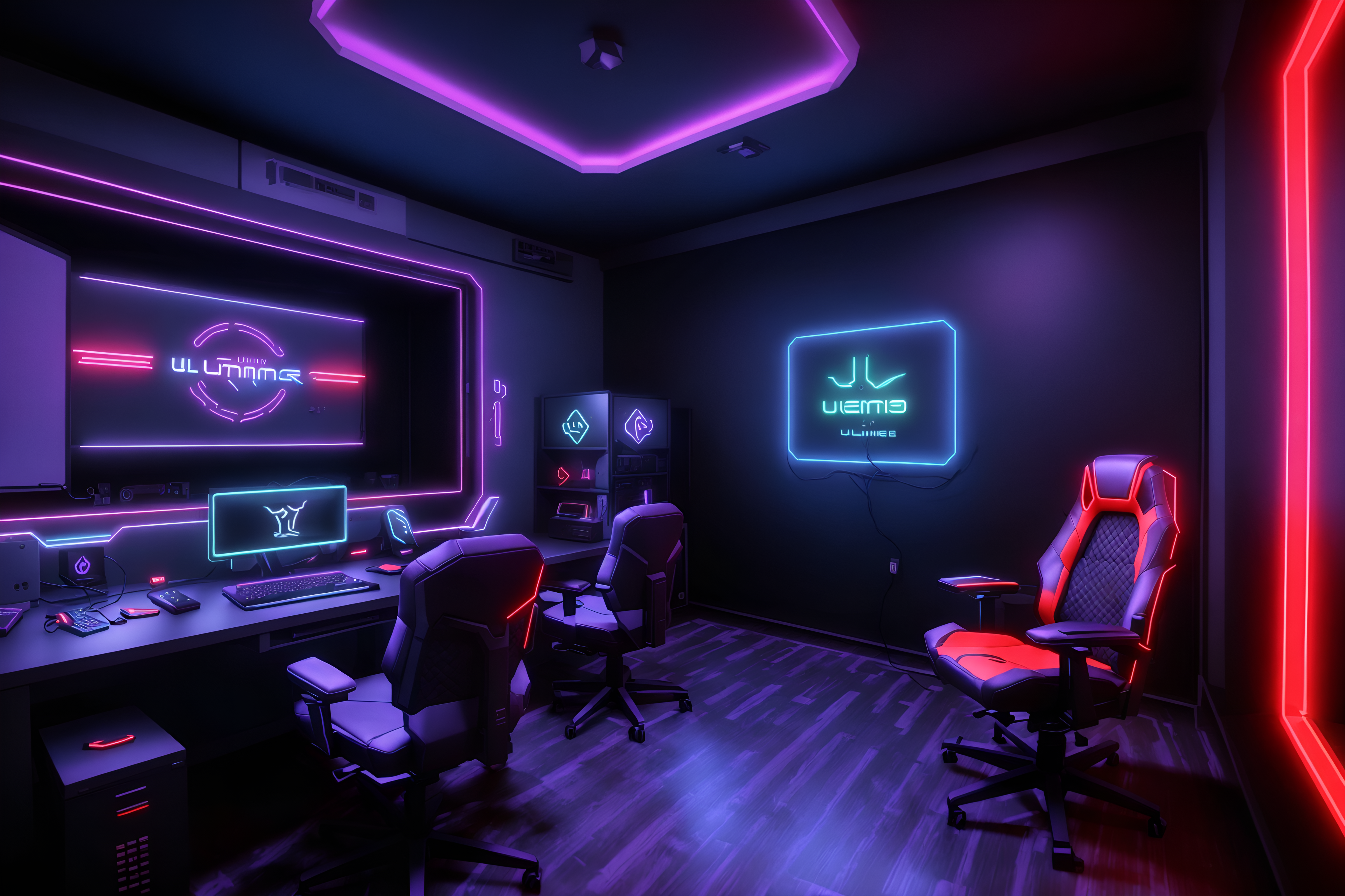 gaming room gaming roomsinterior decorate this gaming room with gaming room style. . . . with gaming chair and at night and neon letters on wall and computer desk with computer displays and keyboard and dark walls and speakers and neon lights and purple and red lights. . .