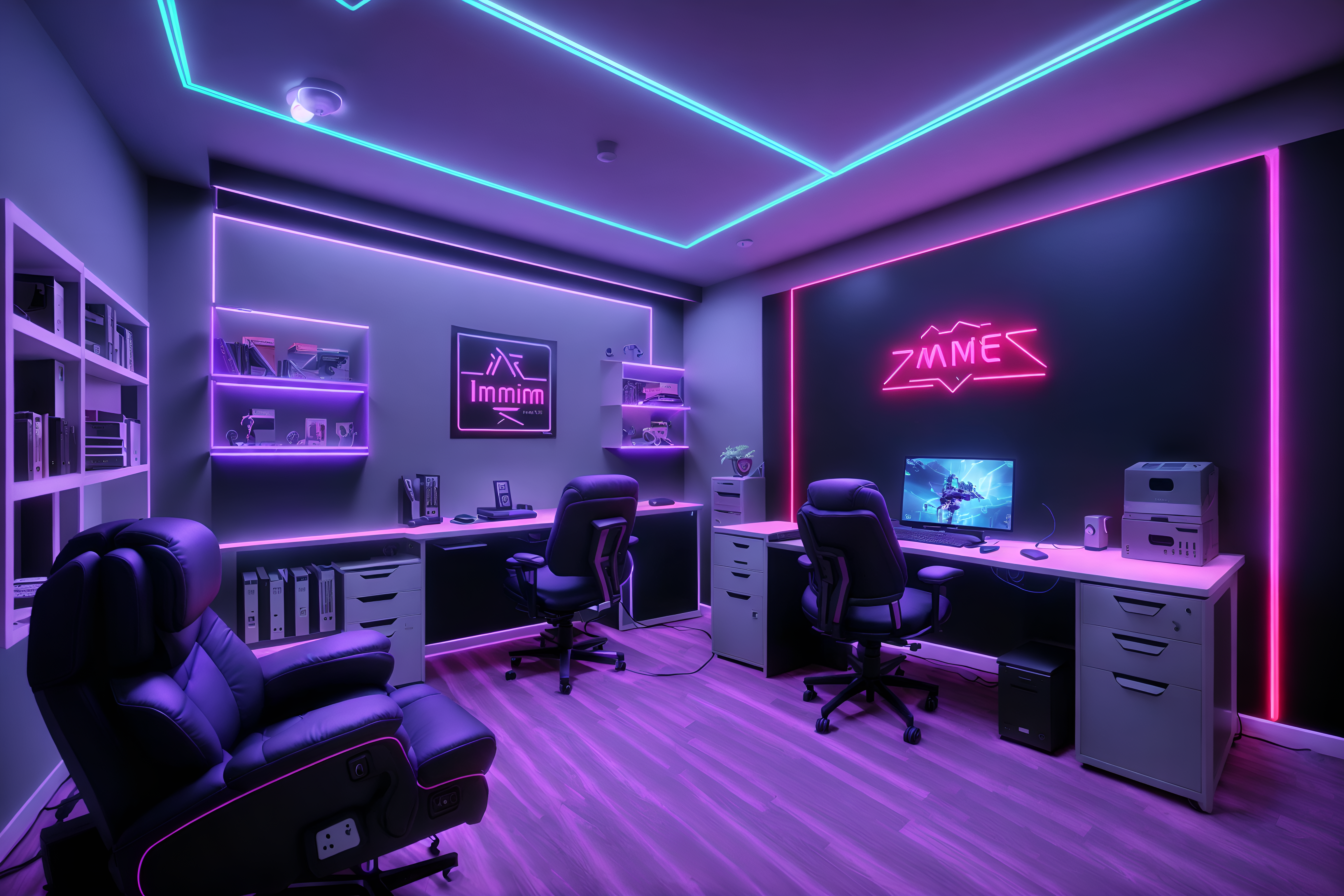 photo from pinterest of gaming room-style interior designed (home office interior) with cabinets and computer desk and plant and desk lamp and office chair and cabinets. . with gaming chair and purple, red and blue fade light and at night and speakers and dark walls and computer desk with computer displays and keyboard and neon letters on wall and neon lights. . cinematic photo, highly detailed, cinematic lighting, ultra-detailed, ultrarealistic, photorealism, 8k. trending on pinterest. gaming room interior design style. masterpiece, cinematic light, ultrarealistic+, photorealistic+, 8k, raw photo, realistic, sharp focus on eyes, (symmetrical eyes), (intact eyes), hyperrealistic, highest quality, best quality, , highly detailed, masterpiece, best quality, extremely detailed 8k wallpaper, masterpiece, best quality, ultra-detailed, best shadow, detailed background, detailed face, detailed eyes, high contrast, best illumination, detailed face, dulux, caustic, dynamic angle, detailed glow. dramatic lighting. highly detailed, insanely detailed hair, symmetrical, intricate details, professionally retouched, 8k high definition. strong bokeh. award winning photo.