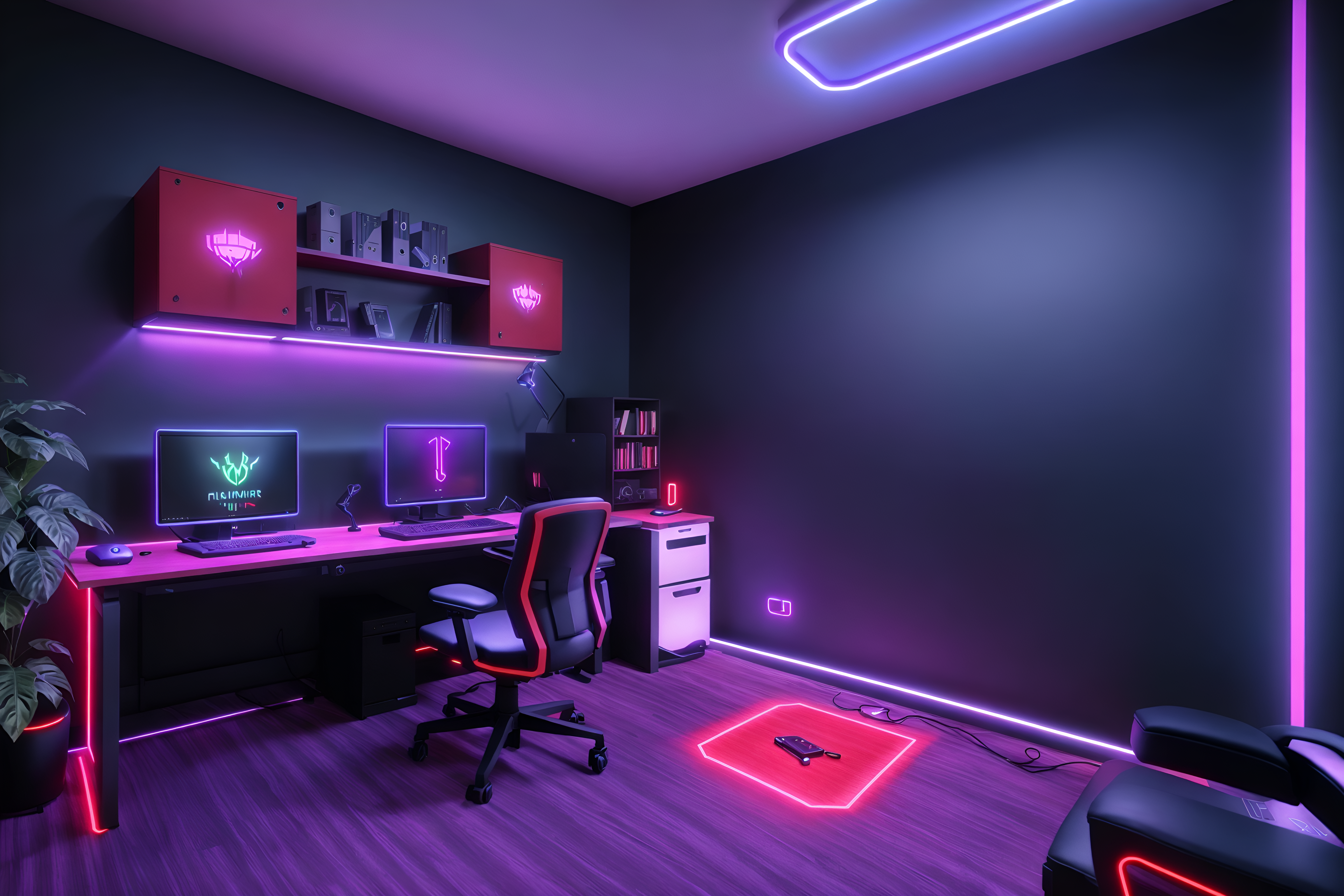 photo from pinterest of gaming room-style interior designed (home office interior) with cabinets and computer desk and plant and desk lamp and office chair and cabinets. . with gaming chair and purple, red and blue fade light and at night and speakers and dark walls and computer desk with computer displays and keyboard and neon letters on wall and neon lights. . cinematic photo, highly detailed, cinematic lighting, ultra-detailed, ultrarealistic, photorealism, 8k. trending on pinterest. gaming room interior design style. masterpiece, cinematic light, ultrarealistic+, photorealistic+, 8k, raw photo, realistic, sharp focus on eyes, (symmetrical eyes), (intact eyes), hyperrealistic, highest quality, best quality, , highly detailed, masterpiece, best quality, extremely detailed 8k wallpaper, masterpiece, best quality, ultra-detailed, best shadow, detailed background, detailed face, detailed eyes, high contrast, best illumination, detailed face, dulux, caustic, dynamic angle, detailed glow. dramatic lighting. highly detailed, insanely detailed hair, symmetrical, intricate details, professionally retouched, 8k high definition. strong bokeh. award winning photo.