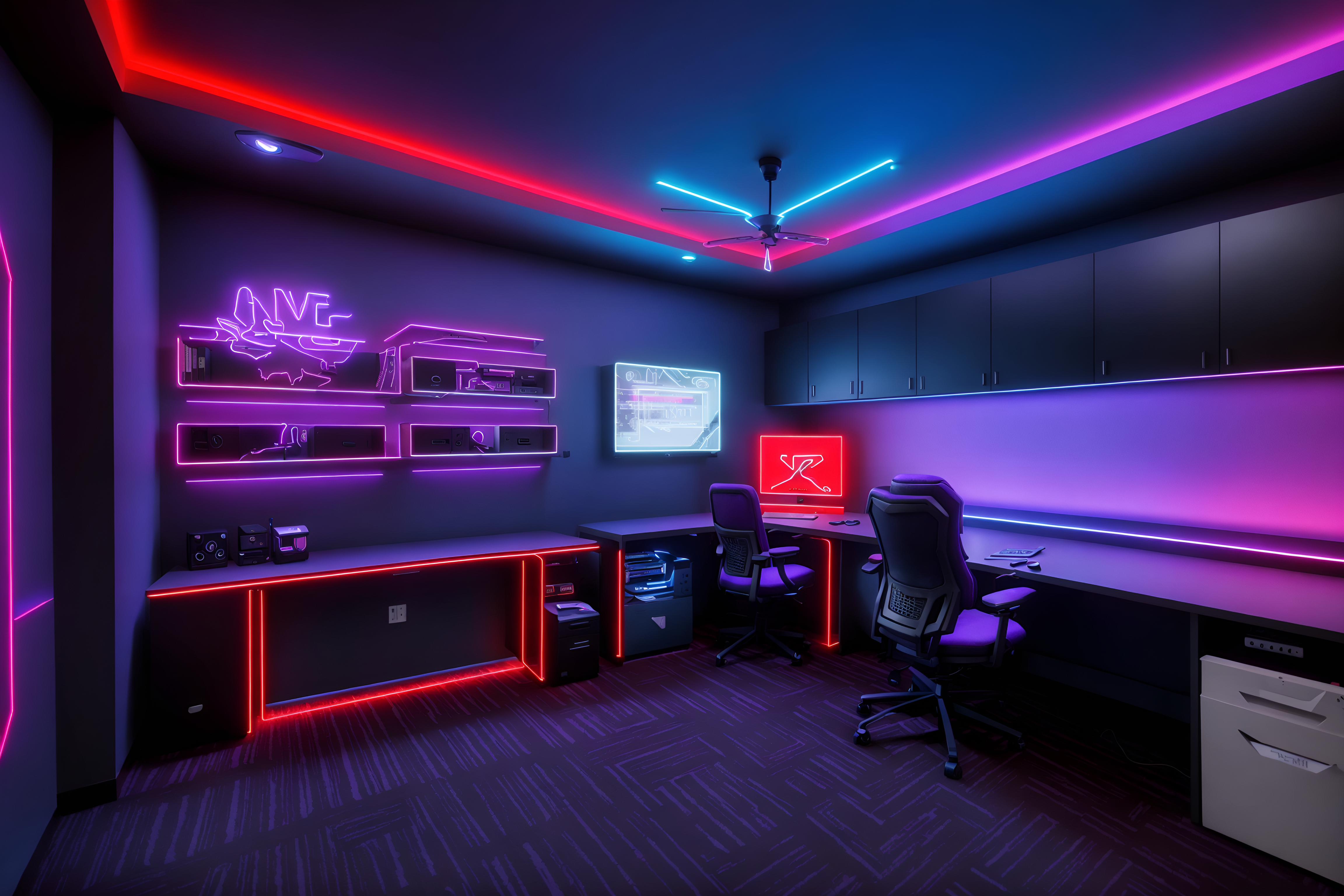 gaming room home officesinterior decorate this home office with gaming room style. . . with cabinets and plant and computer desk and office chair and desk lamp and cabinets. . with video game consoles and neon lights and dark room and dark lit room and purple and red lights and at night and speakers and neon letters on wall. . .