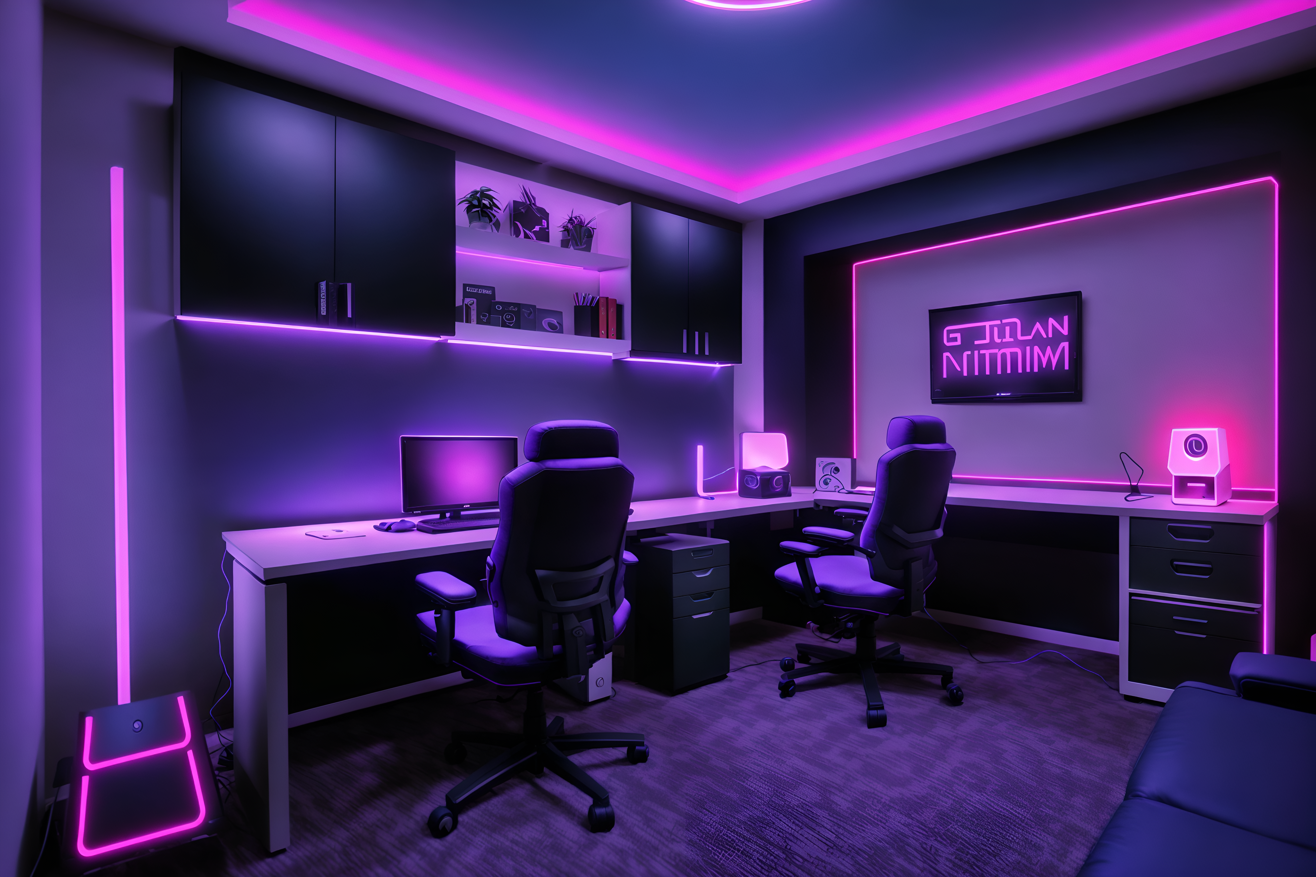 gaming room home officesinterior decorate this home office with gaming room style. . . with cabinets and plant and computer desk and office chair and desk lamp and cabinets. . with video game consoles and neon lights and dark room and dark lit room and purple and red lights and at night and speakers and neon letters on wall. . .