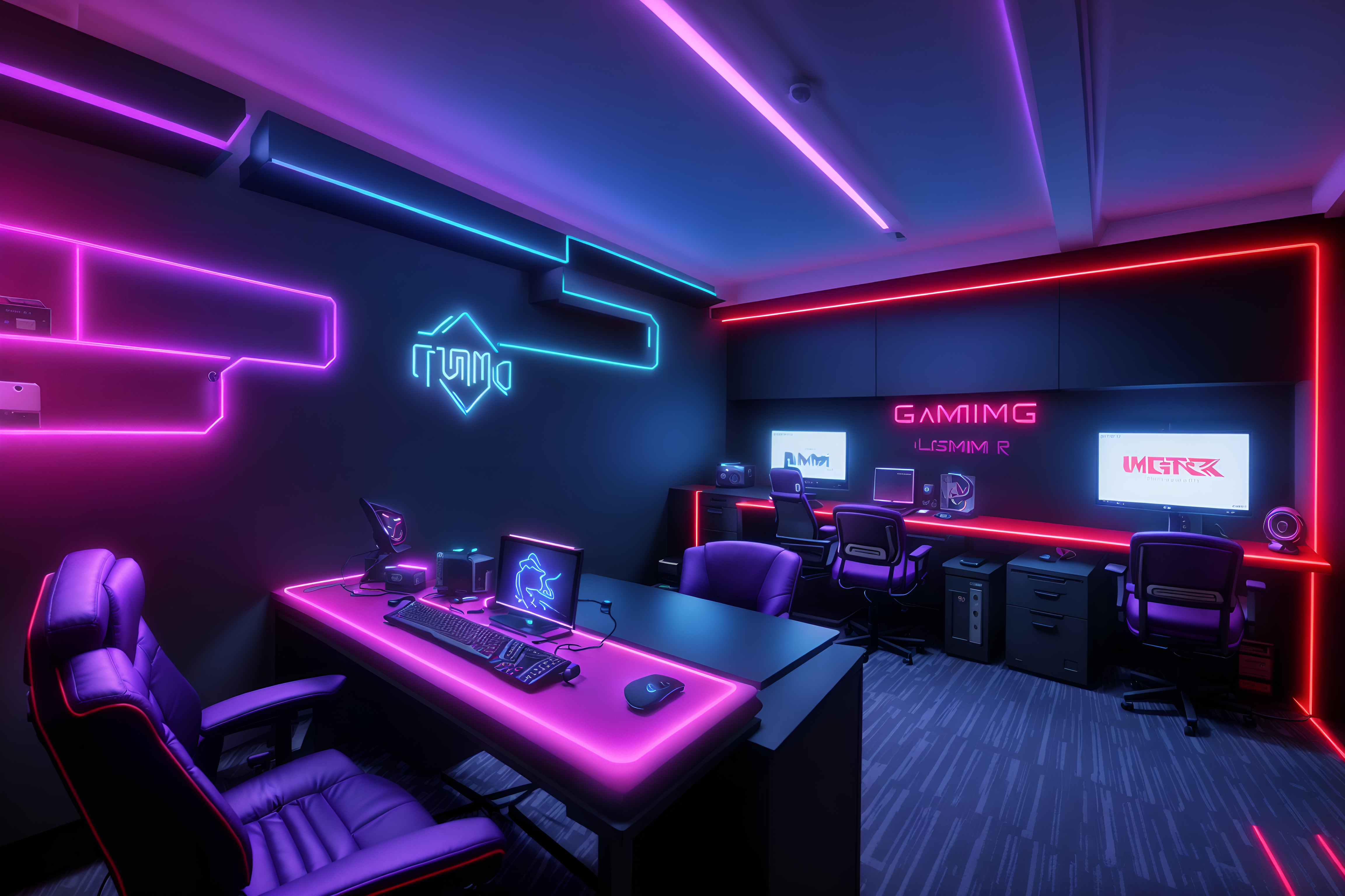 photo from pinterest of gaming room-style interior designed (home office interior) with cabinets and computer desk and plant and desk lamp and office chair and cabinets. . with gaming chair and purple, red and blue fade light and at night and speakers and dark walls and computer desk with computer displays and keyboard and neon letters on wall and neon lights. . cinematic photo, highly detailed, cinematic lighting, ultra-detailed, ultrarealistic, photorealism, 8k. trending on pinterest. gaming room interior design style. masterpiece, cinematic light, ultrarealistic+, photorealistic+, 8k, raw photo, realistic, sharp focus on eyes, (symmetrical eyes), (intact eyes), hyperrealistic, highest quality, best quality, , highly detailed, masterpiece, best quality, extremely detailed 8k wallpaper, masterpiece, best quality, ultra-detailed, best shadow, detailed background, detailed face, detailed eyes, high contrast, best illumination, detailed face, dulux, caustic, dynamic angle, detailed glow. dramatic lighting. highly detailed, insanely detailed hair, symmetrical, intricate details, professionally retouched, 8k high definition. strong bokeh. award winning photo.