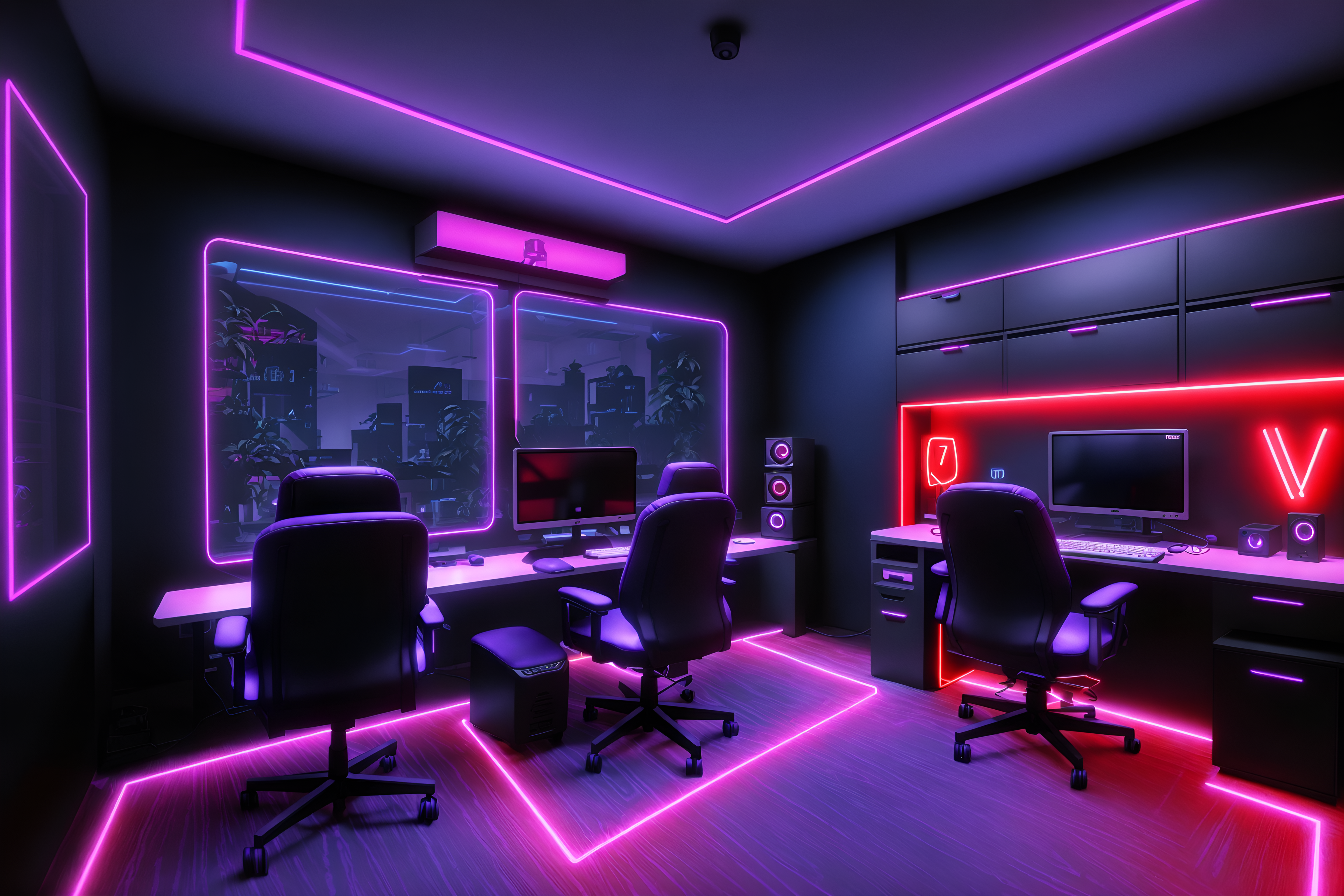 photo from pinterest of gaming room-style interior designed (home office interior) with cabinets and computer desk and plant and desk lamp and office chair and cabinets. . with gaming chair and purple, red and blue fade light and at night and speakers and dark walls and computer desk with computer displays and keyboard and neon letters on wall and neon lights. . cinematic photo, highly detailed, cinematic lighting, ultra-detailed, ultrarealistic, photorealism, 8k. trending on pinterest. gaming room interior design style. masterpiece, cinematic light, ultrarealistic+, photorealistic+, 8k, raw photo, realistic, sharp focus on eyes, (symmetrical eyes), (intact eyes), hyperrealistic, highest quality, best quality, , highly detailed, masterpiece, best quality, extremely detailed 8k wallpaper, masterpiece, best quality, ultra-detailed, best shadow, detailed background, detailed face, detailed eyes, high contrast, best illumination, detailed face, dulux, caustic, dynamic angle, detailed glow. dramatic lighting. highly detailed, insanely detailed hair, symmetrical, intricate details, professionally retouched, 8k high definition. strong bokeh. award winning photo.