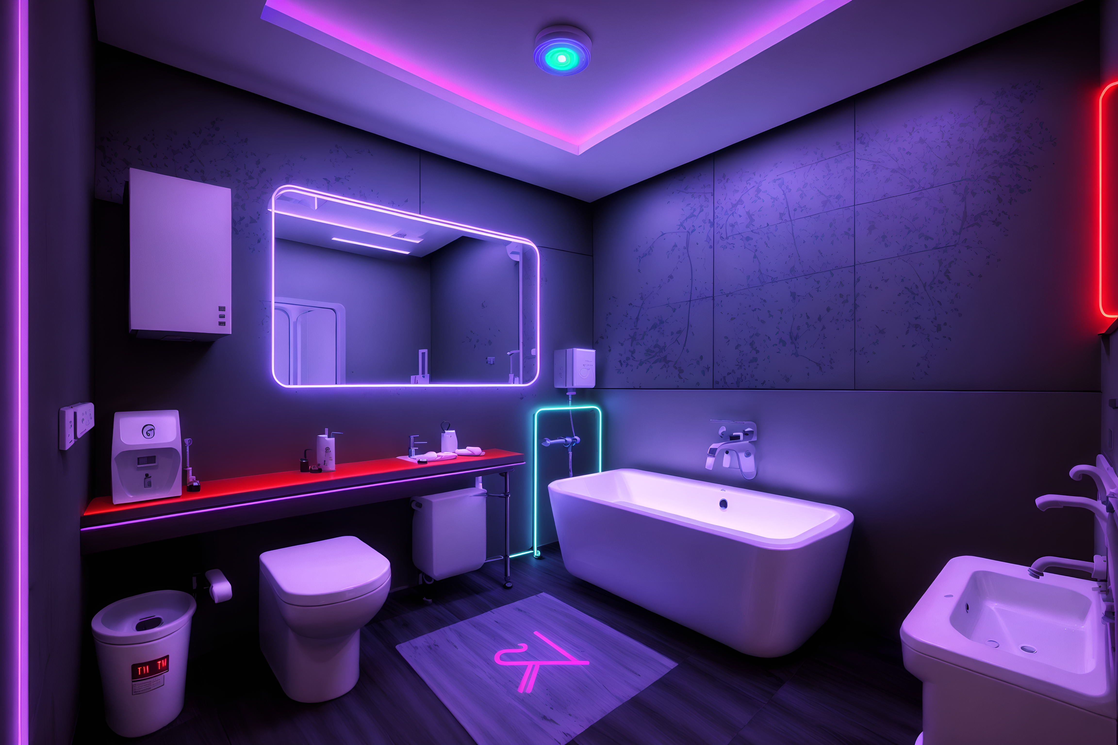 photo from pinterest of gaming room-style interior designed (hotel bathroom interior) with bathroom sink with faucet and toilet seat and waste basket and bath rail and bathtub and shower and bathroom cabinet and plant. . with at night and dark walls and neon letters on wall and purple, red and blue fade light and computer desk with computer displays and keyboard and neon lights and speakers and dark room. . cinematic photo, highly detailed, cinematic lighting, ultra-detailed, ultrarealistic, photorealism, 8k. trending on pinterest. gaming room interior design style. masterpiece, cinematic light, ultrarealistic+, photorealistic+, 8k, raw photo, realistic, sharp focus on eyes, (symmetrical eyes), (intact eyes), hyperrealistic, highest quality, best quality, , highly detailed, masterpiece, best quality, extremely detailed 8k wallpaper, masterpiece, best quality, ultra-detailed, best shadow, detailed background, detailed face, detailed eyes, high contrast, best illumination, detailed face, dulux, caustic, dynamic angle, detailed glow. dramatic lighting. highly detailed, insanely detailed hair, symmetrical, intricate details, professionally retouched, 8k high definition. strong bokeh. award winning photo.