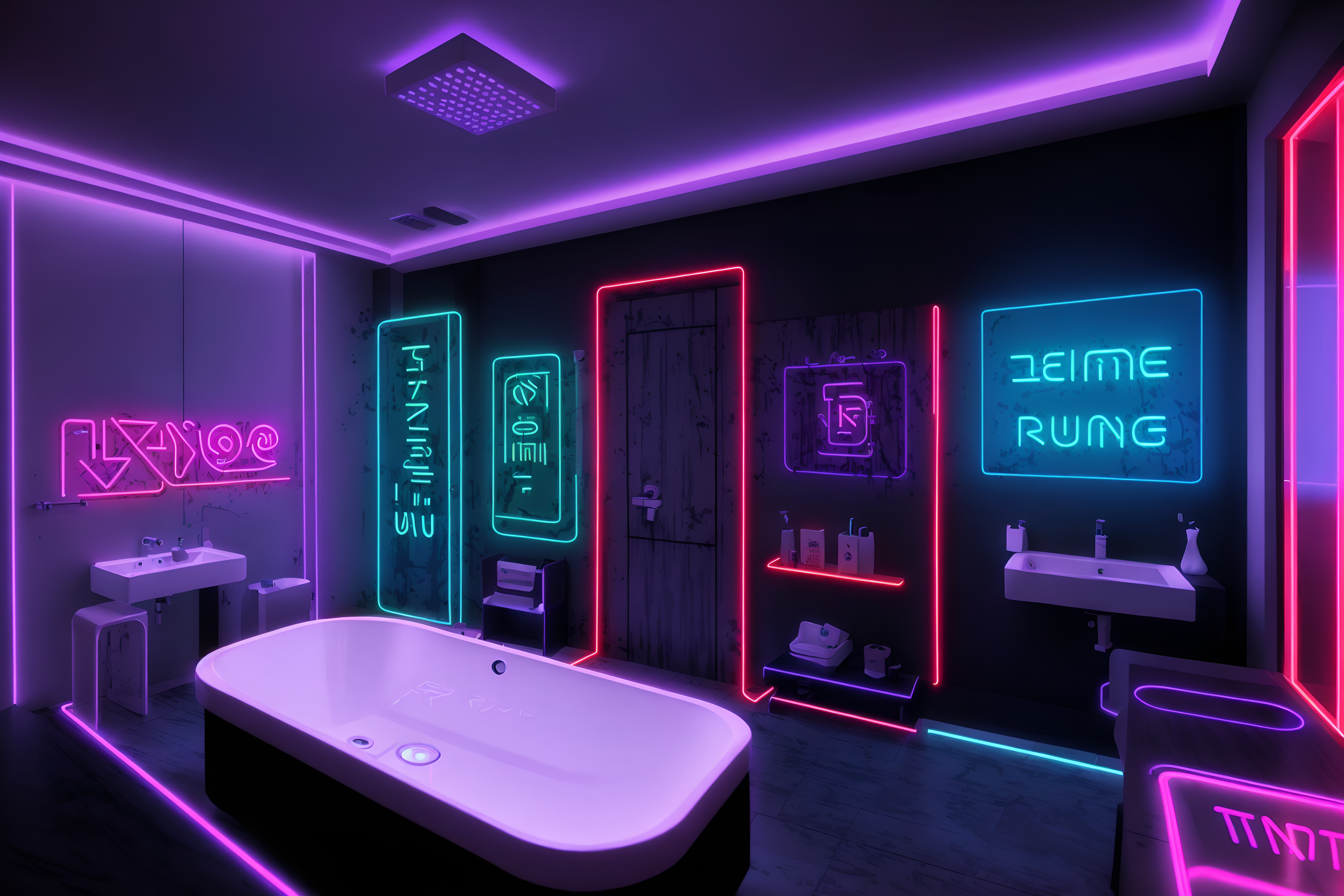 gaming room hotel bathroomsinterior decorate this hotel bathroom with gaming room style. . . with waste basket and bathroom cabinet and shower and toilet seat and bath rail and mirror and bath towel and bathtub. . with speakers and neon lights and purple and red lights and dark room and neon letters on wall and video game consoles and gaming chair and computer desk with computer displays and keyboard. . .