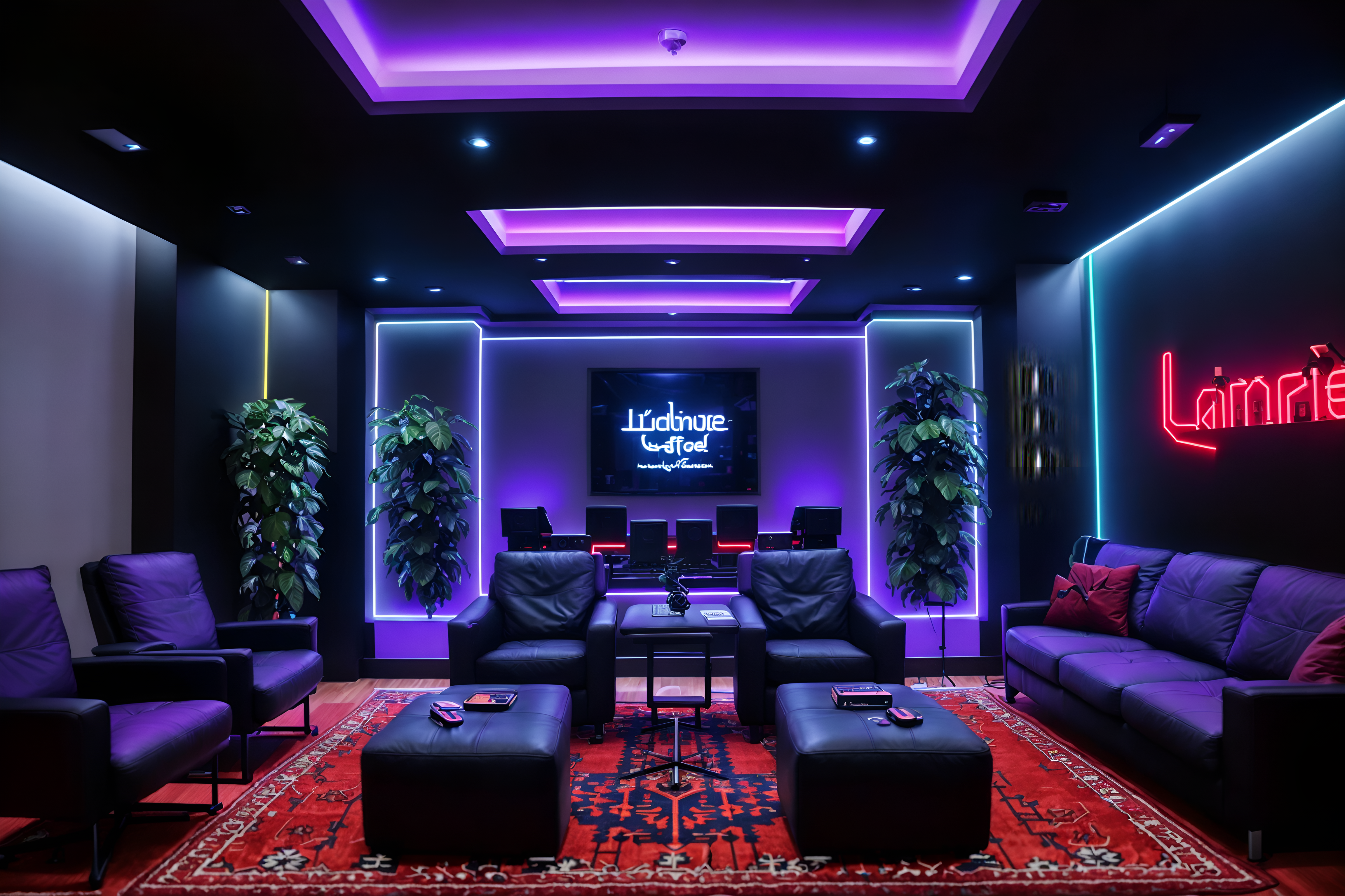photo from pinterest of gaming room-style interior designed (hotel lobby interior) with rug and furniture and hanging lamps and sofas and plant and check in desk and coffee tables and lounge chairs. . with dark walls and multiple displays and neon letters on wall and computer desk with computer displays and keyboard and gaming chair and purple, red and blue fade light and purple and red lights and speakers. . cinematic photo, highly detailed, cinematic lighting, ultra-detailed, ultrarealistic, photorealism, 8k. trending on pinterest. gaming room interior design style. masterpiece, cinematic light, ultrarealistic+, photorealistic+, 8k, raw photo, realistic, sharp focus on eyes, (symmetrical eyes), (intact eyes), hyperrealistic, highest quality, best quality, , highly detailed, masterpiece, best quality, extremely detailed 8k wallpaper, masterpiece, best quality, ultra-detailed, best shadow, detailed background, detailed face, detailed eyes, high contrast, best illumination, detailed face, dulux, caustic, dynamic angle, detailed glow. dramatic lighting. highly detailed, insanely detailed hair, symmetrical, intricate details, professionally retouched, 8k high definition. strong bokeh. award winning photo.
