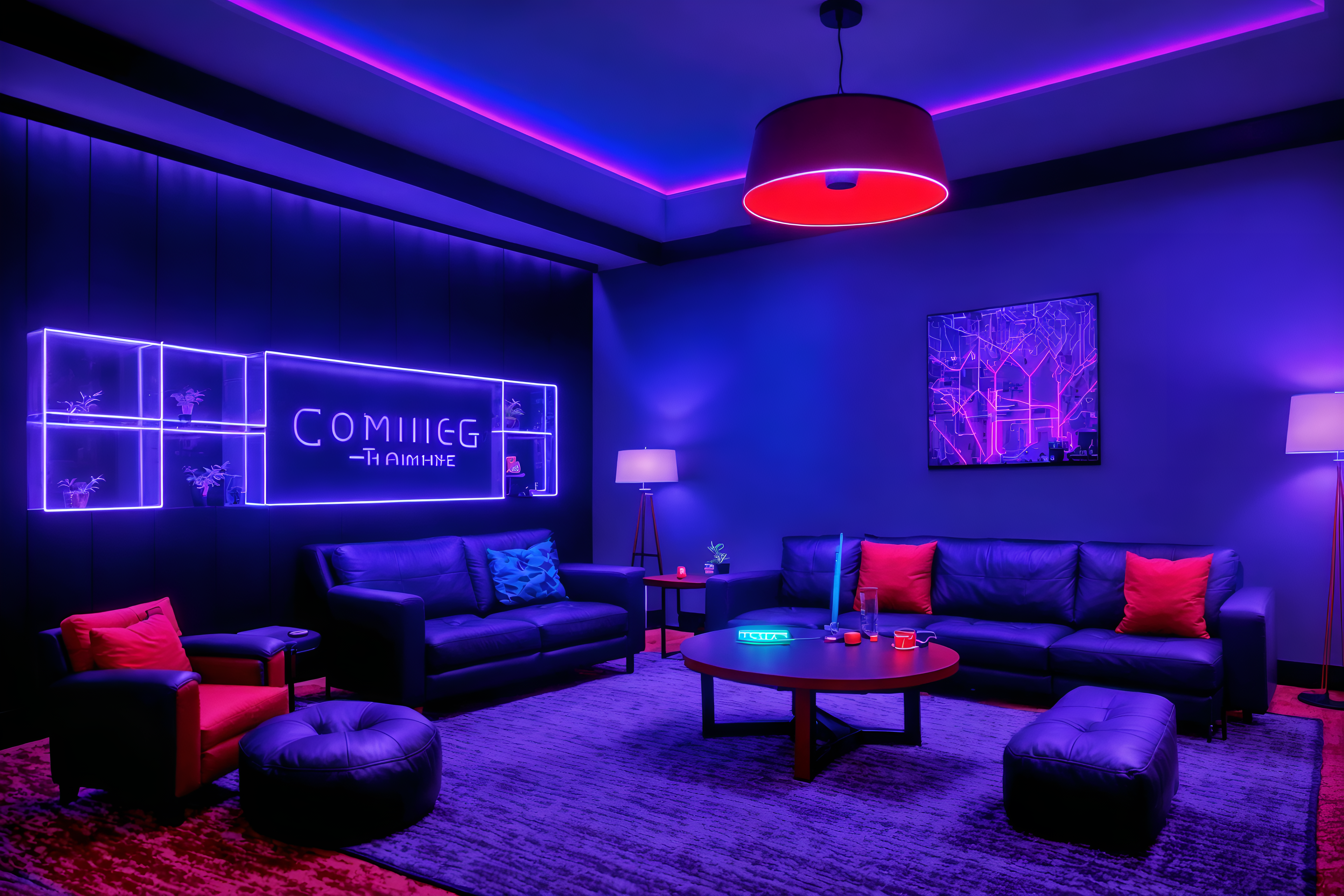 photo from pinterest of gaming room-style interior designed (hotel lobby interior) with rug and furniture and hanging lamps and sofas and plant and check in desk and coffee tables and lounge chairs. . with dark walls and multiple displays and neon letters on wall and computer desk with computer displays and keyboard and gaming chair and purple, red and blue fade light and purple and red lights and speakers. . cinematic photo, highly detailed, cinematic lighting, ultra-detailed, ultrarealistic, photorealism, 8k. trending on pinterest. gaming room interior design style. masterpiece, cinematic light, ultrarealistic+, photorealistic+, 8k, raw photo, realistic, sharp focus on eyes, (symmetrical eyes), (intact eyes), hyperrealistic, highest quality, best quality, , highly detailed, masterpiece, best quality, extremely detailed 8k wallpaper, masterpiece, best quality, ultra-detailed, best shadow, detailed background, detailed face, detailed eyes, high contrast, best illumination, detailed face, dulux, caustic, dynamic angle, detailed glow. dramatic lighting. highly detailed, insanely detailed hair, symmetrical, intricate details, professionally retouched, 8k high definition. strong bokeh. award winning photo.